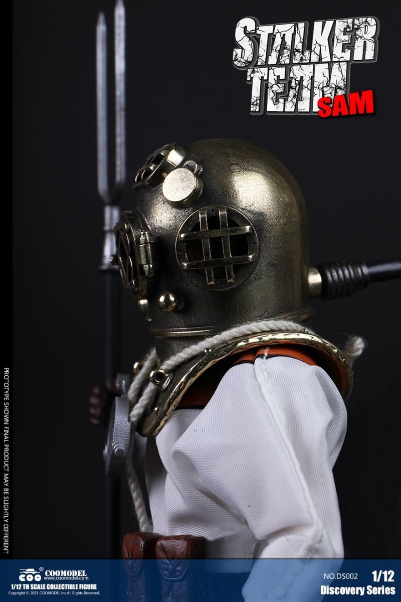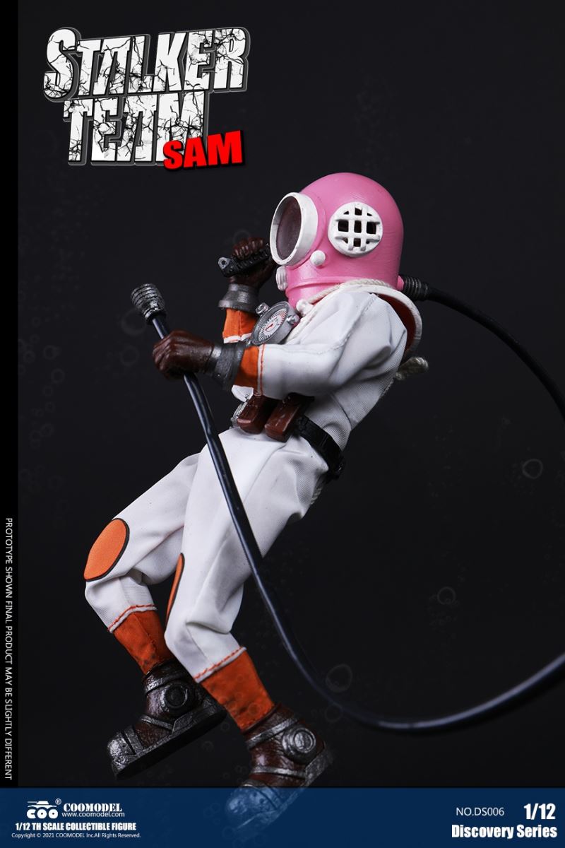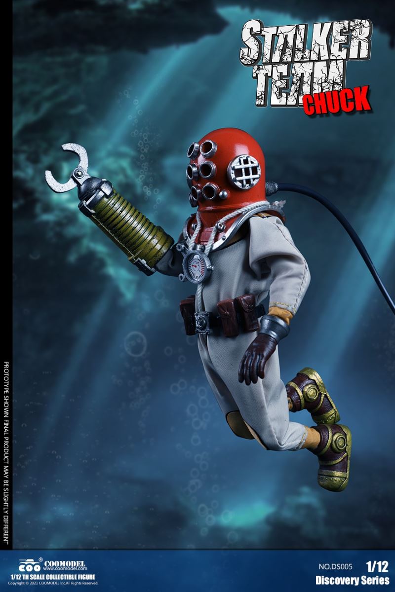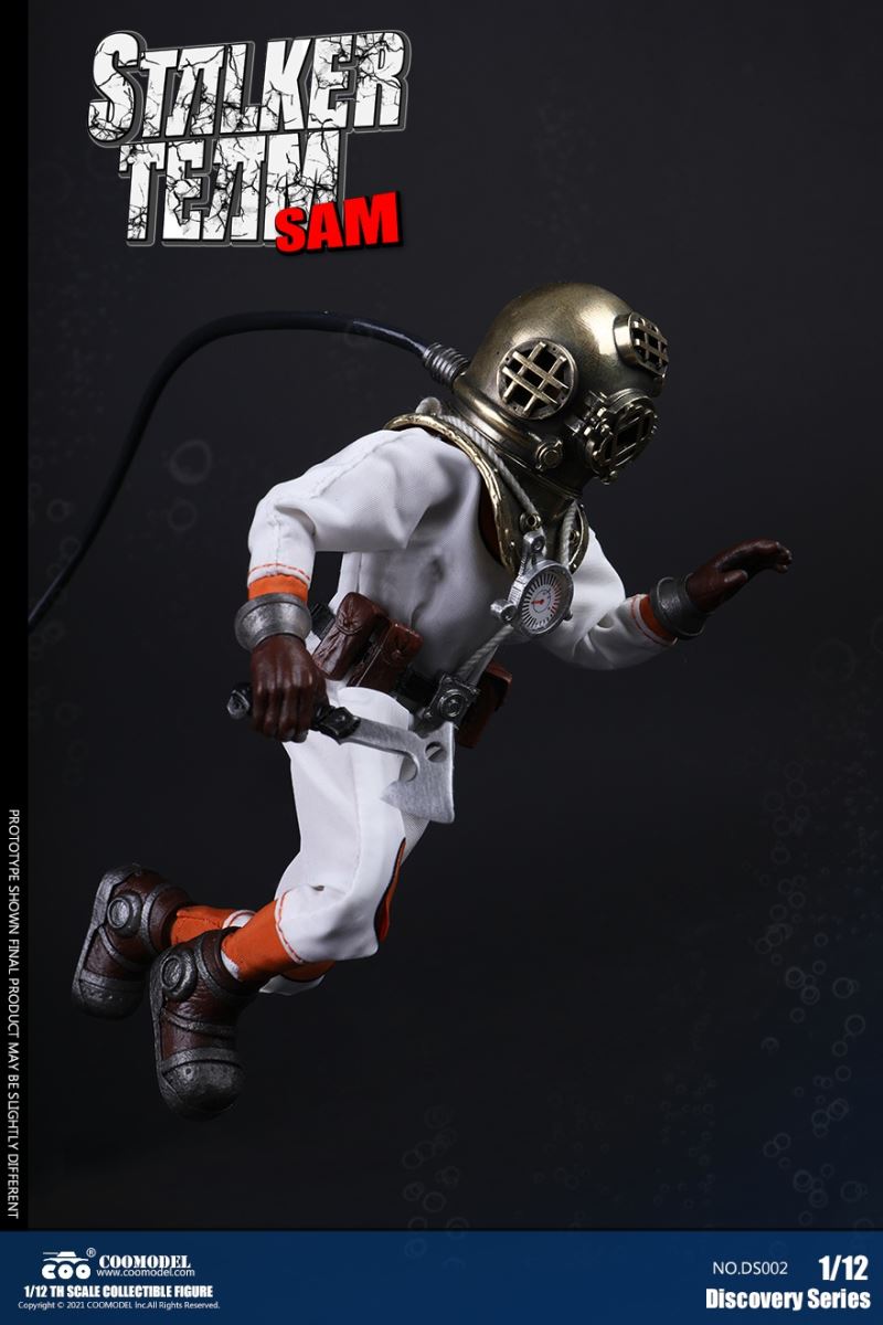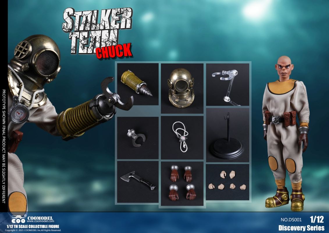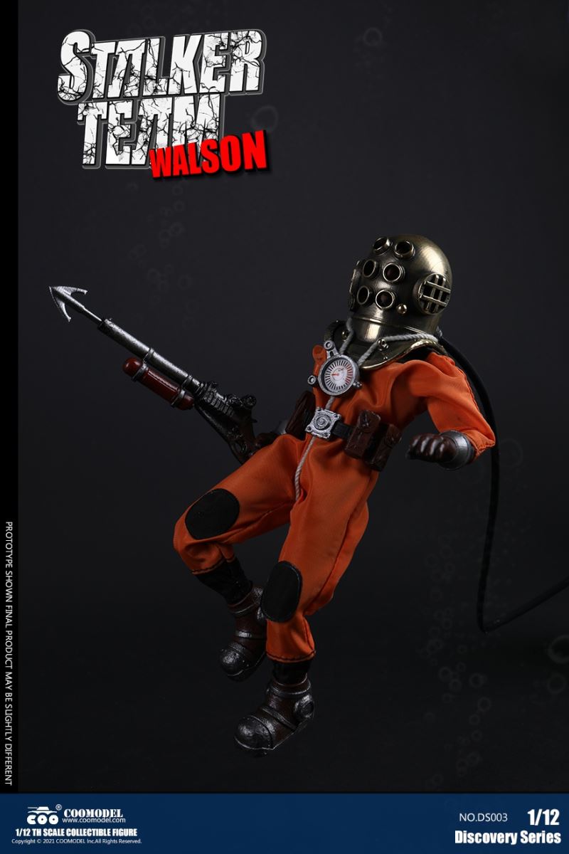 Three Set (Bronze Edition)Barcode: 6971242121874Sneak Squad Set (Bronze Edition)includes Chuck (DS001), Sam (DS002), Walson (DS003) three dolls complete Accessories,more exclusive large-scale accessories, increase team play ~Chuck configuration list: -headsculpture-1/12 movable body-6 replacement hands-4 replacement glove handsClothing:-copper diving helmet-white Yellow edge diving suit-diving storage belt-diving bootsAccessories:-mechanical arm (replaceable pliers or drill bits)-axe-pressure gauge-black doll stand-transparent movable stand------------ ---Sam configuration list: -Headsculpture-1/12 movable body-6 replacement hands-4 replacement glove handsClothing:-Copper diving helmet-White orange-rim wetsuit-Diving storage belt-Diving BootsAccessories:-Harpoon-Axe-Pressure gauge-Black doll stand-Transparent movable stand---------------Wolson configuration list:-Headsculpture-1/12 movable body-6 replacement hands-4 Only replace gloved handsClothing:-Bronze diving helmet-Orange and black-rimmed diving suit-Diving storage belt-Diving bootsAccessories:-Cigar-Speargun-Axe-Pressure gauge-Black doll stand-Transparent movable stand--- ------------Theset unique: -Underwateroxygen circulation device-Helmet connection tube 3COOMODEL 1/12 DS004 DISCOVERY SERIES-STALKER TEAM SET (COPPER VERSION)BARCODE: 6971242121874The Team Set ( Copper Ver.) combines of all figures and accessories of Chuck (DS001), Sam (DS002) and Walson (DS003), with a special part for team up!Chuck specially features:-One (1) head sculpture-One (1) 1/12th scale super action body-Six (6) pieces of interchangeable palms-Four (4) pieces of interchangeable gloved palmsCostumes: -One(1) copper-made diving helmet- One (. 1) White and Yellow Diving SUIT- One (. 1) Diving Belt with pockets- One (. 1) pair of Diving ShoesAccessories:- One (. 1) Machine ARM (with Plier and Driller)- One (. 1) Ax- One (1) pressure gage-One (1) black figure stand-One (1) clear action stand----------Sam special features:-One(1) head sculpture-One (1) 1/ 12th scale super action body-Six (6) pieces of interchangeable palms -Four (4) pieces of interchangeable gloved palmsCostumes: -One(1) copper-made diving helmet-One (1) white and orange diving suit-One (1) diving belt with pockets -One(1) pair of diving shoesAccessories:-One (1) fishgig-One (1) axe-One (1) pressure gage-One (1) black figure stand-One (1) clear action stand---- ------Walson specially features:-One(1) head sculpture-One (1) 1/12th scale super action body-Six (6) pieces of interchangeable palms-Four (4) pieces of interchangeable gloved palmsCostumes:-One (1) copper-made diving helmet-One (1) orange and black diving suit-One (1) diving belt with pockets-One (1) pair of diving shoesAccessories:-One (1) cigar-One (1 ) fishing gun-One (1) axe-One (1) pressure gage-One (1) black figure stand-One (1) clear action stand-----------Team Set Special:-One ( 1) Oxygen Cycling Device-One (2) pipe for helmets==================COOMODEL 1/12 DS005 Discovery-Sneak Team . Chuck (Color Version)Barcode: 6971242121881Configuration List :-HeadSculpture-1/12 Movable Body-6 Replacement Hands-4 Replacement Glove HandsClothing:- diving helmet orange- yellow edge wetsuit white- diving belt housing- diving bootsAccessories:- mechanical arm (or alternatively the drill pliers)- ax- gauge- black doll stand- transparent movable fenceCOOMODEL 1/12 DS005 DISCOVERY SERIES -STALKER TEAM-CHUCK (COLORED VERSION)BARCODE: 6971242121881The 1/12th scale Chuck Collectible Figure specially features :-One(1) head sculpture-One (1) 1/12th scale super action body-Six (6) pieces of interchangeable palms-Four (4) pieces of interchangeable gloved palmsCostumes:-One(1) orange diving helmet-One (1) white and yellow diving suit-One (1) diving belt with pockets-One (1) pair of diving shoesAccessories:-One (1) machine arm (with plier and driller)-One(1) axe-One (1) pressure gage-One (1) black figure stand-One (1) clear action stand==================COOMODEL 1/12 DS006 Discovery-Sneak Team. Sam (Color Version)Barcode: 6971242121898Configuration List :-HeadSculpture-1/12 Movable Body-6 Replacement Hands-4 Replacement Glove HandsClothing:-Pink diving helmet- white orange edge wetsuit- diving belt housing- diving bootsAccessories:- harpoon- ax- gauge- black doll stand- transparent movable fenceCOOMODEL 1/12 DS006 DISCOVERY SERIES - STALKER TEAM - SAM (COLORED VERSION )BARCODE: 6971242121898The 1/12th scale Sam Collectible Figure specially features :-One(1) head sculpture-One (1) 1/12th scale super action body-Six (6) pieces of interchangeable palms-Four (4) pieces of interchangeable gloved palmsCostumes:-One (1) pink diving helmet-One (1) white and orange diving suit-One (1) diving belt with pockets-One (1) pair of diving shoesAccessories:-One (1) fishgig-One (1) axe-One (1) pressure gage-One (1) black figure stand-One (1) clear action stand==================COOMODEL 1/12 DS007 Discovery-Sneak Team. Walson (Color Version)Barcode: 6971242121904Configuration List :-HeadSculpture-1/12 Movable Body-6 Replacement Hands-4 Replacement Glove HandsClothing:- blue diving helmet- black side orange diving suit- diving storage belt- diving bootsAccessories:- cigars- spear gun- ax- pressure gauge- black doll stand- transparent movable fenceCOOMODEL 1/12 DS007 DISCOVERY SERIES - STALKER TEAM -WALSON (COLORED VERSION)BARCODE: 6971242121904The 1/12th scale Walson Collectible Figure specially features:-One(1) head sculpture-One (1) 1/12th scale super action body-Six (6) pieces of interchangeable palms-Four (4) pieces of interchangeable gloved palmsCostumes:-One(1) blue diving helmet-One (1) orange and black diving suit-One (1) diving belt with pockets-One (1) pair of diving shoesAccessories:-One (1) cigar-One (1 ) fishing gun-One (1) axe-One (1) pressure gage-One (1) black figure stand-One (1) clear action stand=================COOMODEL 1/12 DS008 Discovery- Sneak Squad Three Set (color version)Barcode: 6971242121911Sneak Squad Set (color version)includes Chuck (DS005),