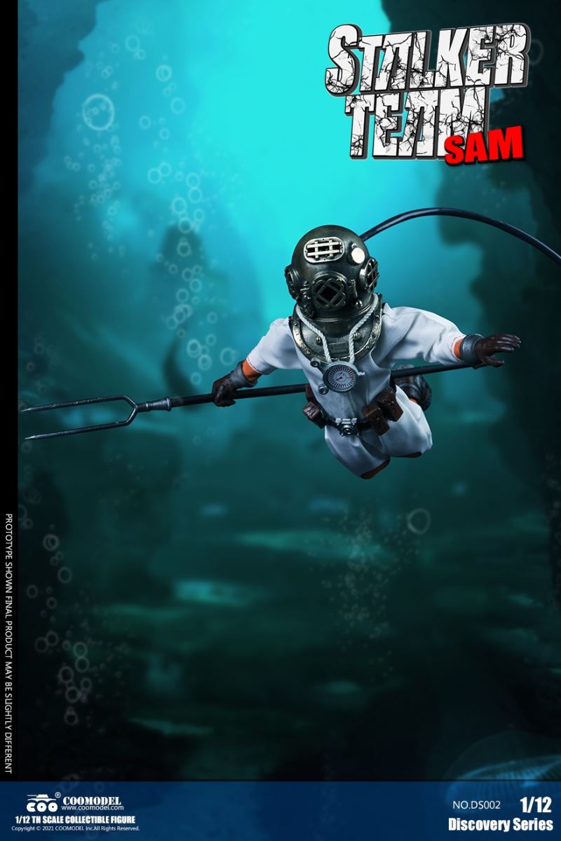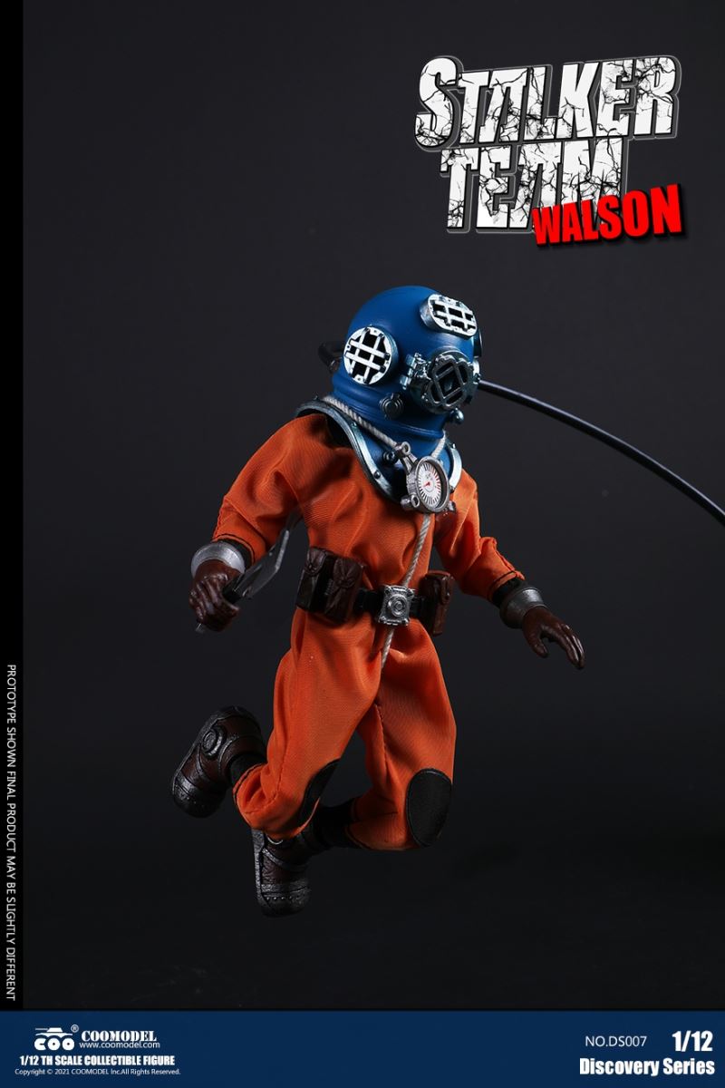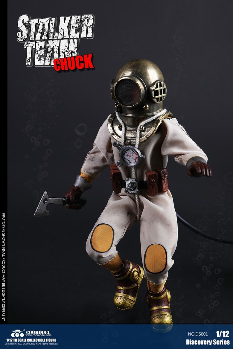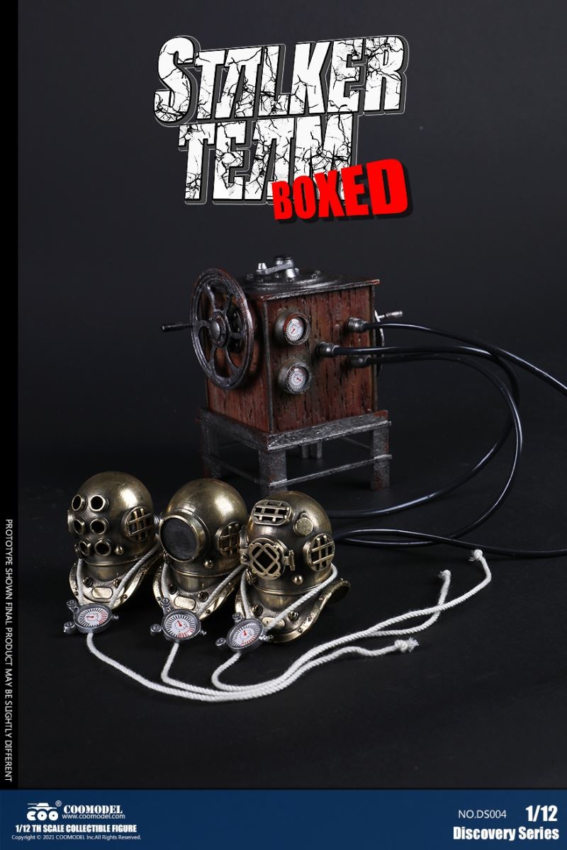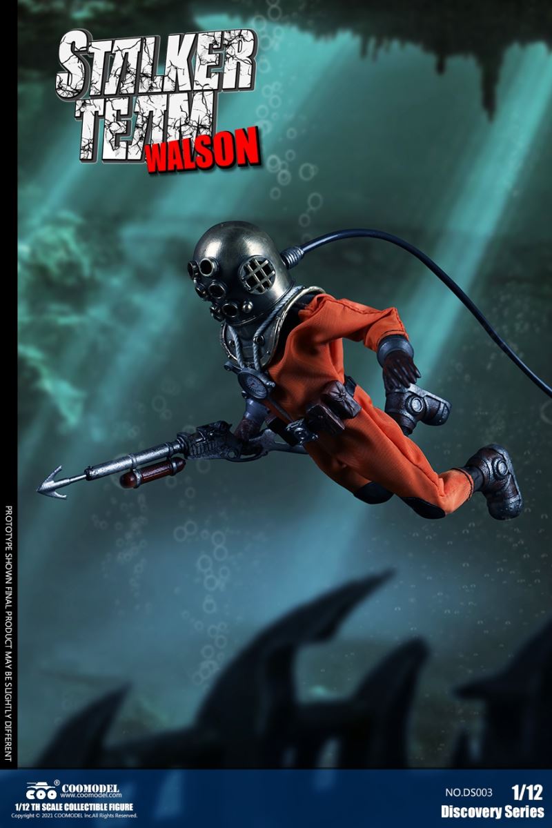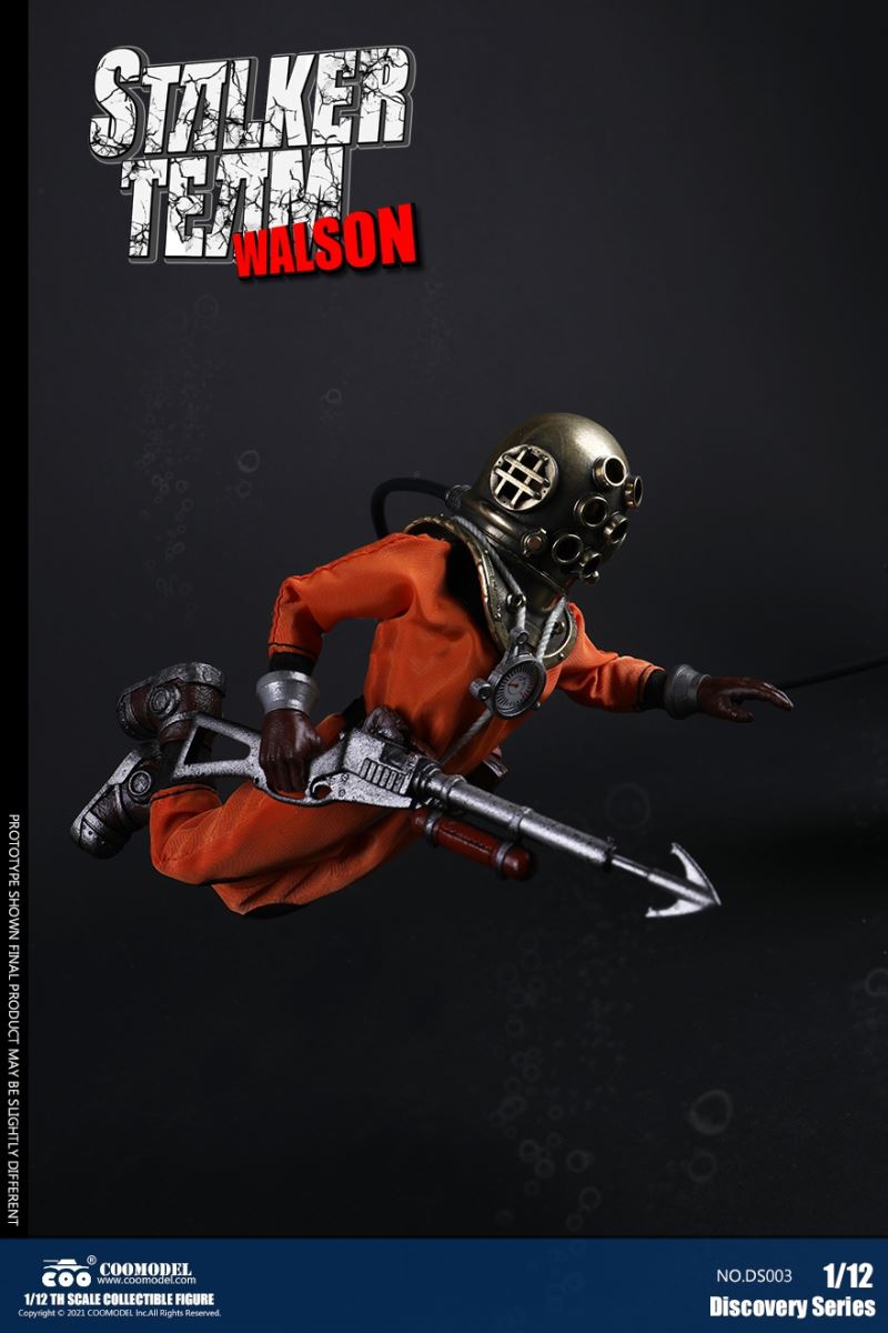 Three Set (Bronze Edition)Barcode: 6971242121874Sneak Squad Set (Bronze Edition)includes Chuck (DS001), Sam (DS002), Walson (DS003) three dolls complete Accessories,more exclusive large-scale accessories, increase team play ~Chuck configuration list: -headsculpture-1/12 movable body-6 replacement hands-4 replacement glove handsClothing:-copper diving helmet-white Yellow edge diving suit-diving storage belt-diving bootsAccessories:-mechanical arm (replaceable pliers or drill bits)-axe-pressure gauge-black doll stand-transparent movable stand------------ ---Sam configuration list: -Headsculpture-1/12 movable body-6 replacement hands-4 replacement glove handsClothing:-Copper diving helmet-White orange-rim wetsuit-Diving storage belt-Diving BootsAccessories:-Harpoon-Axe-Pressure gauge-Black doll stand-Transparent movable stand---------------Wolson configuration list:-Headsculpture-1/12 movable body-6 replacement hands-4 Only replace gloved handsClothing:-Bronze diving helmet-Orange and black-rimmed diving suit-Diving storage belt-Diving bootsAccessories:-Cigar-Speargun-Axe-Pressure gauge-Black doll stand-Transparent movable stand--- ------------Theset unique: -Underwateroxygen circulation device-Helmet connection tube 3COOMODEL 1/12 DS004 DISCOVERY SERIES-STALKER TEAM SET (COPPER VERSION)BARCODE: 6971242121874The Team Set ( Copper Ver.) combines of all figures and accessories of Chuck (DS001), Sam (DS002) and Walson (DS003), with a special part for team up!Chuck specially features:-One (1) head sculpture-One (1) 1/12th scale super action body-Six (6) pieces of interchangeable palms-Four (4) pieces of interchangeable gloved palmsCostumes: -One(1) copper-made diving helmet- One (. 1) White and Yellow Diving SUIT- One (. 1) Diving Belt with pockets- One (. 1) pair of Diving ShoesAccessories:- One (. 1) Machine ARM (with Plier and Driller)- One (. 1) Ax- One (1) pressure gage-One (1) black figure stand-One (1) clear action stand----------Sam special features:-One(1) head sculpture-One (1) 1/ 12th scale super action body-Six (6) pieces of interchangeable palms -Four (4) pieces of interchangeable gloved palmsCostumes: -One(1) copper-made diving helmet-One (1) white and orange diving suit-One (1) diving belt with pockets -One(1) pair of diving shoesAccessories:-One (1) fishgig-One (1) axe-One (1) pressure gage-One (1) black figure stand-One (1) clear action stand---- ------Walson specially features:-One(1) head sculpture-One (1) 1/12th scale super action body-Six (6) pieces of interchangeable palms-Four (4) pieces of interchangeable gloved palmsCostumes:-One (1) copper-made diving helmet-One (1) orange and black diving suit-One (1) diving belt with pockets-One (1) pair of diving shoesAccessories:-One (1) cigar-One (1 ) fishing gun-One (1) axe-One (1) pressure gage-One (1) black figure stand-One (1) clear action stand-----------Team Set Special:-One ( 1) Oxygen Cycling Device-One (2) pipe for helmets==================COOMODEL 1/12 DS005 Discovery-Sneak Team . Chuck (Color Version)Barcode: 6971242121881Configuration List :-HeadSculpture-1/12 Movable Body-6 Replacement Hands-4 Replacement Glove HandsClothing:- diving helmet orange- yellow edge wetsuit white- diving belt housing- diving bootsAccessories:- mechanical arm (or alternatively the drill pliers)- ax- gauge- black doll stand- transparent movable fenceCOOMODEL 1/12 DS005 DISCOVERY SERIES -STALKER TEAM-CHUCK (COLORED VERSION)BARCODE: 6971242121881The 1/12th scale Chuck Collectible Figure specially features :-One(1) head sculpture-One (1) 1/12th scale super action body-Six (6) pieces of interchangeable palms-Four (4) pieces of interchangeable gloved palmsCostumes:-One(1) orange diving helmet-One (1) white and yellow diving suit-One (1) diving belt with pockets-One (1) pair of diving shoesAccessories:-One (1) machine arm (with plier and driller)-One(1) axe-One (1) pressure gage-One (1) black figure stand-One (1) clear action stand==================COOMODEL 1/12 DS006 Discovery-Sneak Team. Sam (Color Version)Barcode: 6971242121898Configuration List :-HeadSculpture-1/12 Movable Body-6 Replacement Hands-4 Replacement Glove HandsClothing:-Pink diving helmet- white orange edge wetsuit- diving belt housing- diving bootsAccessories:- harpoon- ax- gauge- black doll stand- transparent movable fenceCOOMODEL 1/12 DS006 DISCOVERY SERIES - STALKER TEAM - SAM (COLORED VERSION )BARCODE: 6971242121898The 1/12th scale Sam Collectible Figure specially features :-One(1) head sculpture-One (1) 1/12th scale super action body-Six (6) pieces of interchangeable palms-Four (4) pieces of interchangeable gloved palmsCostumes:-One (1) pink diving helmet-One (1) white and orange diving suit-One (1) diving belt with pockets-One (1) pair of diving shoesAccessories:-One (1) fishgig-One (1) axe-One (1) pressure gage-One (1) black figure stand-One (1) clear action stand==================COOMODEL 1/12 DS007 Discovery-Sneak Team. Walson (Color Version)Barcode: 6971242121904Configuration List :-HeadSculpture-1/12 Movable Body-6 Replacement Hands-4 Replacement Glove HandsClothing:- blue diving helmet- black side orange diving suit- diving storage belt- diving bootsAccessories:- cigars- spear gun- ax- pressure gauge- black doll stand- transparent movable fenceCOOMODEL 1/12 DS007 DISCOVERY SERIES - STALKER TEAM -WALSON (COLORED VERSION)BARCODE: 6971242121904The 1/12th scale Walson Collectible Figure specially features:-One(1) head sculpture-One (1) 1/12th scale super action body-Six (6) pieces of interchangeable palms-Four (4) pieces of interchangeable gloved palmsCostumes:-One(1) blue diving helmet-One (1) orange and black diving suit-One (1) diving belt with pockets-One (1) pair of diving shoesAccessories:-One (1) cigar-One (1 ) fishing gun-One (1) axe-One (1) pressure gage-One (1) black figure stand-One (1) clear action stand=================COOMODEL 1/12 DS008 Discovery- Sneak Squad Three Set (color version)Barcode: 6971242121911Sneak Squad Set (color version)includes Chuck (DS005),
