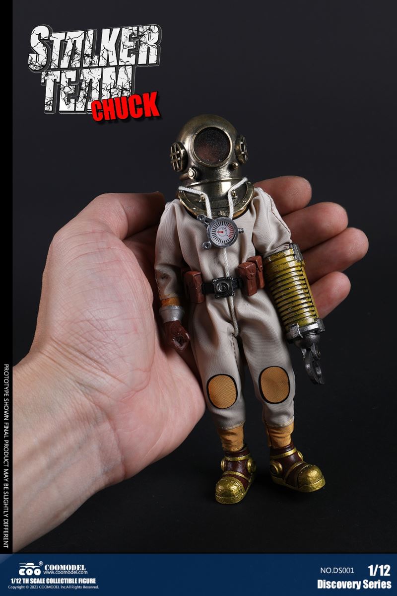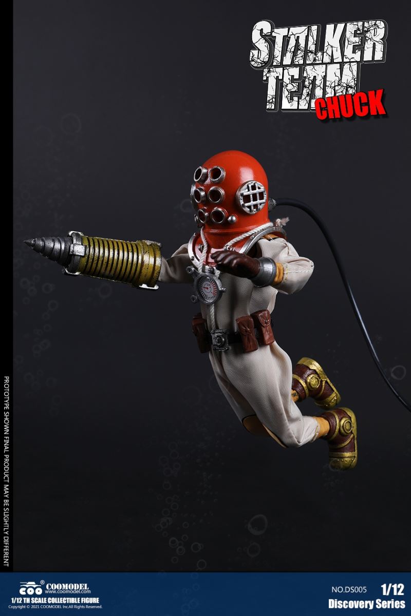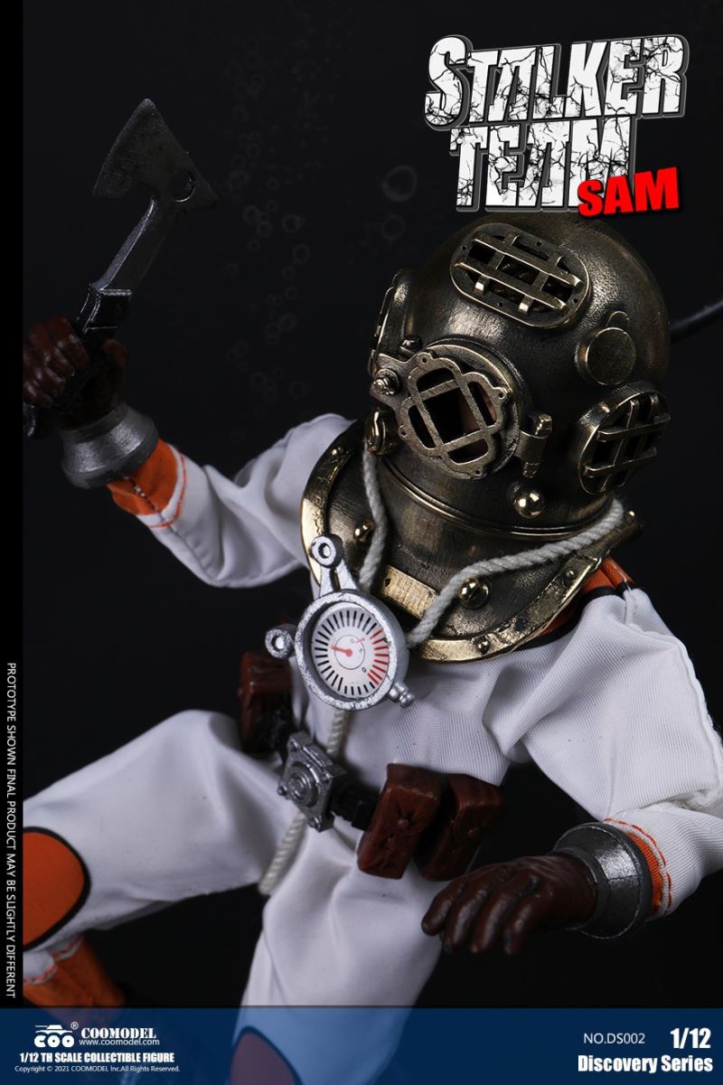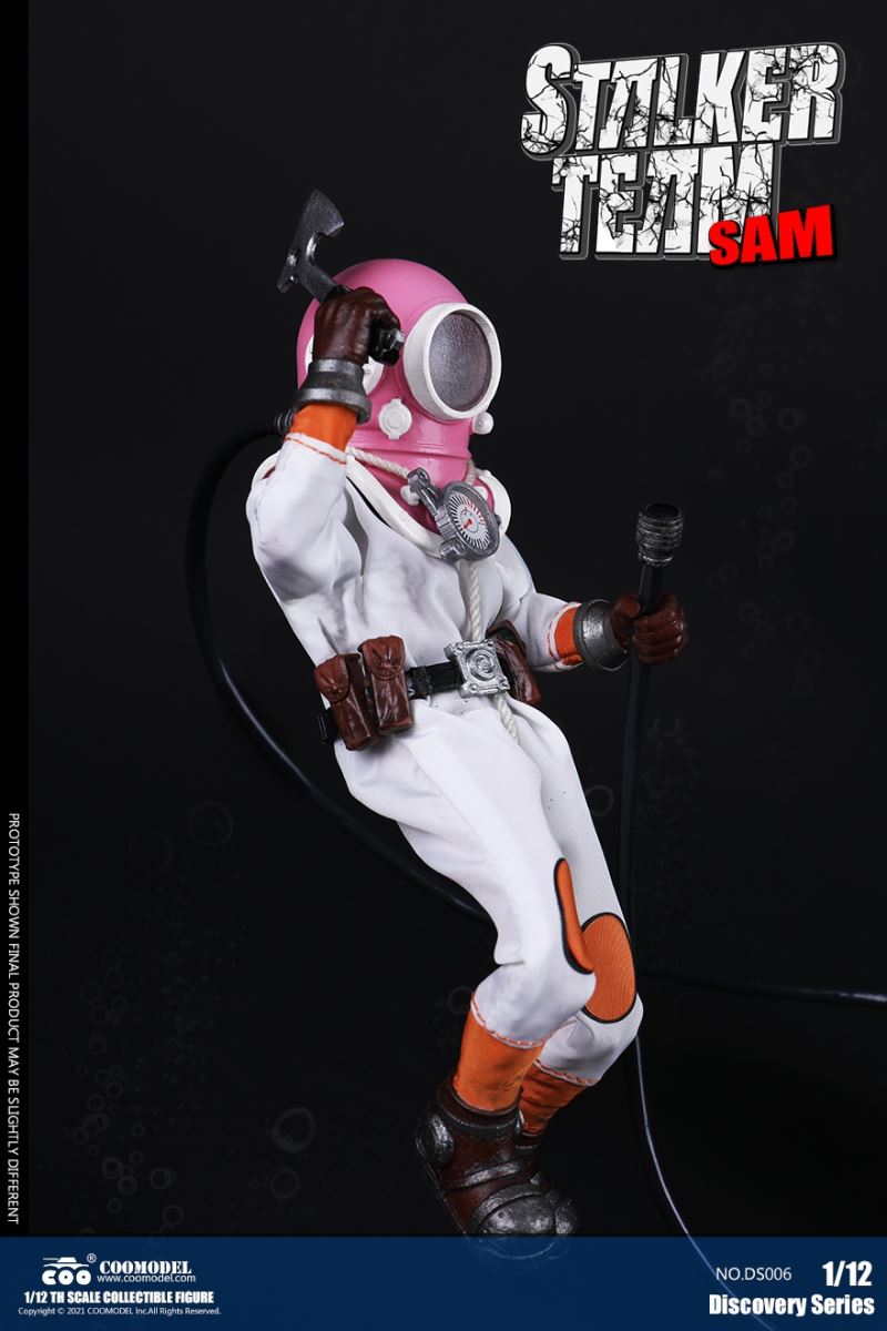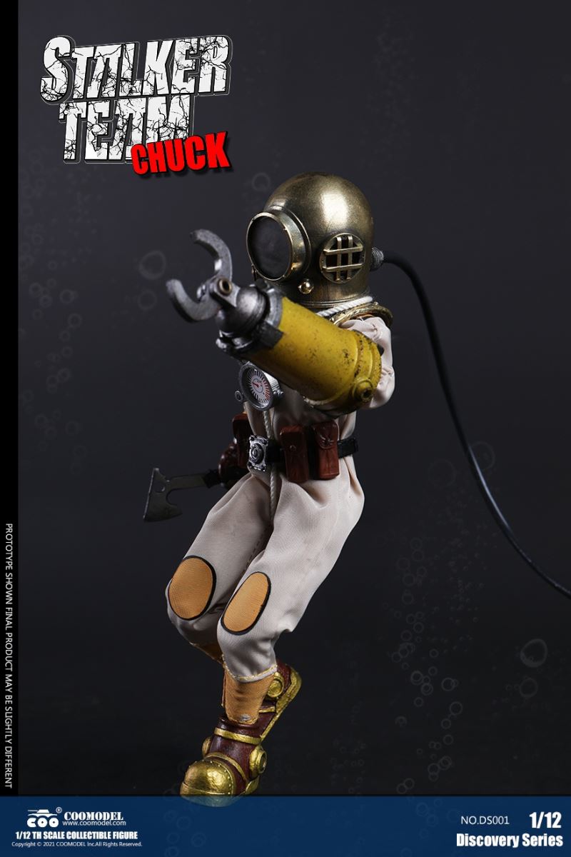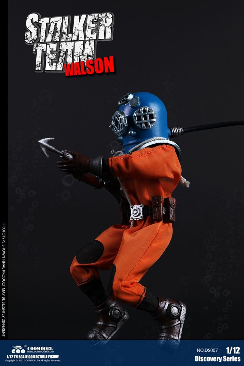 Three Set (Bronze Edition)Barcode: 6971242121874Sneak Squad Set (Bronze Edition)includes Chuck (DS001), Sam (DS002), Walson (DS003) three dolls complete Accessories,more exclusive large-scale accessories, increase team play ~Chuck configuration list: -headsculpture-1/12 movable body-6 replacement hands-4 replacement glove handsClothing:-copper diving helmet-white Yellow edge diving suit-diving storage belt-diving bootsAccessories:-mechanical arm (replaceable pliers or drill bits)-axe-pressure gauge-black doll stand-transparent movable stand------------ ---Sam configuration list: -Headsculpture-1/12 movable body-6 replacement hands-4 replacement glove handsClothing:-Copper diving helmet-White orange-rim wetsuit-Diving storage belt-Diving BootsAccessories:-Harpoon-Axe-Pressure gauge-Black doll stand-Transparent movable stand---------------Wolson configuration list:-Headsculpture-1/12 movable body-6 replacement hands-4 Only replace gloved handsClothing:-Bronze diving helmet-Orange and black-rimmed diving suit-Diving storage belt-Diving bootsAccessories:-Cigar-Speargun-Axe-Pressure gauge-Black doll stand-Transparent movable stand--- ------------Theset unique: -Underwateroxygen circulation device-Helmet connection tube 3COOMODEL 1/12 DS004 DISCOVERY SERIES-STALKER TEAM SET (COPPER VERSION)BARCODE: 6971242121874The Team Set ( Copper Ver.) combines of all figures and accessories of Chuck (DS001), Sam (DS002) and Walson (DS003), with a special part for team up!Chuck specially features:-One (1) head sculpture-One (1) 1/12th scale super action body-Six (6) pieces of interchangeable palms-Four (4) pieces of interchangeable gloved palmsCostumes: -One(1) copper-made diving helmet- One (. 1) White and Yellow Diving SUIT- One (. 1) Diving Belt with pockets- One (. 1) pair of Diving ShoesAccessories:- One (. 1) Machine ARM (with Plier and Driller)- One (. 1) Ax- One (1) pressure gage-One (1) black figure stand-One (1) clear action stand----------Sam special features:-One(1) head sculpture-One (1) 1/ 12th scale super action body-Six (6) pieces of interchangeable palms -Four (4) pieces of interchangeable gloved palmsCostumes: -One(1) copper-made diving helmet-One (1) white and orange diving suit-One (1) diving belt with pockets -One(1) pair of diving shoesAccessories:-One (1) fishgig-One (1) axe-One (1) pressure gage-One (1) black figure stand-One (1) clear action stand---- ------Walson specially features:-One(1) head sculpture-One (1) 1/12th scale super action body-Six (6) pieces of interchangeable palms-Four (4) pieces of interchangeable gloved palmsCostumes:-One (1) copper-made diving helmet-One (1) orange and black diving suit-One (1) diving belt with pockets-One (1) pair of diving shoesAccessories:-One (1) cigar-One (1 ) fishing gun-One (1) axe-One (1) pressure gage-One (1) black figure stand-One (1) clear action stand-----------Team Set Special:-One ( 1) Oxygen Cycling Device-One (2) pipe for helmets==================COOMODEL 1/12 DS005 Discovery-Sneak Team . Chuck (Color Version)Barcode: 6971242121881Configuration List :-HeadSculpture-1/12 Movable Body-6 Replacement Hands-4 Replacement Glove HandsClothing:- diving helmet orange- yellow edge wetsuit white- diving belt housing- diving bootsAccessories:- mechanical arm (or alternatively the drill pliers)- ax- gauge- black doll stand- transparent movable fenceCOOMODEL 1/12 DS005 DISCOVERY SERIES -STALKER TEAM-CHUCK (COLORED VERSION)BARCODE: 6971242121881The 1/12th scale Chuck Collectible Figure specially features :-One(1) head sculpture-One (1) 1/12th scale super action body-Six (6) pieces of interchangeable palms-Four (4) pieces of interchangeable gloved palmsCostumes:-One(1) orange diving helmet-One (1) white and yellow diving suit-One (1) diving belt with pockets-One (1) pair of diving shoesAccessories:-One (1) machine arm (with plier and driller)-One(1) axe-One (1) pressure gage-One (1) black figure stand-One (1) clear action stand==================COOMODEL 1/12 DS006 Discovery-Sneak Team. Sam (Color Version)Barcode: 6971242121898Configuration List :-HeadSculpture-1/12 Movable Body-6 Replacement Hands-4 Replacement Glove HandsClothing:-Pink diving helmet- white orange edge wetsuit- diving belt housing- diving bootsAccessories:- harpoon- ax- gauge- black doll stand- transparent movable fenceCOOMODEL 1/12 DS006 DISCOVERY SERIES - STALKER TEAM - SAM (COLORED VERSION )BARCODE: 6971242121898The 1/12th scale Sam Collectible Figure specially features :-One(1) head sculpture-One (1) 1/12th scale super action body-Six (6) pieces of interchangeable palms-Four (4) pieces of interchangeable gloved palmsCostumes:-One (1) pink diving helmet-One (1) white and orange diving suit-One (1) diving belt with pockets-One (1) pair of diving shoesAccessories:-One (1) fishgig-One (1) axe-One (1) pressure gage-One (1) black figure stand-One (1) clear action stand==================COOMODEL 1/12 DS007 Discovery-Sneak Team. Walson (Color Version)Barcode: 6971242121904Configuration List :-HeadSculpture-1/12 Movable Body-6 Replacement Hands-4 Replacement Glove HandsClothing:- blue diving helmet- black side orange diving suit- diving storage belt- diving bootsAccessories:- cigars- spear gun- ax- pressure gauge- black doll stand- transparent movable fenceCOOMODEL 1/12 DS007 DISCOVERY SERIES - STALKER TEAM -WALSON (COLORED VERSION)BARCODE: 6971242121904The 1/12th scale Walson Collectible Figure specially features:-One(1) head sculpture-One (1) 1/12th scale super action body-Six (6) pieces of interchangeable palms-Four (4) pieces of interchangeable gloved palmsCostumes:-One(1) blue diving helmet-One (1) orange and black diving suit-One (1) diving belt with pockets-One (1) pair of diving shoesAccessories:-One (1) cigar-One (1 ) fishing gun-One (1) axe-One (1) pressure gage-One (1) black figure stand-One (1) clear action stand=================COOMODEL 1/12 DS008 Discovery- Sneak Squad Three Set (color version)Barcode: 6971242121911Sneak Squad Set (color version)includes Chuck (DS005),