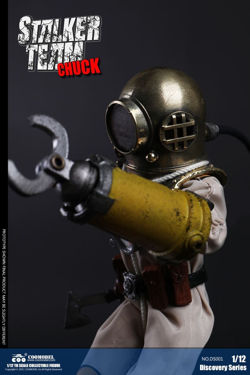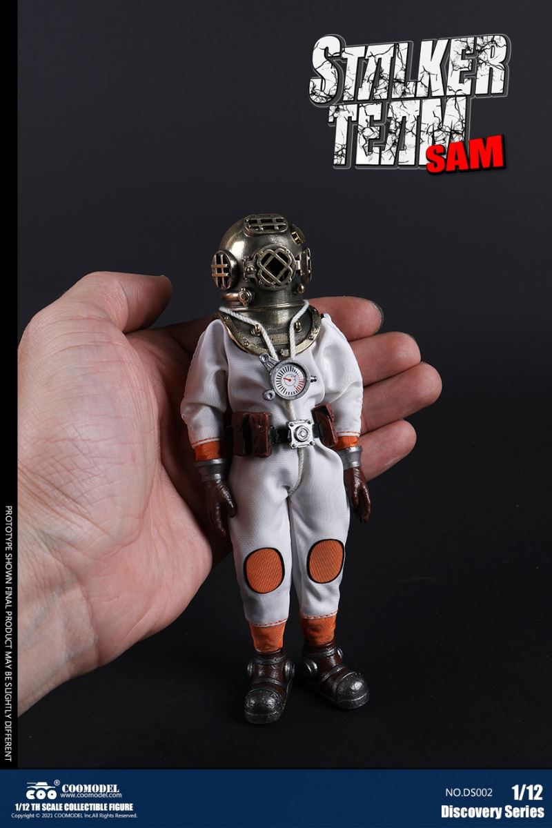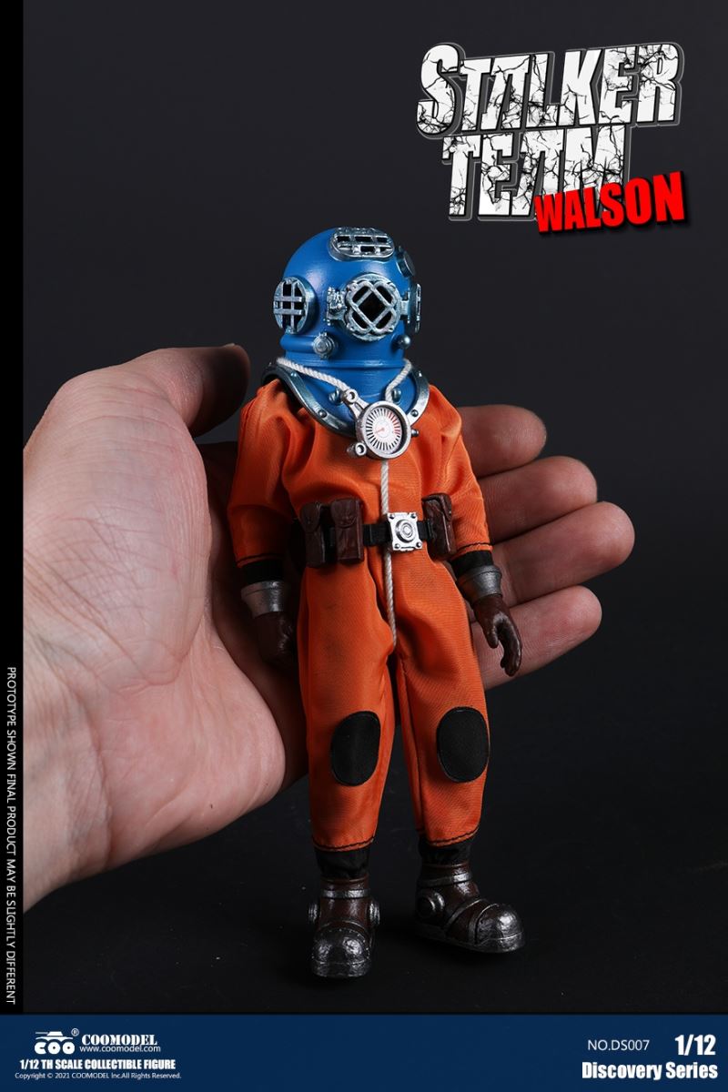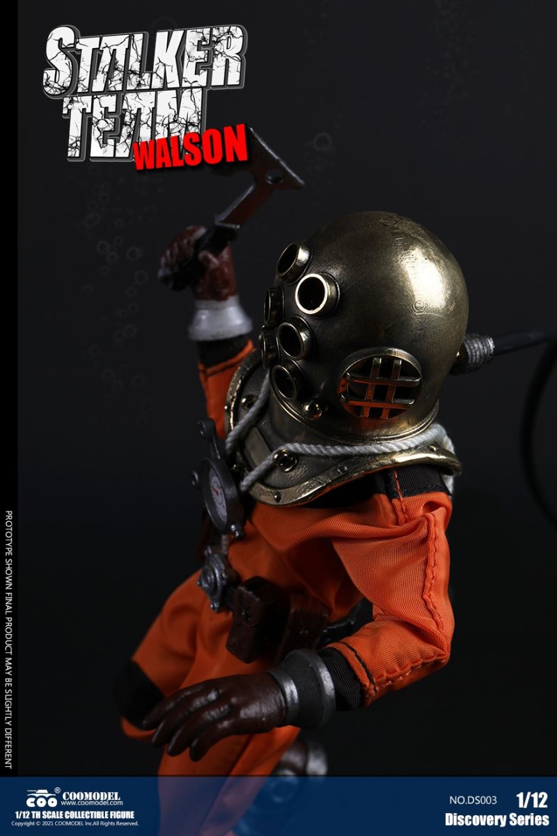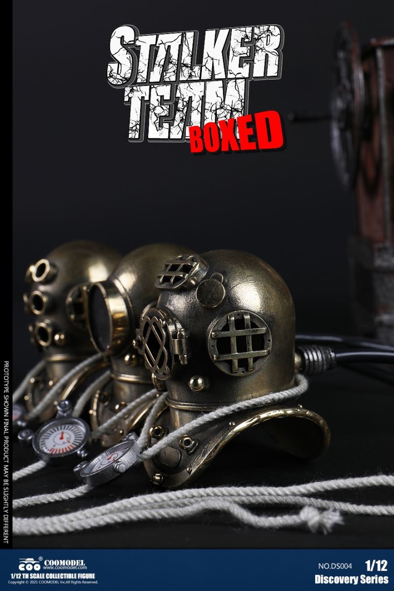 Three Set (Bronze Edition)Barcode: 6971242121874Sneak Squad Set (Bronze Edition)includes Chuck (DS001), Sam (DS002), Walson (DS003) three dolls complete Accessories,more exclusive large-scale accessories, increase team play ~Chuck configuration list: -headsculpture-1/12 movable body-6 replacement hands-4 replacement glove handsClothing:-copper diving helmet-white Yellow edge diving suit-diving storage belt-diving bootsAccessories:-mechanical arm (replaceable pliers or drill bits)-axe-pressure gauge-black doll stand-transparent movable stand------------ ---Sam configuration list: -Headsculpture-1/12 movable body-6 replacement hands-4 replacement glove handsClothing:-Copper diving helmet-White orange-rim wetsuit-Diving storage belt-Diving BootsAccessories:-Harpoon-Axe-Pressure gauge-Black doll stand-Transparent movable stand---------------Wolson configuration list:-Headsculpture-1/12 movable body-6 replacement hands-4 Only replace gloved handsClothing:-Bronze diving helmet-Orange and black-rimmed diving suit-Diving storage belt-Diving bootsAccessories:-Cigar-Speargun-Axe-Pressure gauge-Black doll stand-Transparent movable stand--- ------------Theset unique: -Underwateroxygen circulation device-Helmet connection tube 3COOMODEL 1/12 DS004 DISCOVERY SERIES-STALKER TEAM SET (COPPER VERSION)BARCODE: 6971242121874The Team Set ( Copper Ver.) combines of all figures and accessories of Chuck (DS001), Sam (DS002) and Walson (DS003), with a special part for team up!Chuck specially features:-One (1) head sculpture-One (1) 1/12th scale super action body-Six (6) pieces of interchangeable palms-Four (4) pieces of interchangeable gloved palmsCostumes: -One(1) copper-made diving helmet- One (. 1) White and Yellow Diving SUIT- One (. 1) Diving Belt with pockets- One (. 1) pair of Diving ShoesAccessories:- One (. 1) Machine ARM (with Plier and Driller)- One (. 1) Ax- One (1) pressure gage-One (1) black figure stand-One (1) clear action stand----------Sam special features:-One(1) head sculpture-One (1) 1/ 12th scale super action body-Six (6) pieces of interchangeable palms -Four (4) pieces of interchangeable gloved palmsCostumes: -One(1) copper-made diving helmet-One (1) white and orange diving suit-One (1) diving belt with pockets -One(1) pair of diving shoesAccessories:-One (1) fishgig-One (1) axe-One (1) pressure gage-One (1) black figure stand-One (1) clear action stand---- ------Walson specially features:-One(1) head sculpture-One (1) 1/12th scale super action body-Six (6) pieces of interchangeable palms-Four (4) pieces of interchangeable gloved palmsCostumes:-One (1) copper-made diving helmet-One (1) orange and black diving suit-One (1) diving belt with pockets-One (1) pair of diving shoesAccessories:-One (1) cigar-One (1 ) fishing gun-One (1) axe-One (1) pressure gage-One (1) black figure stand-One (1) clear action stand-----------Team Set Special:-One ( 1) Oxygen Cycling Device-One (2) pipe for helmets==================COOMODEL 1/12 DS005 Discovery-Sneak Team . Chuck (Color Version)Barcode: 6971242121881Configuration List :-HeadSculpture-1/12 Movable Body-6 Replacement Hands-4 Replacement Glove HandsClothing:- diving helmet orange- yellow edge wetsuit white- diving belt housing- diving bootsAccessories:- mechanical arm (or alternatively the drill pliers)- ax- gauge- black doll stand- transparent movable fenceCOOMODEL 1/12 DS005 DISCOVERY SERIES -STALKER TEAM-CHUCK (COLORED VERSION)BARCODE: 6971242121881The 1/12th scale Chuck Collectible Figure specially features :-One(1) head sculpture-One (1) 1/12th scale super action body-Six (6) pieces of interchangeable palms-Four (4) pieces of interchangeable gloved palmsCostumes:-One(1) orange diving helmet-One (1) white and yellow diving suit-One (1) diving belt with pockets-One (1) pair of diving shoesAccessories:-One (1) machine arm (with plier and driller)-One(1) axe-One (1) pressure gage-One (1) black figure stand-One (1) clear action stand==================COOMODEL 1/12 DS006 Discovery-Sneak Team. Sam (Color Version)Barcode: 6971242121898Configuration List :-HeadSculpture-1/12 Movable Body-6 Replacement Hands-4 Replacement Glove HandsClothing:-Pink diving helmet- white orange edge wetsuit- diving belt housing- diving bootsAccessories:- harpoon- ax- gauge- black doll stand- transparent movable fenceCOOMODEL 1/12 DS006 DISCOVERY SERIES - STALKER TEAM - SAM (COLORED VERSION )BARCODE: 6971242121898The 1/12th scale Sam Collectible Figure specially features :-One(1) head sculpture-One (1) 1/12th scale super action body-Six (6) pieces of interchangeable palms-Four (4) pieces of interchangeable gloved palmsCostumes:-One (1) pink diving helmet-One (1) white and orange diving suit-One (1) diving belt with pockets-One (1) pair of diving shoesAccessories:-One (1) fishgig-One (1) axe-One (1) pressure gage-One (1) black figure stand-One (1) clear action stand==================COOMODEL 1/12 DS007 Discovery-Sneak Team. Walson (Color Version)Barcode: 6971242121904Configuration List :-HeadSculpture-1/12 Movable Body-6 Replacement Hands-4 Replacement Glove HandsClothing:- blue diving helmet- black side orange diving suit- diving storage belt- diving bootsAccessories:- cigars- spear gun- ax- pressure gauge- black doll stand- transparent movable fenceCOOMODEL 1/12 DS007 DISCOVERY SERIES - STALKER TEAM -WALSON (COLORED VERSION)BARCODE: 6971242121904The 1/12th scale Walson Collectible Figure specially features:-One(1) head sculpture-One (1) 1/12th scale super action body-Six (6) pieces of interchangeable palms-Four (4) pieces of interchangeable gloved palmsCostumes:-One(1) blue diving helmet-One (1) orange and black diving suit-One (1) diving belt with pockets-One (1) pair of diving shoesAccessories:-One (1) cigar-One (1 ) fishing gun-One (1) axe-One (1) pressure gage-One (1) black figure stand-One (1) clear action stand=================COOMODEL 1/12 DS008 Discovery- Sneak Squad Three Set (color version)Barcode: 6971242121911Sneak Squad Set (color version)includes Chuck (DS005),