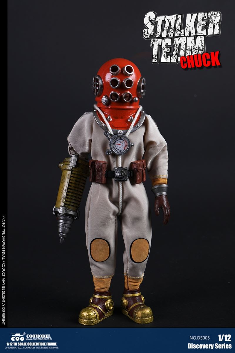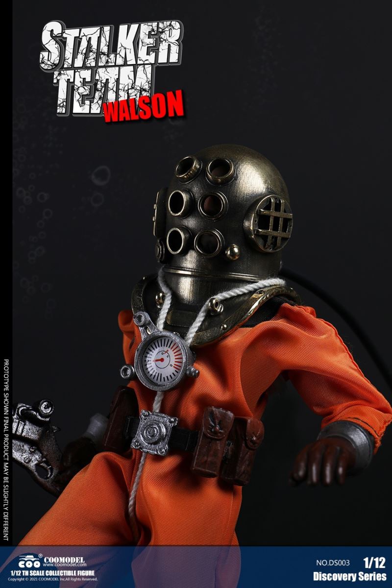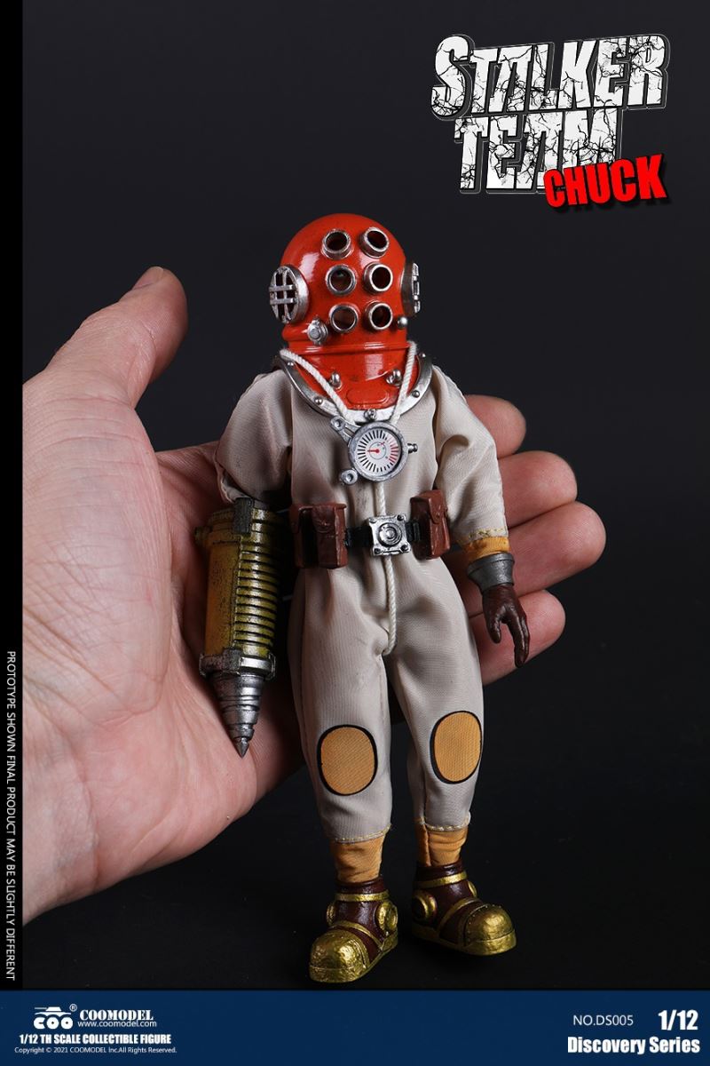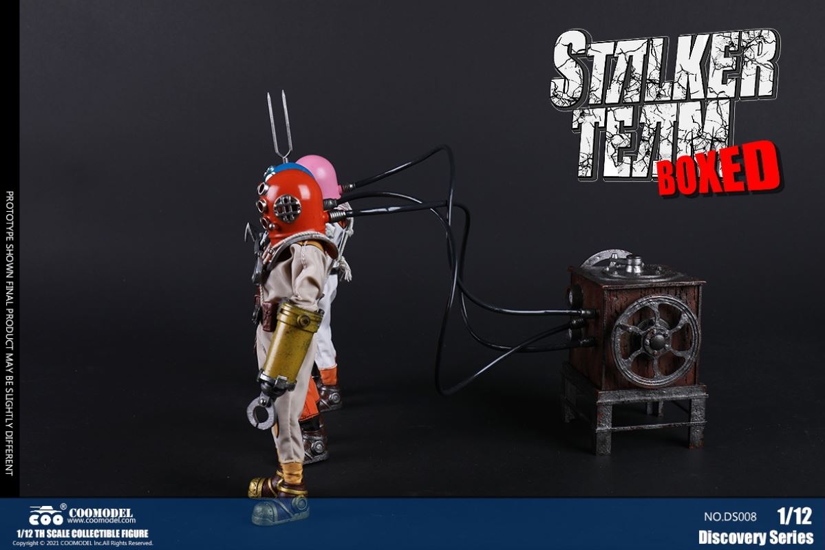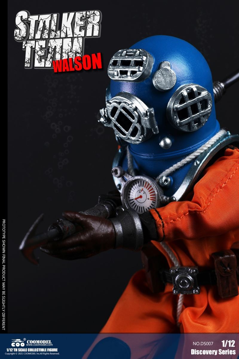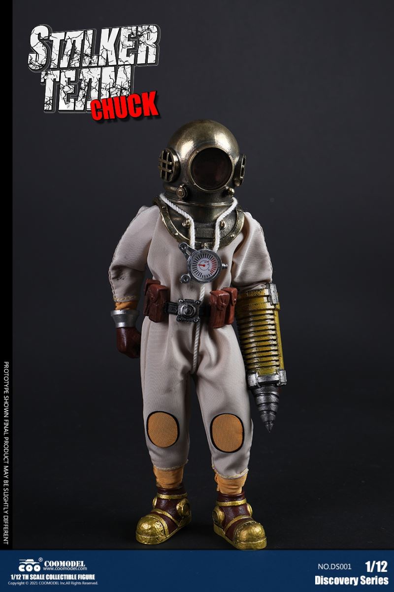 Three Set (Bronze Edition)Barcode: 6971242121874Sneak Squad Set (Bronze Edition)includes Chuck (DS001), Sam (DS002), Walson (DS003) three dolls complete Accessories,more exclusive large-scale accessories, increase team play ~Chuck configuration list: -headsculpture-1/12 movable body-6 replacement hands-4 replacement glove handsClothing:-copper diving helmet-white Yellow edge diving suit-diving storage belt-diving bootsAccessories:-mechanical arm (replaceable pliers or drill bits)-axe-pressure gauge-black doll stand-transparent movable stand------------ ---Sam configuration list: -Headsculpture-1/12 movable body-6 replacement hands-4 replacement glove handsClothing:-Copper diving helmet-White orange-rim wetsuit-Diving storage belt-Diving BootsAccessories:-Harpoon-Axe-Pressure gauge-Black doll stand-Transparent movable stand---------------Wolson configuration list:-Headsculpture-1/12 movable body-6 replacement hands-4 Only replace gloved handsClothing:-Bronze diving helmet-Orange and black-rimmed diving suit-Diving storage belt-Diving bootsAccessories:-Cigar-Speargun-Axe-Pressure gauge-Black doll stand-Transparent movable stand--- ------------Theset unique: -Underwateroxygen circulation device-Helmet connection tube 3COOMODEL 1/12 DS004 DISCOVERY SERIES-STALKER TEAM SET (COPPER VERSION)BARCODE: 6971242121874The Team Set ( Copper Ver.) combines of all figures and accessories of Chuck (DS001), Sam (DS002) and Walson (DS003), with a special part for team up!Chuck specially features:-One (1) head sculpture-One (1) 1/12th scale super action body-Six (6) pieces of interchangeable palms-Four (4) pieces of interchangeable gloved palmsCostumes: -One(1) copper-made diving helmet- One (. 1) White and Yellow Diving SUIT- One (. 1) Diving Belt with pockets- One (. 1) pair of Diving ShoesAccessories:- One (. 1) Machine ARM (with Plier and Driller)- One (. 1) Ax- One (1) pressure gage-One (1) black figure stand-One (1) clear action stand----------Sam special features:-One(1) head sculpture-One (1) 1/ 12th scale super action body-Six (6) pieces of interchangeable palms -Four (4) pieces of interchangeable gloved palmsCostumes: -One(1) copper-made diving helmet-One (1) white and orange diving suit-One (1) diving belt with pockets -One(1) pair of diving shoesAccessories:-One (1) fishgig-One (1) axe-One (1) pressure gage-One (1) black figure stand-One (1) clear action stand---- ------Walson specially features:-One(1) head sculpture-One (1) 1/12th scale super action body-Six (6) pieces of interchangeable palms-Four (4) pieces of interchangeable gloved palmsCostumes:-One (1) copper-made diving helmet-One (1) orange and black diving suit-One (1) diving belt with pockets-One (1) pair of diving shoesAccessories:-One (1) cigar-One (1 ) fishing gun-One (1) axe-One (1) pressure gage-One (1) black figure stand-One (1) clear action stand-----------Team Set Special:-One ( 1) Oxygen Cycling Device-One (2) pipe for helmets==================COOMODEL 1/12 DS005 Discovery-Sneak Team . Chuck (Color Version)Barcode: 6971242121881Configuration List :-HeadSculpture-1/12 Movable Body-6 Replacement Hands-4 Replacement Glove HandsClothing:- diving helmet orange- yellow edge wetsuit white- diving belt housing- diving bootsAccessories:- mechanical arm (or alternatively the drill pliers)- ax- gauge- black doll stand- transparent movable fenceCOOMODEL 1/12 DS005 DISCOVERY SERIES -STALKER TEAM-CHUCK (COLORED VERSION)BARCODE: 6971242121881The 1/12th scale Chuck Collectible Figure specially features :-One(1) head sculpture-One (1) 1/12th scale super action body-Six (6) pieces of interchangeable palms-Four (4) pieces of interchangeable gloved palmsCostumes:-One(1) orange diving helmet-One (1) white and yellow diving suit-One (1) diving belt with pockets-One (1) pair of diving shoesAccessories:-One (1) machine arm (with plier and driller)-One(1) axe-One (1) pressure gage-One (1) black figure stand-One (1) clear action stand==================COOMODEL 1/12 DS006 Discovery-Sneak Team. Sam (Color Version)Barcode: 6971242121898Configuration List :-HeadSculpture-1/12 Movable Body-6 Replacement Hands-4 Replacement Glove HandsClothing:-Pink diving helmet- white orange edge wetsuit- diving belt housing- diving bootsAccessories:- harpoon- ax- gauge- black doll stand- transparent movable fenceCOOMODEL 1/12 DS006 DISCOVERY SERIES - STALKER TEAM - SAM (COLORED VERSION )BARCODE: 6971242121898The 1/12th scale Sam Collectible Figure specially features :-One(1) head sculpture-One (1) 1/12th scale super action body-Six (6) pieces of interchangeable palms-Four (4) pieces of interchangeable gloved palmsCostumes:-One (1) pink diving helmet-One (1) white and orange diving suit-One (1) diving belt with pockets-One (1) pair of diving shoesAccessories:-One (1) fishgig-One (1) axe-One (1) pressure gage-One (1) black figure stand-One (1) clear action stand==================COOMODEL 1/12 DS007 Discovery-Sneak Team. Walson (Color Version)Barcode: 6971242121904Configuration List :-HeadSculpture-1/12 Movable Body-6 Replacement Hands-4 Replacement Glove HandsClothing:- blue diving helmet- black side orange diving suit- diving storage belt- diving bootsAccessories:- cigars- spear gun- ax- pressure gauge- black doll stand- transparent movable fenceCOOMODEL 1/12 DS007 DISCOVERY SERIES - STALKER TEAM -WALSON (COLORED VERSION)BARCODE: 6971242121904The 1/12th scale Walson Collectible Figure specially features:-One(1) head sculpture-One (1) 1/12th scale super action body-Six (6) pieces of interchangeable palms-Four (4) pieces of interchangeable gloved palmsCostumes:-One(1) blue diving helmet-One (1) orange and black diving suit-One (1) diving belt with pockets-One (1) pair of diving shoesAccessories:-One (1) cigar-One (1 ) fishing gun-One (1) axe-One (1) pressure gage-One (1) black figure stand-One (1) clear action stand=================COOMODEL 1/12 DS008 Discovery- Sneak Squad Three Set (color version)Barcode: 6971242121911Sneak Squad Set (color version)includes Chuck (DS005),