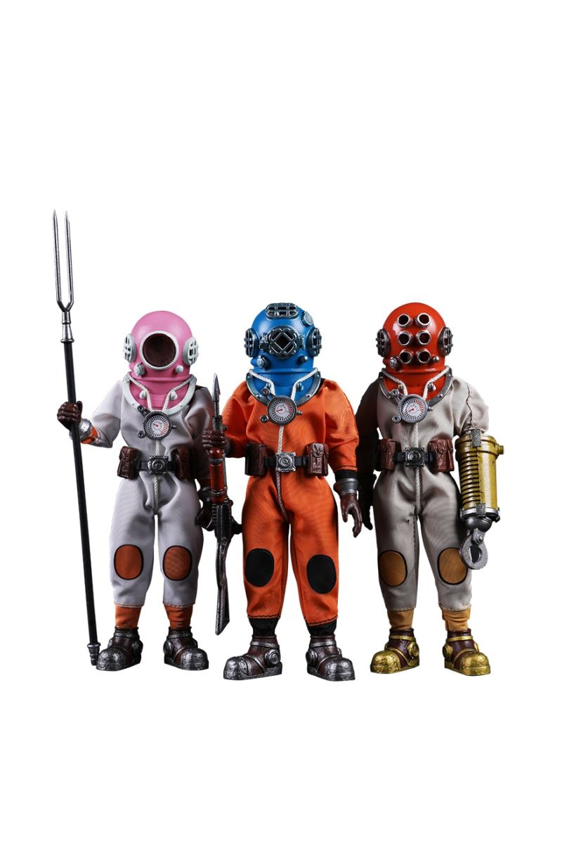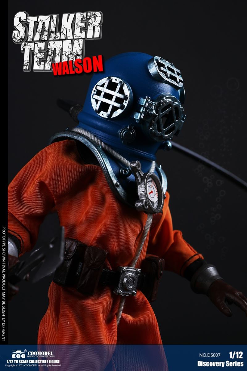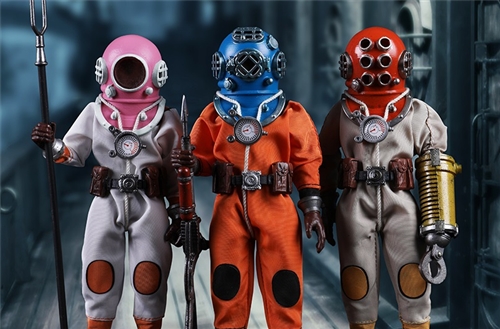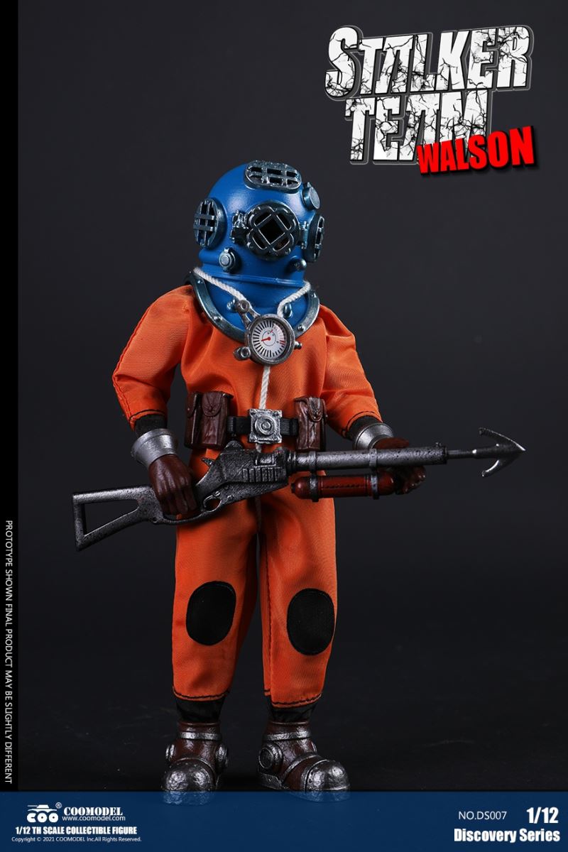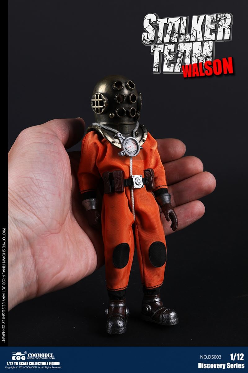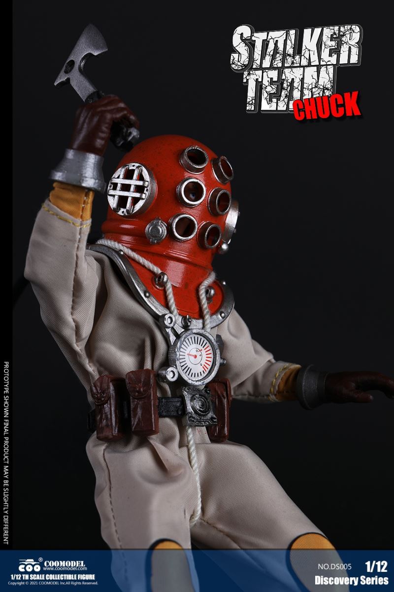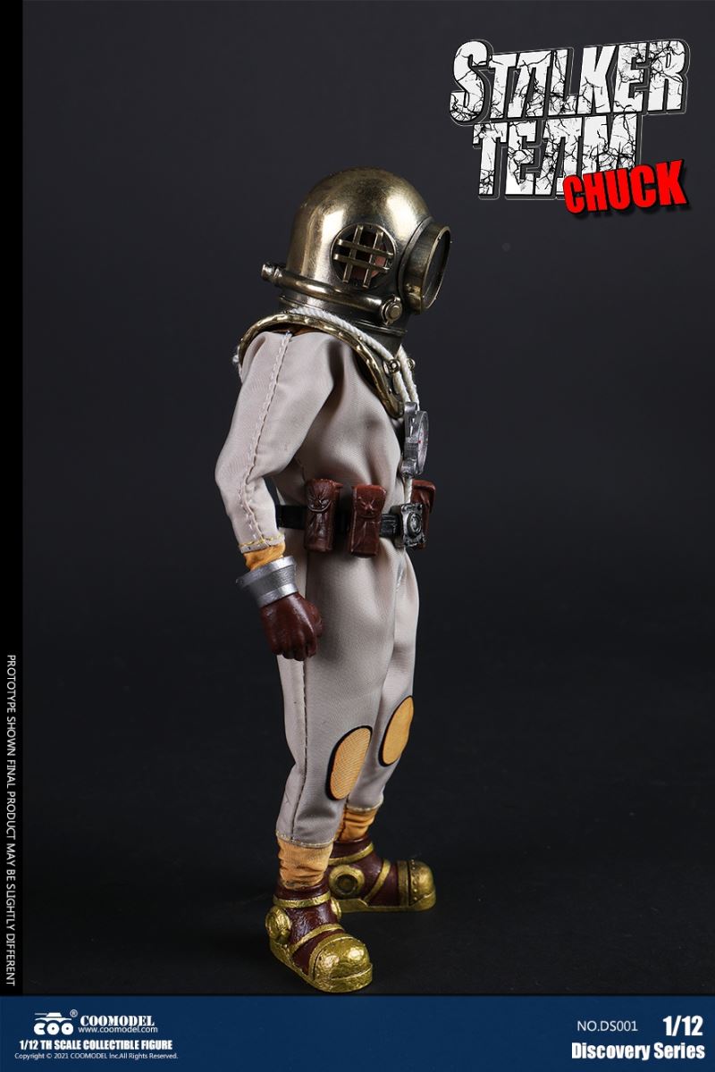 Three Set (Bronze Edition)Barcode: 6971242121874Sneak Squad Set (Bronze Edition)includes Chuck (DS001), Sam (DS002), Walson (DS003) three dolls complete Accessories,more exclusive large-scale accessories, increase team play ~Chuck configuration list: -headsculpture-1/12 movable body-6 replacement hands-4 replacement glove handsClothing:-copper diving helmet-white Yellow edge diving suit-diving storage belt-diving bootsAccessories:-mechanical arm (replaceable pliers or drill bits)-axe-pressure gauge-black doll stand-transparent movable stand------------ ---Sam configuration list: -Headsculpture-1/12 movable body-6 replacement hands-4 replacement glove handsClothing:-Copper diving helmet-White orange-rim wetsuit-Diving storage belt-Diving BootsAccessories:-Harpoon-Axe-Pressure gauge-Black doll stand-Transparent movable stand---------------Wolson configuration list:-Headsculpture-1/12 movable body-6 replacement hands-4 Only replace gloved handsClothing:-Bronze diving helmet-Orange and black-rimmed diving suit-Diving storage belt-Diving bootsAccessories:-Cigar-Speargun-Axe-Pressure gauge-Black doll stand-Transparent movable stand--- ------------Theset unique: -Underwateroxygen circulation device-Helmet connection tube 3COOMODEL 1/12 DS004 DISCOVERY SERIES-STALKER TEAM SET (COPPER VERSION)BARCODE: 6971242121874The Team Set ( Copper Ver.) combines of all figures and accessories of Chuck (DS001), Sam (DS002) and Walson (DS003), with a special part for team up!Chuck specially features:-One (1) head sculpture-One (1) 1/12th scale super action body-Six (6) pieces of interchangeable palms-Four (4) pieces of interchangeable gloved palmsCostumes: -One(1) copper-made diving helmet- One (. 1) White and Yellow Diving SUIT- One (. 1) Diving Belt with pockets- One (. 1) pair of Diving ShoesAccessories:- One (. 1) Machine ARM (with Plier and Driller)- One (. 1) Ax- One (1) pressure gage-One (1) black figure stand-One (1) clear action stand----------Sam special features:-One(1) head sculpture-One (1) 1/ 12th scale super action body-Six (6) pieces of interchangeable palms -Four (4) pieces of interchangeable gloved palmsCostumes: -One(1) copper-made diving helmet-One (1) white and orange diving suit-One (1) diving belt with pockets -One(1) pair of diving shoesAccessories:-One (1) fishgig-One (1) axe-One (1) pressure gage-One (1) black figure stand-One (1) clear action stand---- ------Walson specially features:-One(1) head sculpture-One (1) 1/12th scale super action body-Six (6) pieces of interchangeable palms-Four (4) pieces of interchangeable gloved palmsCostumes:-One (1) copper-made diving helmet-One (1) orange and black diving suit-One (1) diving belt with pockets-One (1) pair of diving shoesAccessories:-One (1) cigar-One (1 ) fishing gun-One (1) axe-One (1) pressure gage-One (1) black figure stand-One (1) clear action stand-----------Team Set Special:-One ( 1) Oxygen Cycling Device-One (2) pipe for helmets==================COOMODEL 1/12 DS005 Discovery-Sneak Team . Chuck (Color Version)Barcode: 6971242121881Configuration List :-HeadSculpture-1/12 Movable Body-6 Replacement Hands-4 Replacement Glove HandsClothing:- diving helmet orange- yellow edge wetsuit white- diving belt housing- diving bootsAccessories:- mechanical arm (or alternatively the drill pliers)- ax- gauge- black doll stand- transparent movable fenceCOOMODEL 1/12 DS005 DISCOVERY SERIES -STALKER TEAM-CHUCK (COLORED VERSION)BARCODE: 6971242121881The 1/12th scale Chuck Collectible Figure specially features :-One(1) head sculpture-One (1) 1/12th scale super action body-Six (6) pieces of interchangeable palms-Four (4) pieces of interchangeable gloved palmsCostumes:-One(1) orange diving helmet-One (1) white and yellow diving suit-One (1) diving belt with pockets-One (1) pair of diving shoesAccessories:-One (1) machine arm (with plier and driller)-One(1) axe-One (1) pressure gage-One (1) black figure stand-One (1) clear action stand==================COOMODEL 1/12 DS006 Discovery-Sneak Team. Sam (Color Version)Barcode: 6971242121898Configuration List :-HeadSculpture-1/12 Movable Body-6 Replacement Hands-4 Replacement Glove HandsClothing:-Pink diving helmet- white orange edge wetsuit- diving belt housing- diving bootsAccessories:- harpoon- ax- gauge- black doll stand- transparent movable fenceCOOMODEL 1/12 DS006 DISCOVERY SERIES - STALKER TEAM - SAM (COLORED VERSION )BARCODE: 6971242121898The 1/12th scale Sam Collectible Figure specially features :-One(1) head sculpture-One (1) 1/12th scale super action body-Six (6) pieces of interchangeable palms-Four (4) pieces of interchangeable gloved palmsCostumes:-One (1) pink diving helmet-One (1) white and orange diving suit-One (1) diving belt with pockets-One (1) pair of diving shoesAccessories:-One (1) fishgig-One (1) axe-One (1) pressure gage-One (1) black figure stand-One (1) clear action stand==================COOMODEL 1/12 DS007 Discovery-Sneak Team. Walson (Color Version)Barcode: 6971242121904Configuration List :-HeadSculpture-1/12 Movable Body-6 Replacement Hands-4 Replacement Glove HandsClothing:- blue diving helmet- black side orange diving suit- diving storage belt- diving bootsAccessories:- cigars- spear gun- ax- pressure gauge- black doll stand- transparent movable fenceCOOMODEL 1/12 DS007 DISCOVERY SERIES - STALKER TEAM -WALSON (COLORED VERSION)BARCODE: 6971242121904The 1/12th scale Walson Collectible Figure specially features:-One(1) head sculpture-One (1) 1/12th scale super action body-Six (6) pieces of interchangeable palms-Four (4) pieces of interchangeable gloved palmsCostumes:-One(1) blue diving helmet-One (1) orange and black diving suit-One (1) diving belt with pockets-One (1) pair of diving shoesAccessories:-One (1) cigar-One (1 ) fishing gun-One (1) axe-One (1) pressure gage-One (1) black figure stand-One (1) clear action stand=================COOMODEL 1/12 DS008 Discovery- Sneak Squad Three Set (color version)Barcode: 6971242121911Sneak Squad Set (color version)includes Chuck (DS005),