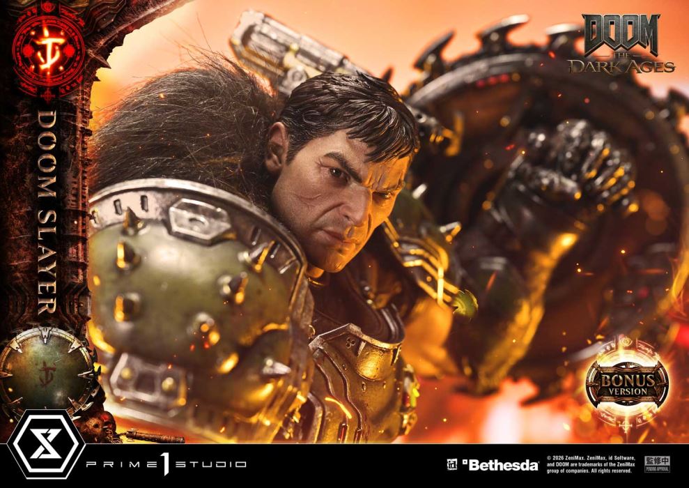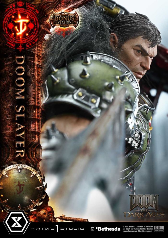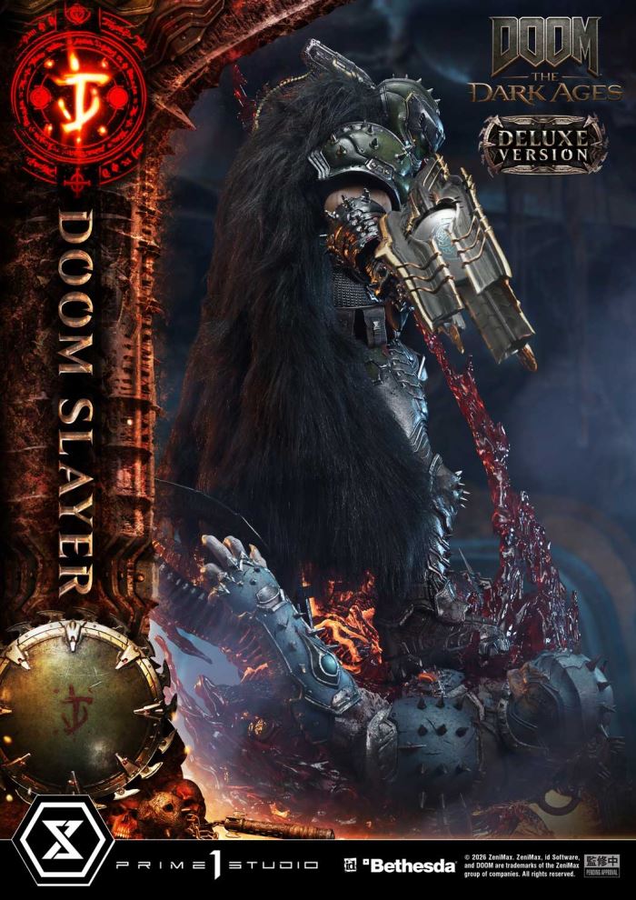 Patron Bonus PartsReceive the Flail and Imp Stalker Damaged Head as a Special GiftShatter the legions of Hell and push through the Dark Ages.The origin of the DOOM saga, expressed in 1/4 scale.From the latest entry exploring the origins of this acclaimed FPS saga, DOOM: The Dark Ages, the protagonist Doom Slayer joins the Ultimate Premium Masterline.This piece captures a split second of the Dark Ages battle against endless demon hordes in 1/4 scale. With a dynamic pose wielding the Super Shotgun and the Shield Saw, it embodies the thrill of combat—its very essence, its catharsis.Evoking dark fantasy, the armor is finished with a sinister edge down to every spike. A wild fabric cape further amplifies the intimidation of his massive proportions. In addition, the custom base piled with demon remains, along with LED units embedded throughout, heightens the brutality of the scene and the Slayer’s overwhelming presence.The Shield Saw, slicing foes in a spray of blood. Firearms such as the Pulverizer. A wide array of additional parts is included as well. By swapping the head, arms, or even the soldier’s expression beneath his feet, you can create a variety of scenes.The DX Bonus Version also comes with an unhelmeted head. Its stern gaze and battle-worn scars evoke a lone, unyielding spirit—an exclusive part for this edition.And for those who purchase both this product and the “Imp Stalker Bonus Version,” we will present a Flail and a damaged head for the Imp Stalker as a gift. This Patron Bonus lets you stage a fierce battle with the Imp Stalker; please see the separate section for details.A high-detail expression of the DOOM saga’s origin—an art piece dedicated to Slayers around the world.Specifications:DOOM SlayerTwo (2) Swappable Heads (Helmeted: Downward-Facing, Right-Facing)Two (2) Swappable Right Arms (Lowered, Horizontal)Four (4) Swappable Right Hands for Horizontal (Super Shotgun, Chainshot, Pulverizer, Cycler)Two (2) Swappable Left Arms (Shield Saw: Normal, Bloody)LED Illumination (Eyes Inside Helmet, Tether, Chainshot, Cycler)One (1) Swappable Head (Unhelmeted) [BONUS PART]DOOM: The Dark Ages-Themed Base with LED IlluminationTwo (2) Swappable Soldier Heads (Damaged, Undamaged)LED Power Supply Method: TBD* Please prepare batteries, USB cables, or other necessary items depending on the final power supply method.Patron Bonus Parts Flail and Imp Stalker Damaged Head[Patron Bonus Eligibility Conditions]Customers who purchase this product along with the eligible product from the official online store will receive the Patron Bonus Part as a free gift.Eligible Store: Prime 1 Studio Official Online StorePatron Bonus Parts: Flail and Imp Stalker Damaged Head*DOOM Slayer includes: flail-holding hand / Imp Stalker includes: damaged head, flail iron ball and chainEligible Product:- Ultimate Premium Masterline DOOM: The Dark Ages Imp Stalker Bonus Version*Please note: If your order for an eligible product is canceled, you will no longer be entitled to receive the Patron Bonus.*We will contact those who are eligible for the Patron Bonus at a later date. Notice:Prototype samples shown.Product details could be subject to change without further notice.Please note the final product specifications may differ because each product is Handmade.Since the product is still in the development stage, the Size (up to 10%) & Weight (up to 10kg) may be changed during the production stage.© 2026 ZeniMax. ZeniMax, id Software, and DOOM are trademarks of the ZeniMax group of companies. All rights reserved.DETAILSBrandsPRIME 1 STATUECollectionUltimate Premium MasterlineSeriesDoomScale1/4 ScaleProduct CodeUPMDOOM-01DXSProduct Size Approx.H:77cm W:65cm D:49cmH:75cm W:70cm D:49cm (Horizontal Right Arm)Carton(Est):2 boxProduct Weight Approx.18.8kgCarton Size Approx.Carton A [ H 62cm × W 57cm × D 48cm ]Carton B [ H 80cm × W 57cm × D 52cm ]MaterialsPolystone and other materialsJAN4582647123336
