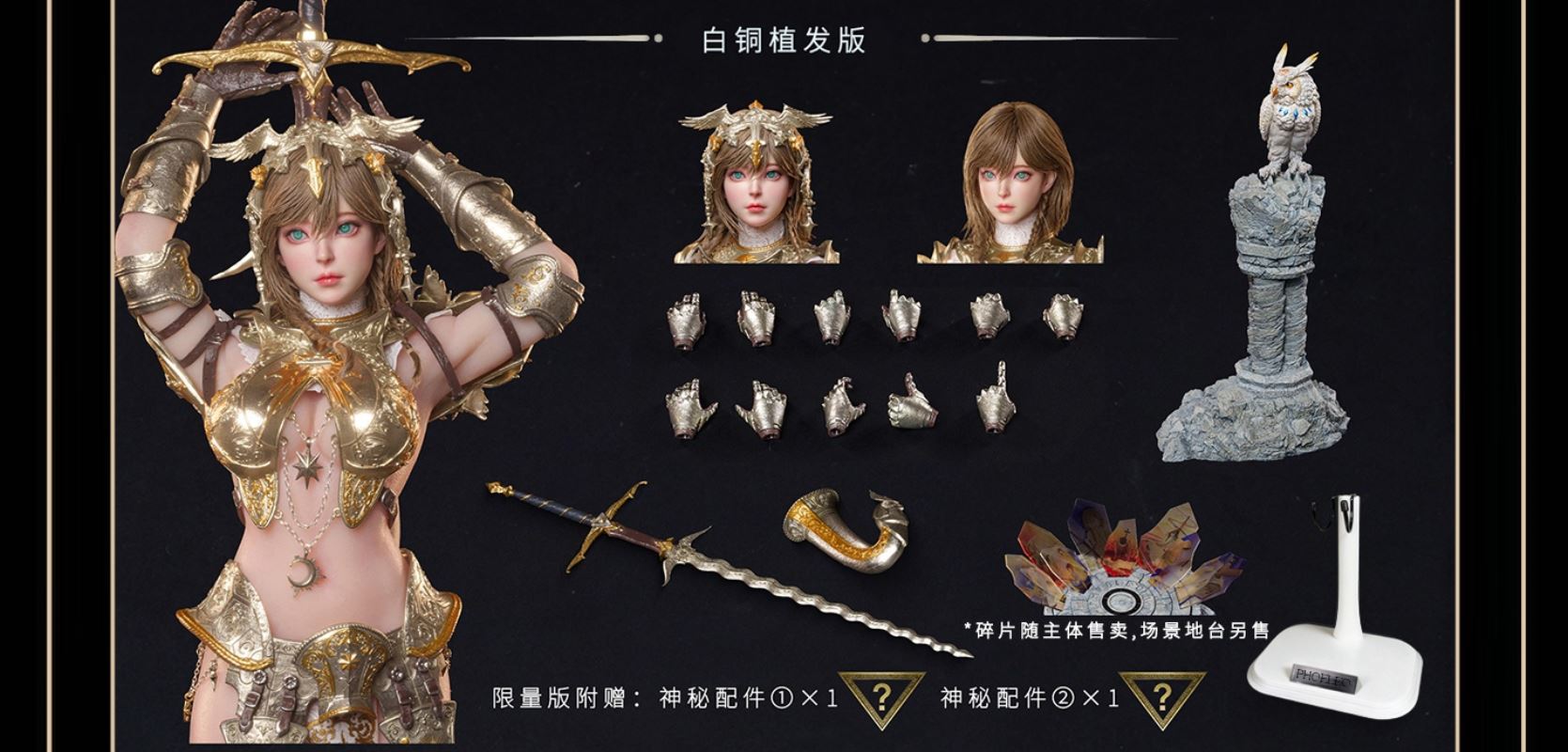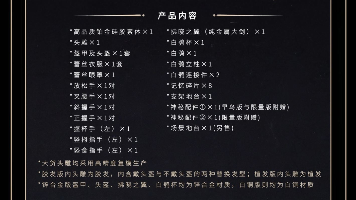 Zinc Alloy Rooted Hair Ver. (EarlyBird)High-Quality Platinum SiliconeBody × 1;Head Sculpt × 1;Armor & Helmet × 1 Set;Lace Outfit × 1 Set;Lace Eye Mask × 1;Relaxed Hands × 1 Pair;Hands on Hips × 1 Pair;Tilted Grip Hands × 1 Pair;Straight Grip Hands × 1 Pair;Left Cup-Holding Hand × 1;Left Thumbs-Up Hand × 1;Left Index Finger Pointing Hand × 1;Wings of Dawn(SolidMetalGreatsword) ×1;White Owl Cup×1;White Owl ×1;White Owl StandColumn×1;White Owl Connectors×2;Memory Shards ×8;Display StandBase×1;Mystery Accessory×1