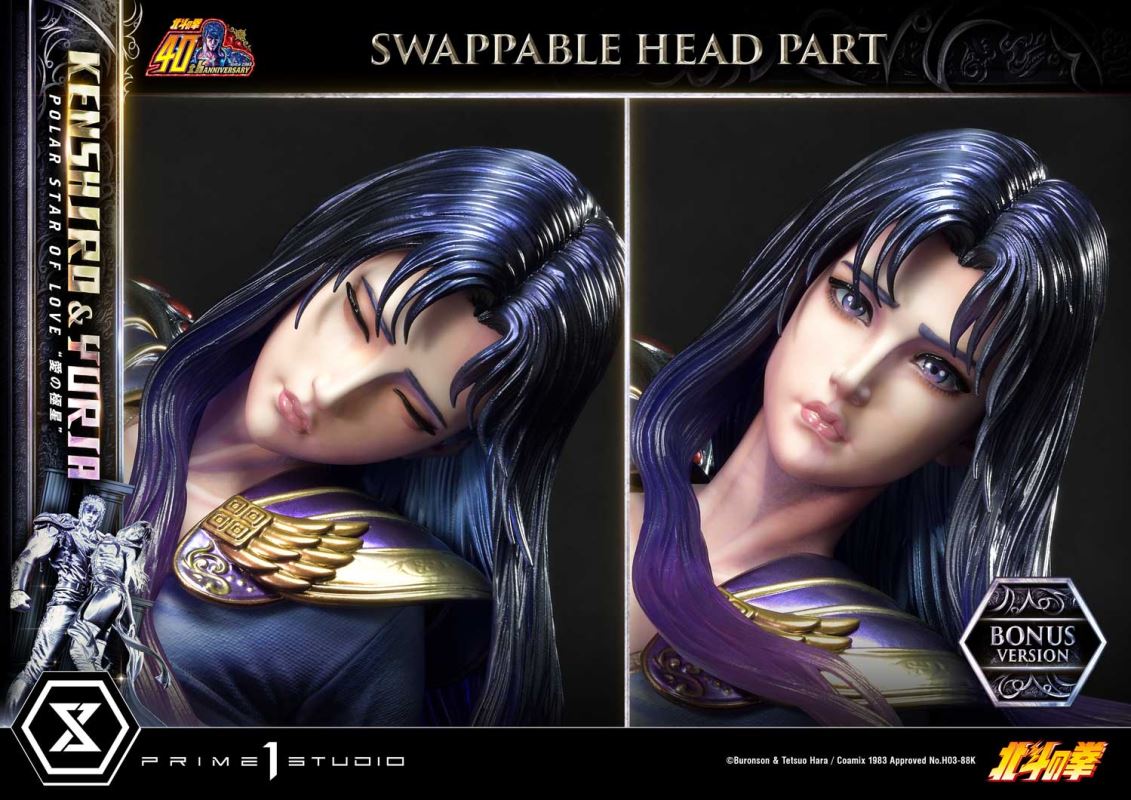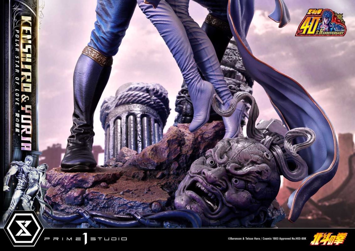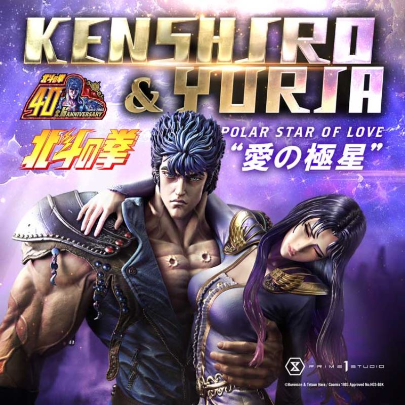 “Yuria, even if the world crumbles, even if the heavens deny me, my fists will carve a path to you. I will not let anything stand in my way. Our love will transcend the chaos.”Prime 1 Studio is proud to present, in commemoration of the series’ 40th anniversary, one of Japan’s most iconic manga couples. From the Ultimate Premium Masterline: it’s UPMFOTNS-01S Kenshiro & Yuria “Polar Star of Love” Bonus Version from Fist of the North Star.Fist of the North Star, also known as Hokuto no Ken in Japan, is a classic manga series first published back in 1983 by writer Buronson and artist Tetsuo Hara. Set in a post-apocalyptic world where society has collapsed, and violence reigns. Early in the series, our protagonist Kenshiro finds himself separated from his beloved fiancée Yuria. He then embarks on a quest to rescue her from the clutches of evil. The artists at Prime 1 Studio have come together to put out a mesmerizing statue that perfectly depicts the depth of their love for each other; a love story that can be described as tragic and bittersweet, full of obstacles yet full of hope.At almost 28 inches tall, one can easily recognize Kenshiro’s muscular physique! Finally reunited with Yuria, after a long and arduous chase. He holds her firmly in his embrace and stands ready to face any opponent that may come as he flexes his large, V-shaped upper body. Determined to protect her with all his might, he clenches his fist firmly, displaying long veins along his right arm. His distinctive Big Dipper constellation scars can be seen on his well-developed upper chest. He bears an intense gaze as the fire in his heart burns bright in this dark world. The beautiful Yuria has her arm wrapped behind Kenshiro’s neck, she has her eyes closed, fair skin, and soft pink lips, she remains just as gracious as ever. While still in a weakened state, her slender figure still embodies a delicate and refined demeanor, a true display of feminine beauty and elegance! Our skillful painters have done an outstanding job recreating the fading of her hair color from black to violet. The vivid contrast between the characters’ blue and purple is painted with the utmost attention to detail as it perfectly portrays the way they were both masterfully drawn in the original manga while still giving them a breath of life through realistic texturization. The base features remnants of destroyed pillars as well as the head of one of the Four Heavenly Kings.And when you order the Bonus Version from our official store or any authorized distributor, you will receive an exclusive bonus part. It’s an additional swappable head part where Yuria’s eyes are open, letting us gaze into her bright violet pupils.Named by Tetsuo Hara himself, after the everlasting love between Ursa Major and Ursa Minor constellations, the UPMFOTNS-01S Kenshiro & Yuria “Polar Star of Love” Bonus Version will be a fine addition to your collection. Whether you are a new or long-time fan of Fist of the North Star, order now in the name of unyielding love!Specifications:Fist of the North Star-themed baseOne (1) swappable Yuria head part [BONUS PART]Notice:Prototype samples shown.Product details could be subject to change without further notice.Please note the final product specifications may differ because each product is Handmade.Since the product is still in the development stage, the Size (up to 10%) & Weight (up to 10kg) may be changed during the production stage.©武論尊・原哲夫/コアミックス 1983, 版権許諾証 H03-88KDETAILSBrandsPRIME 1 STATUECollectionUltimate Premium MasterlineSeriesFist of the North StarScale1/4 ScaleProduct CodeUPMFOTNS-01SProduct Size Approx.H:71cm W:39cm D:43cmPackage Weight Approx.About 20 kgMaterialsPolystone and other materialsJAN4580708047836