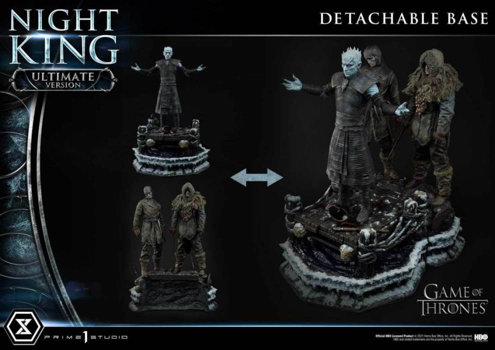 Descriptions“The true enemy won’t wait out the storm. He brings the storm.” – Jon SnowPrime 1 Studio is proud to present the latest addition to the Ultimate Premium Masterline Series: UPMGOT-02UT: Night King Ultimate Version from Game of Thrones!The Massacre at Hardhome.Prime 1 Studio brings you an epic statue from this watershed moment in the Game of Thrones series, where the Night’s Watch and Freefolk fought against the White Walkers and their wights. And as Jon Snow made his escape after that brutal devastation, the Night King appeared on the Hardhome dock, raised his arms, and resurrected his wights.And now, our talented sculptors and painters bring to you, that pivotal scene. Standing at over 27 inches on an icy, ramshackle dock, the Night King postures in all his chilling splendor. We have taken care to carve all the intricate details of his wrinkled façade, his ominous stare, and his decrepit, battle-worn armor. We have rendered a faint dusting of snowfall on choice locations all over the Night King’s form to call to mind the frigid Hardhome conditions brought about by his mere presence.In this Ultimate Version, flanking the Night King behind him, are two of his resurrected wights. We spared no effort to bring these figures to life, whose exacting details underscore the terrifying nature of these undead creatures. From top to bottom, we have imbued jaw-dropping realism to these figures from the fabric detailing of their clothes, the withered, frozen attributes of their faces and chain mail armor. Stark splashes of dried blood on their hands and weapons round out the blood-chilling scene.Combine the Ultimate Version Wights with the main Night King base for an exceptional set piece. All these gory figures are well-balanced on the Hardhome dock-inspired base that comes together to feature the ancient wooden moor, creepy skeletal remains, discarded weapons and armor...and frozen, translucent waters.We at Prime 1 Studio cannot wait for all the hardcore Game of Thrones fans to get their hands on these striking Premium Ultimate statues!Specifications:Screen-accurate detailing on the whole Night King statueTwo (2) Intricately designed Wights with unique features, on a separate detachable baseHardhome Dock-themed Base with Skulls and Icy, Translucent WatersNotice:Prototype samples shown.Product details could be subjected to change without further notice.Please note the final product specifications may differ because each product is Handmade.Since the product is still in the development stage, the Size (up to 10%) & Weight (up to 10kg) may be changed during the production stage.Official HBO Licensed Product © 2021 Home Box Office, Inc. All Rights Reserved. HBO and related trademarks are the property of Home Box Office, Inc.