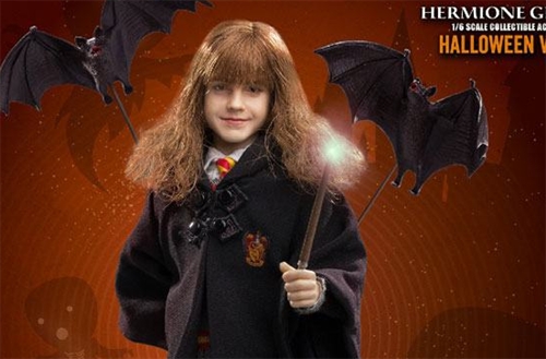 Star Ace Toys brings Halloween to the Wizarding World with Halloween versions of the most popular 1:6 scale figures from Harry Potter.The first year Hermione Granger figure comes with her wand and cat, Crookshanks, and a variety of Halloween accessories. Flying bats (with wire supports), a bag of treats, and a stack of Jack O’Lanterns will make an exciting Hogwarts Halloween display. A large Jack O’Lantern can also be used as a substitute head for a spooky holiday disguise and another Jack O’Lantern sits on a light-up base for a haunting good time.The Hermione Granger Sixth Scale Collectible Figure specially features:– Authentic and detailed fully realized likeness of Hermione Granger in Harry Potter and the Sorcerer’s Stone– 1/6th scale body with articulation, approximately 25 cm tall– Accurate facial expression with detailed skin texture– Each head sculpt is specially hand-paintedLimited to 250 pieces worldwide.