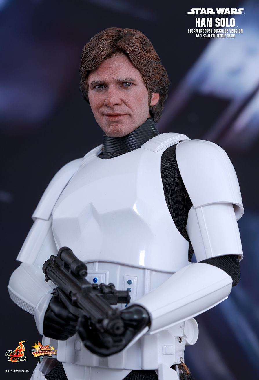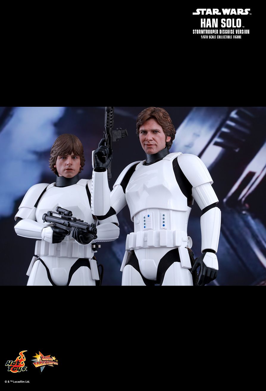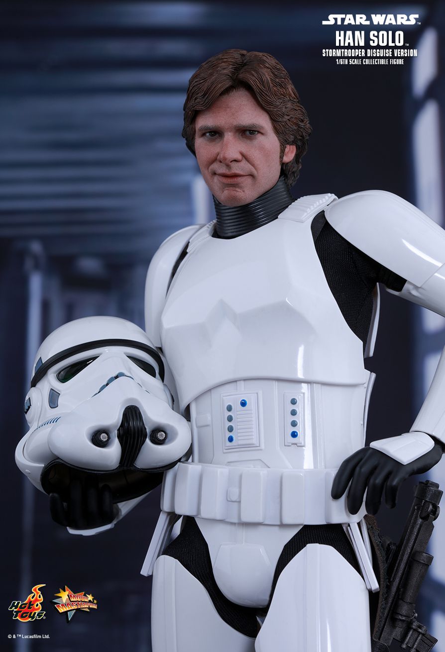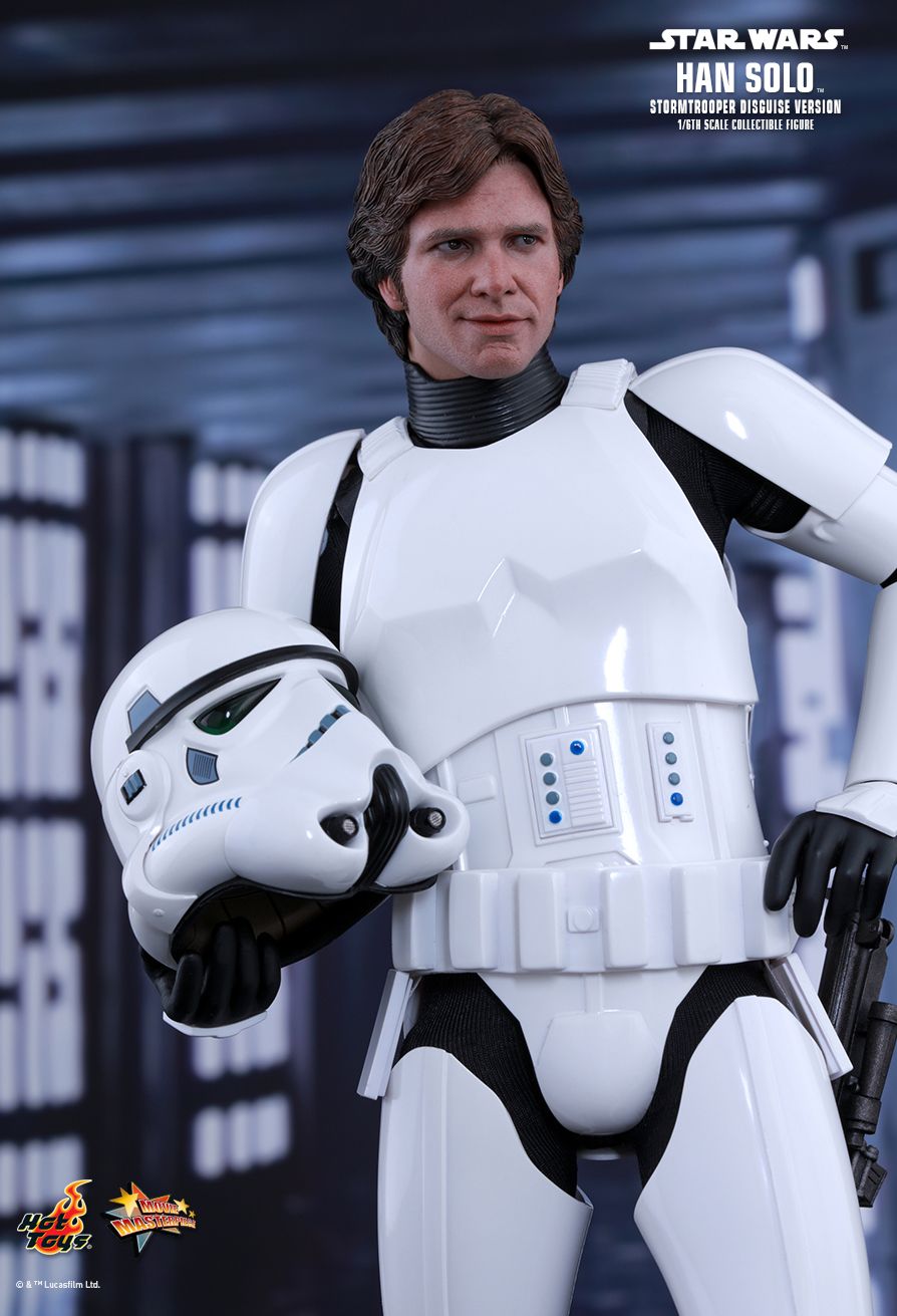 ABOUT THIS SIXTH SCALE FIGUREOriginally a smuggler, Han Solo’s life has changed after his encounter with Luke Skywalker and Obi-Wan Kenobi where he assisted the young Luke Skywalker on the Death Star to save Princess Leia from a terrible fate and took on a new path to become a great hero of the Rebel Alliance. In Star Wars: Episode IV A New Hope, Han Solo disguised himself as a Stormtrooper to infiltrate the detention center where the Princess was held captive. Sideshow and Hot Toys are excited to present an all-new sixth scale collectible figure of Han Solo in this memorable scene as an exclusive item only available in selected markets.The highly-accurate collectible figure is specially crafted based on the image of Harrison Ford as Han Solo disguised as a Stormtrooper in Star Wars: Episode IV A New Hope. It features a newly developed head sculpt, finely tailored Stormtrooper armor, an interchangeable Stormtrooper helmet with a mechanically detailed interior, blaster rifle, a set of binders, figure stand, and a specially designed Death Star wall panel diorama backdrop with LED light-up function!Star Wars fanatics shouldn’t pass up on the opportunity to add this special version of Han Solo figure to your treasured collection!LicenseStar WarsTypeSixth Scale FigureManufacturerHot ToysArtistsKojun (Head Sculpt)JC. Hong (Head Paint and Art Direction)WHAT'S IN THE BOX?The Han Solo (Stormtrooper Disguise Version) Sixth Scale Collectible Figure specially features:A newly developed head sculpt with authentic and detailed likeness of Harrison Ford as Han Solo in Stormtrooper disguise as seen in Star Wars: Episode IV A New HopeMovie-accurate facial expression with detailed skin textureBody with over 30 points of articulationApproximately 30 cm tallEight (8) interchangeable gloved hands including: - One (1) pair of fists - One (1) pair of relaxed hands - One (1) pair of hands for holding weapons - One (1) right hand for holding communicator - One (1) gesturing left handEach head sculpt is specially hand-paintedCostume:One (1) finely crafted Stormtrooper armorOne (1) black under-suitOne (1) Stormtrooper belt with blaster holsterOne (1) pair of white bootsWeapons:One (1) blaster rifleOne (1) thermal detonator (on back of belt)Accessories: One (1) interchangeable Stormtrooper helmet with mechanical details insideOne (1) set of bindersOne (1) communicatorSpecially designed figure stand and Death Star wall panel diorama backdrop with LED light-up function (white light, battery operated)ADDITIONAL DETAILS & DIMENSIONSExpected to ShipJan 2018 - Mar 2018Item shown is a prototype. When shipped, the final production piece may differ in appearance.Product Size11.81 H (299.97mm)*Dimensional WeightTBDInt'l Dim. WeightTBD* Size and weight are approximate values.SKU902990UPC4897011183008© & ™ Lucasfilm Ltd. © 2017 Hot Toys Limited. All Rights Reserved.