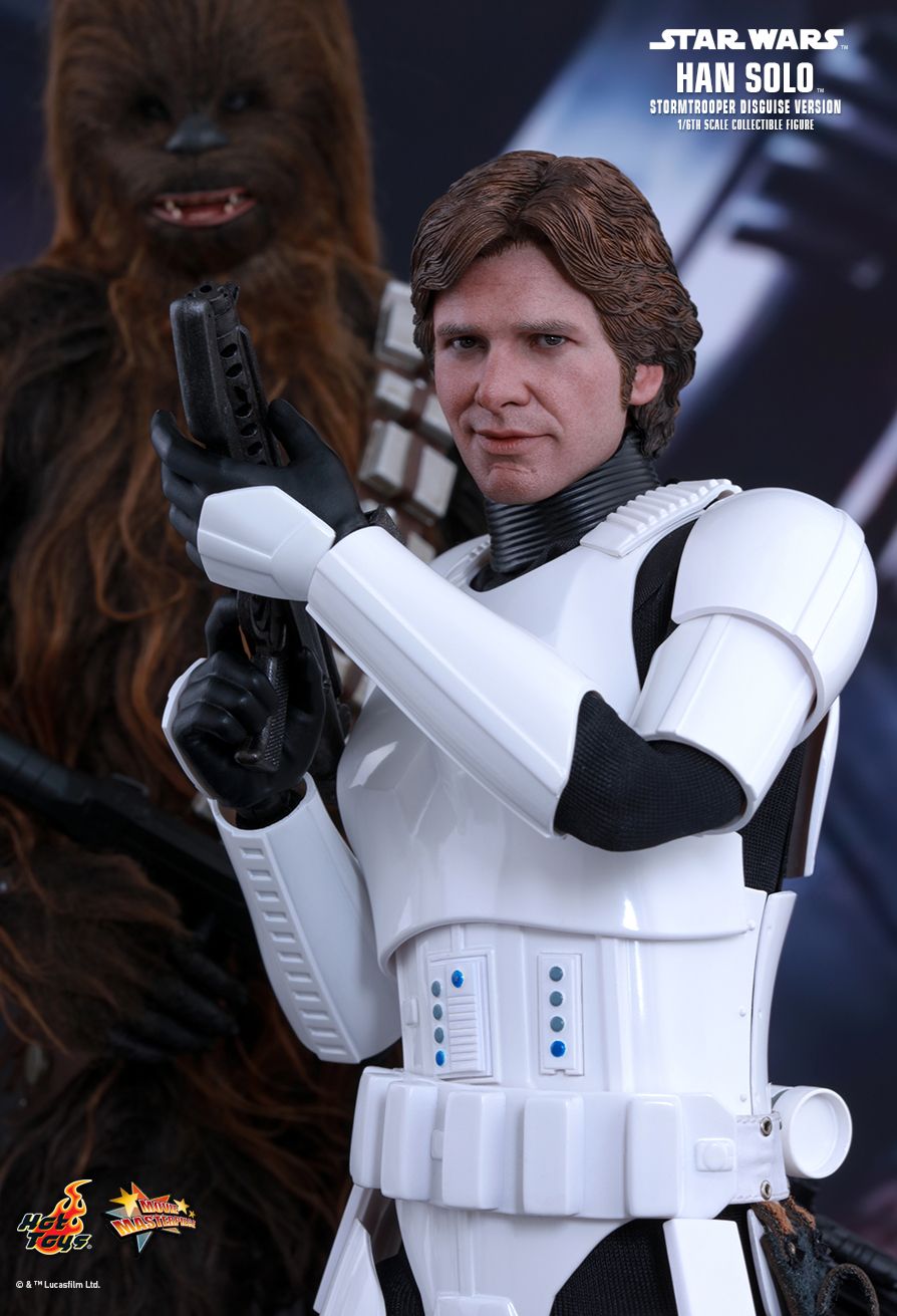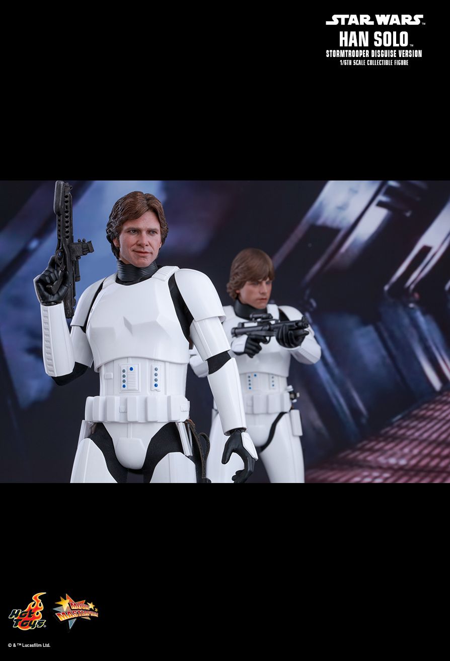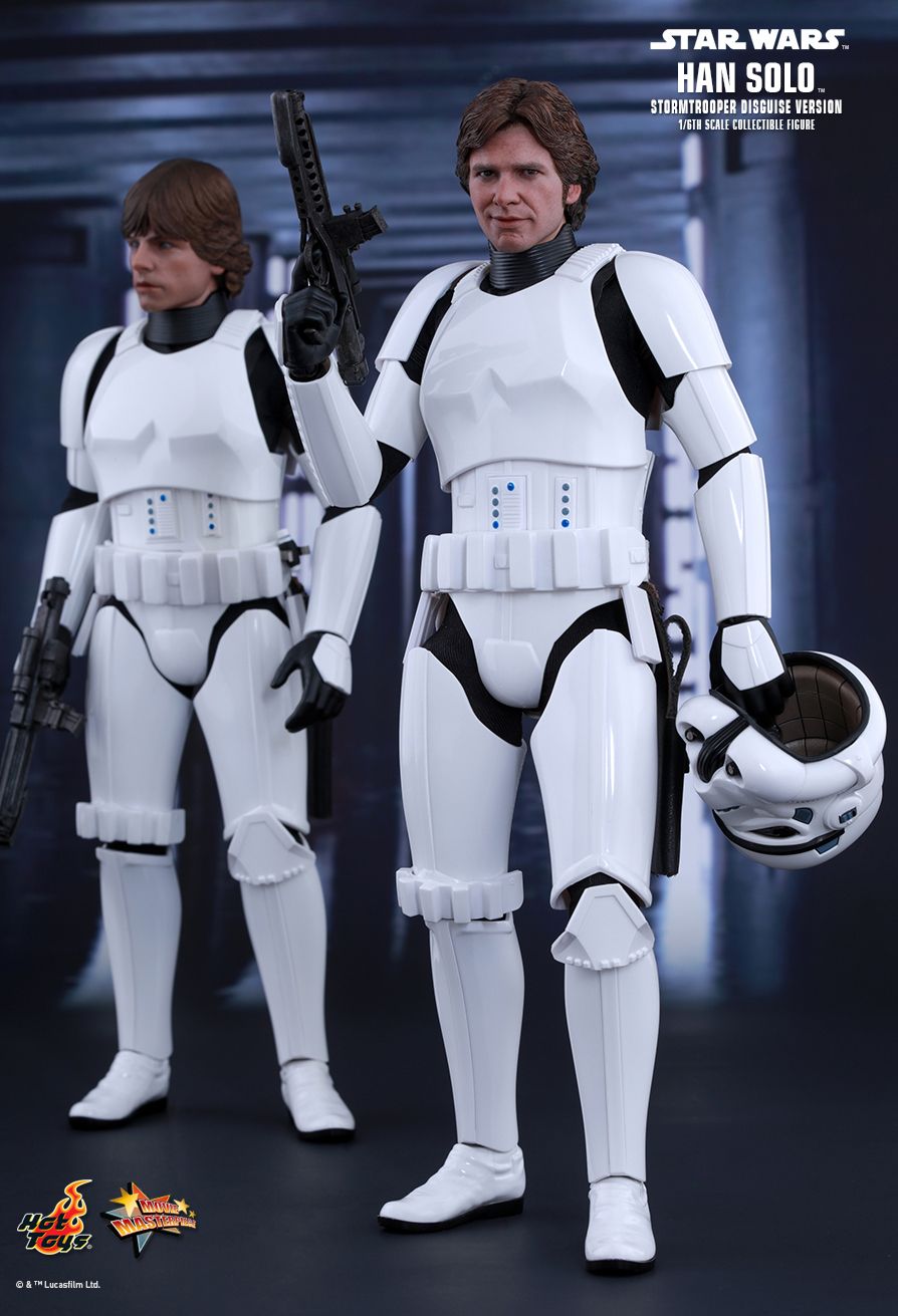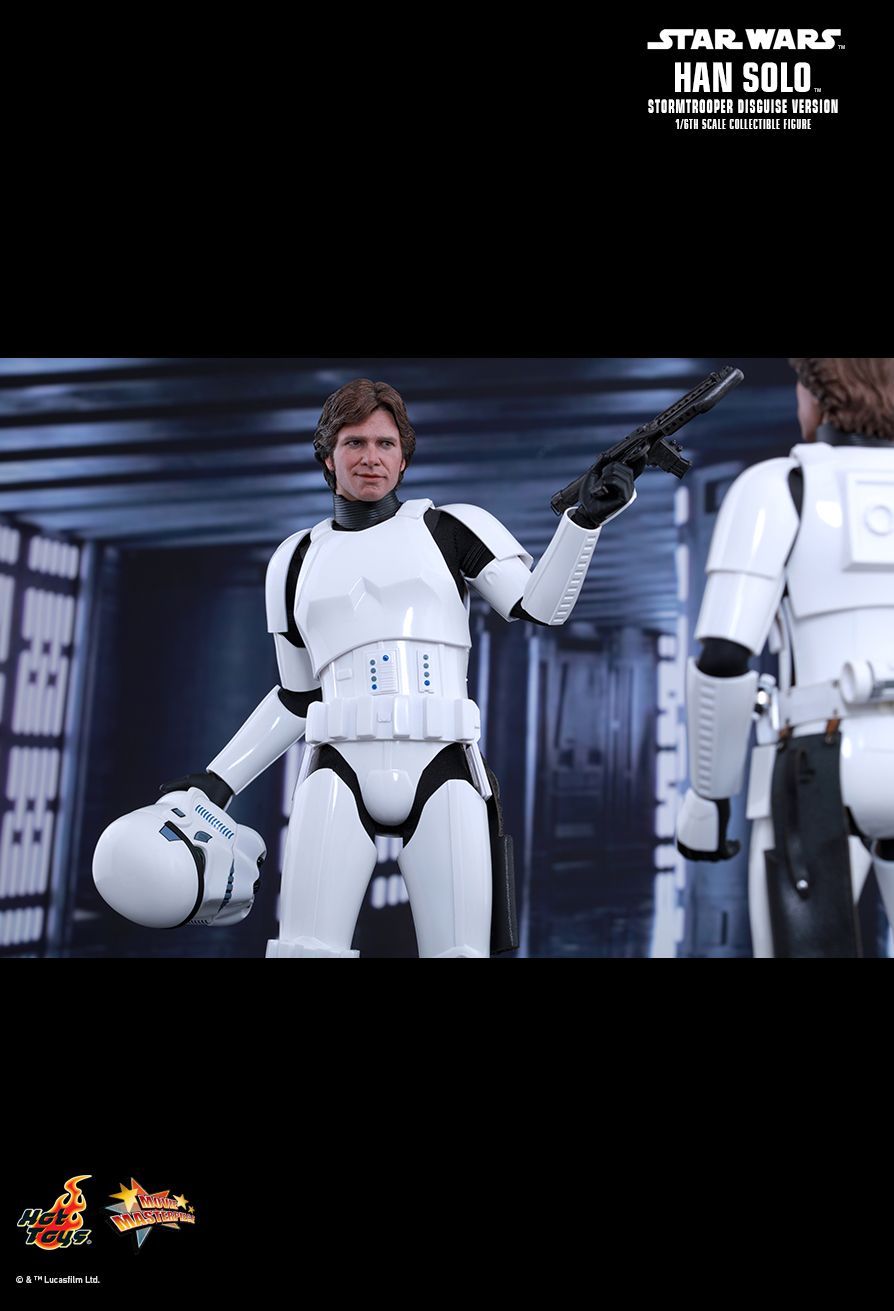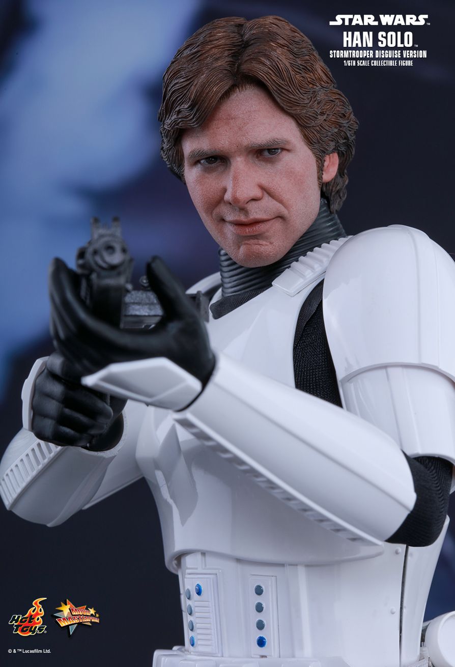 ABOUT THIS SIXTH SCALE FIGUREOriginally a smuggler, Han Solo’s life has changed after his encounter with Luke Skywalker and Obi-Wan Kenobi where he assisted the young Luke Skywalker on the Death Star to save Princess Leia from a terrible fate and took on a new path to become a great hero of the Rebel Alliance. In Star Wars: Episode IV A New Hope, Han Solo disguised himself as a Stormtrooper to infiltrate the detention center where the Princess was held captive. Sideshow and Hot Toys are excited to present an all-new sixth scale collectible figure of Han Solo in this memorable scene as an exclusive item only available in selected markets.The highly-accurate collectible figure is specially crafted based on the image of Harrison Ford as Han Solo disguised as a Stormtrooper in Star Wars: Episode IV A New Hope. It features a newly developed head sculpt, finely tailored Stormtrooper armor, an interchangeable Stormtrooper helmet with a mechanically detailed interior, blaster rifle, a set of binders, figure stand, and a specially designed Death Star wall panel diorama backdrop with LED light-up function!Star Wars fanatics shouldn’t pass up on the opportunity to add this special version of Han Solo figure to your treasured collection!LicenseStar WarsTypeSixth Scale FigureManufacturerHot ToysArtistsKojun (Head Sculpt)JC. Hong (Head Paint and Art Direction)WHAT'S IN THE BOX?The Han Solo (Stormtrooper Disguise Version) Sixth Scale Collectible Figure specially features:A newly developed head sculpt with authentic and detailed likeness of Harrison Ford as Han Solo in Stormtrooper disguise as seen in Star Wars: Episode IV A New HopeMovie-accurate facial expression with detailed skin textureBody with over 30 points of articulationApproximately 30 cm tallEight (8) interchangeable gloved hands including: - One (1) pair of fists - One (1) pair of relaxed hands - One (1) pair of hands for holding weapons - One (1) right hand for holding communicator - One (1) gesturing left handEach head sculpt is specially hand-paintedCostume:One (1) finely crafted Stormtrooper armorOne (1) black under-suitOne (1) Stormtrooper belt with blaster holsterOne (1) pair of white bootsWeapons:One (1) blaster rifleOne (1) thermal detonator (on back of belt)Accessories: One (1) interchangeable Stormtrooper helmet with mechanical details insideOne (1) set of bindersOne (1) communicatorSpecially designed figure stand and Death Star wall panel diorama backdrop with LED light-up function (white light, battery operated)ADDITIONAL DETAILS & DIMENSIONSExpected to ShipJan 2018 - Mar 2018Item shown is a prototype. When shipped, the final production piece may differ in appearance.Product Size11.81 H (299.97mm)*Dimensional WeightTBDInt'l Dim. WeightTBD* Size and weight are approximate values.SKU902990UPC4897011183008© & ™ Lucasfilm Ltd. © 2017 Hot Toys Limited. All Rights Reserved.