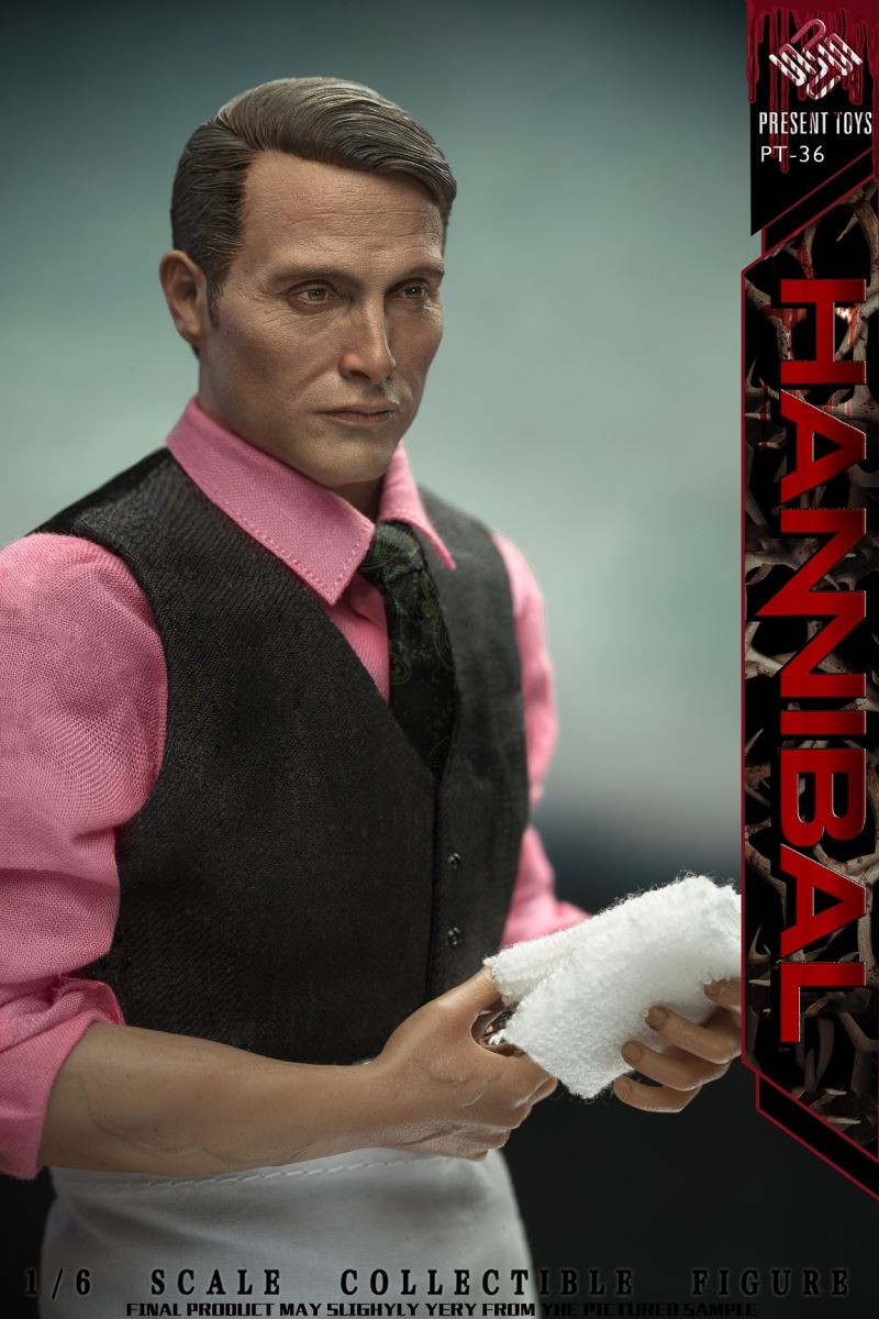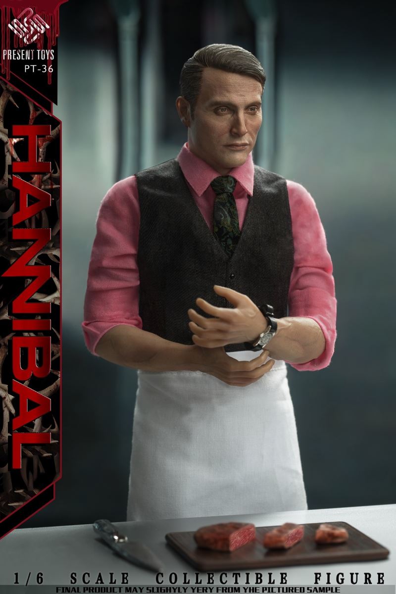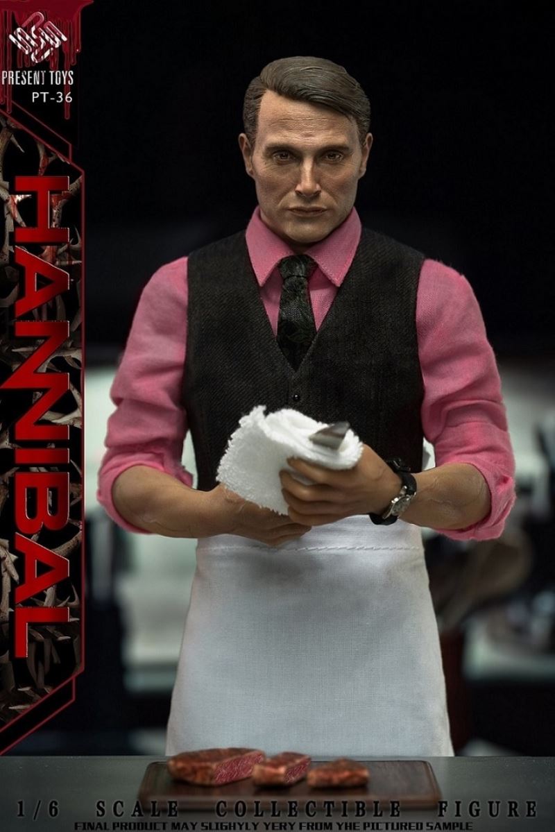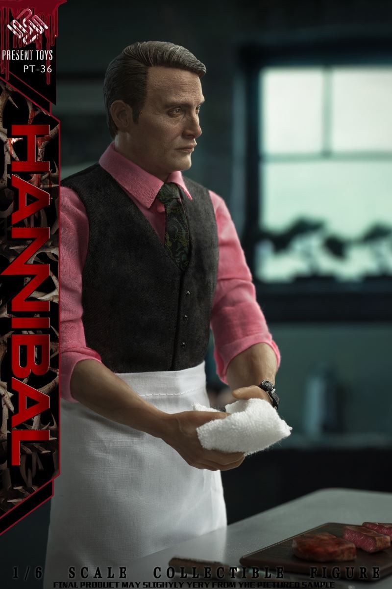 PRESENT TOYS New Product: 1:6 collectible toy – HannibalPRESENT TOYS is proud to release a new product: 1:6 collectible toy – Hannibal.Product Specs:Name: HannibalProduct Number: PT-sp36Scale: 1/6Official price:880 RMBProduct List:Head sculpture *1 Articulated body*1Arm*4Chef table * 1Chopping board * 1Chef knife * 1Steak*3Watch * 1Towel*1Exclusive platform*1Costume:Shirt * 1Vest * 1Tie * 1Trousers * 1Chef apron * 1Leather shoes * 2Estimate release date 2022 2nd-3rd quarter(subject to the actual delivery time of the manufacturer.)