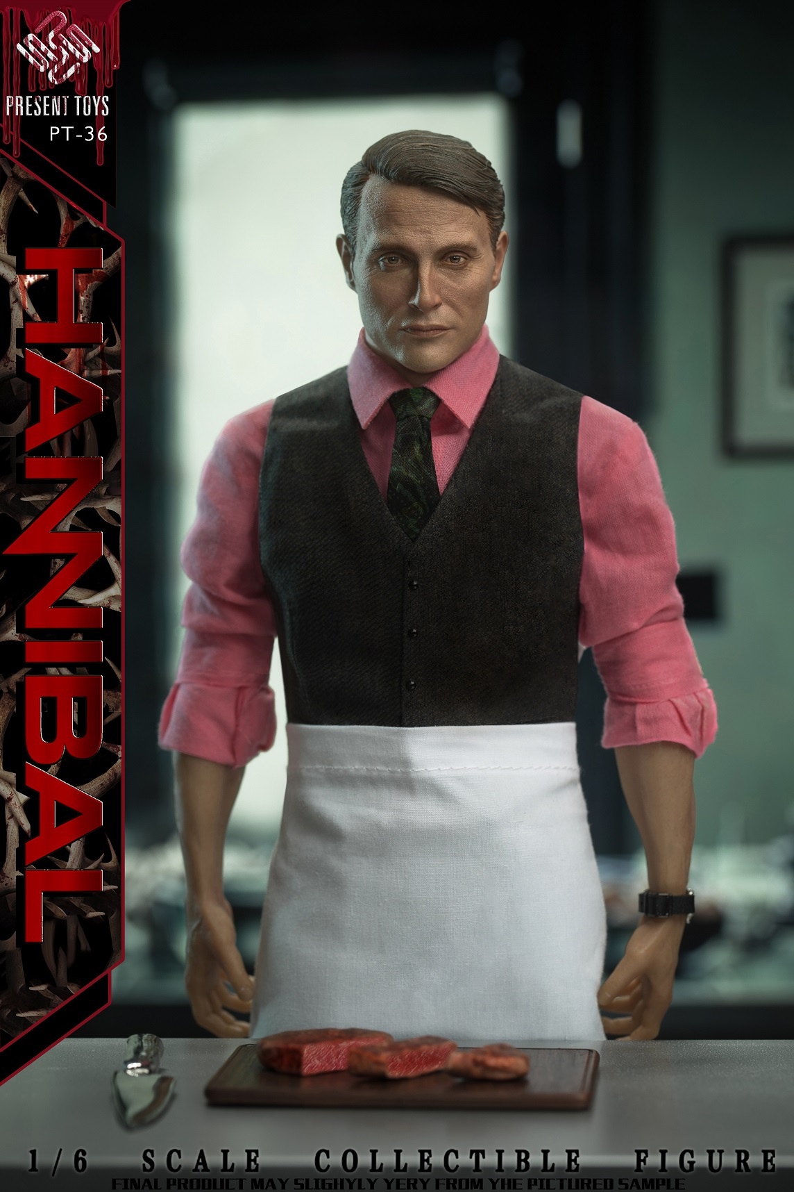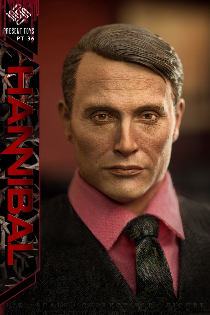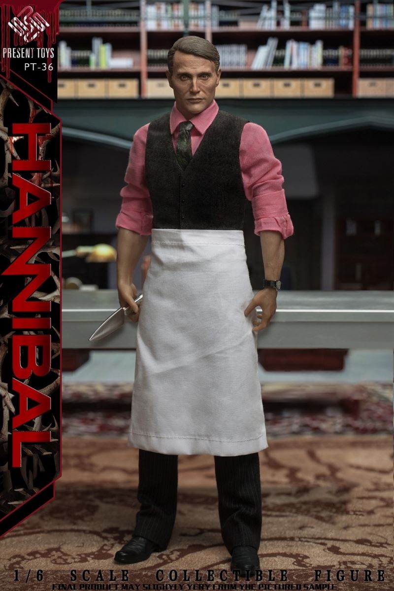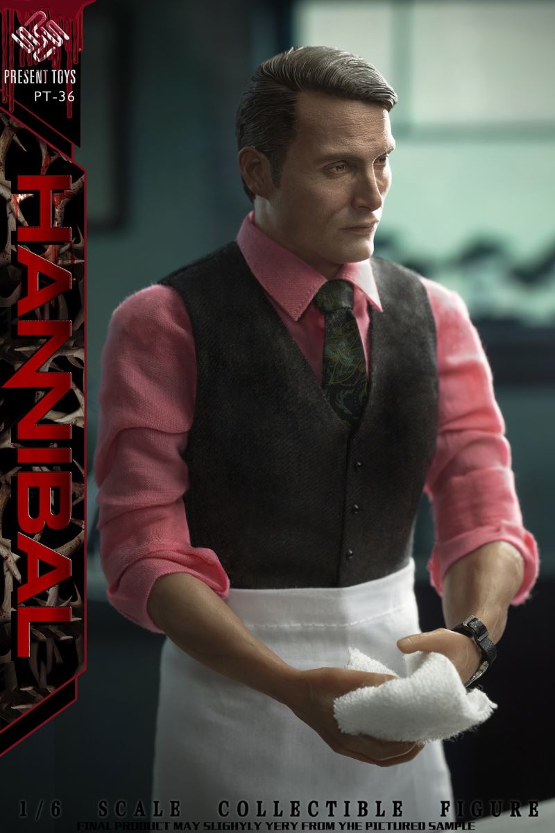 PRESENT TOYS New Product: 1:6 collectible toy – HannibalPRESENT TOYS is proud to release a new product: 1:6 collectible toy – Hannibal.Product Specs:Name: HannibalProduct Number: PT-sp36Scale: 1/6Official price:880 RMBProduct List:Head sculpture *1 Articulated body*1Arm*4Chef table * 1Chopping board * 1Chef knife * 1Steak*3Watch * 1Towel*1Exclusive platform*1Costume:Shirt * 1Vest * 1Tie * 1Trousers * 1Chef apron * 1Leather shoes * 2Estimate release date 2022 2nd-3rd quarter(subject to the actual delivery time of the manufacturer.)
