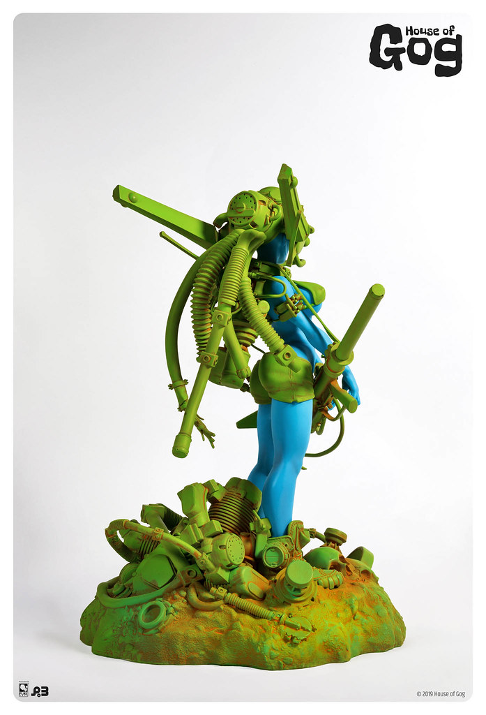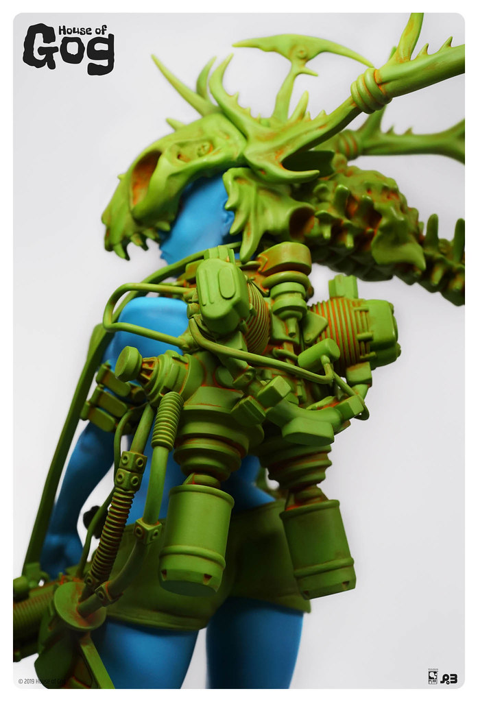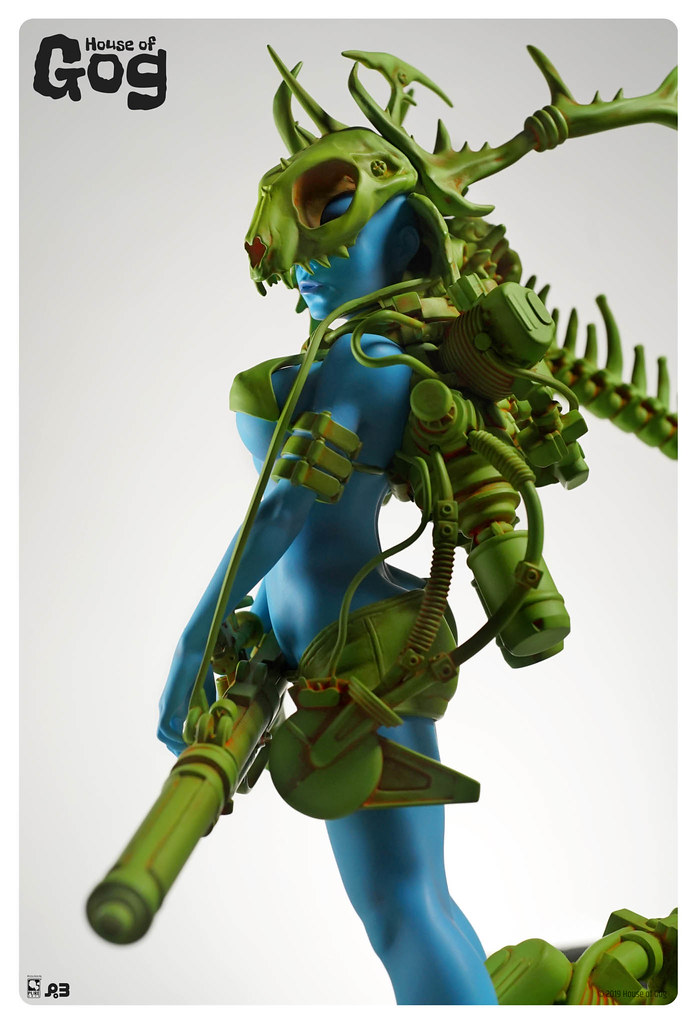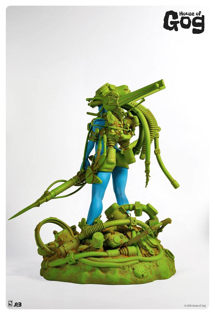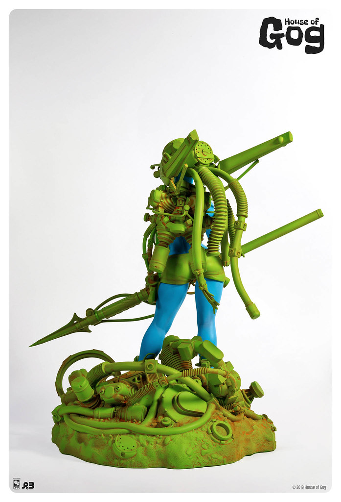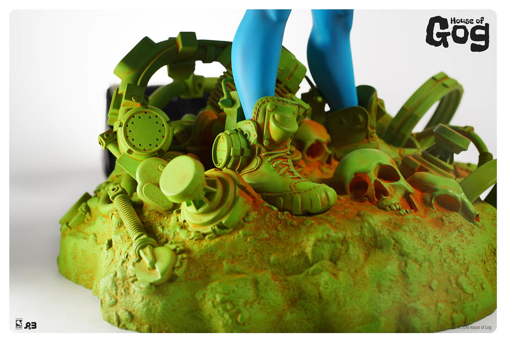 ความสูงนี้อยู่ที่ 40.6 ซม. ซึ่งแสดงให้เห็นถึงรายละเอียดของอุปกรณ์ Pascal Blanch?สีและไอน้ำสไตล์พังก์ที่สมบูรณ์ ร่างกายของ Dodge Blue มีเส้นกล้ามเนื้อแข็งแรงและหน้าอกที่เต็มไปด้วยเลือดหมวกกันน็อคแบบดั้งเดิม เสื้อผ้ากระเป๋าเป้สะพายหลังและอาวุธจะถูกนำเสนอในสีเขียวชอุ่ม พวกเขายังสามารถเห็นสีสนิมทุกที่ ฐานเกลื่อนไปด้วยหัวกะโหลกและซากเครื่องจักรกลมากมายซึ่งแสดงให้เห็นถึงความพินาศของดินแดนรกร้างอย่างแนบเนียน