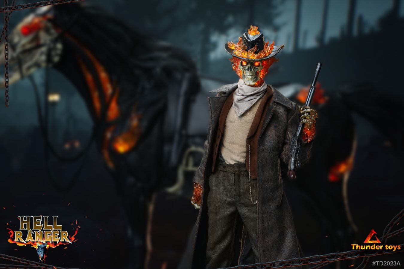 Thunder Toys : 1/6 Hell Ranger #TD2023(A/B/C)A:Head A x 1Body x 1Windbreak x1T-shirt x 1Strap: x 1Scarf:x1Pants x 1Shoes x 1 pairGhost hands x pairLong gun x 1Pocket watch(metal) x 1Stand x 1 Order close date 28th Sep 2021Delivery 1st quarter of 2022=============TD2023B:Head A x 1Head B x 2Body x 1Hat x 1Windbreak x 1T-shirt x 1Pants x 1Scarf:x1Back straps x 1Shoes x 1 pairGhost hands 1 pairNormal hands x 1 pairLong gun x 1Shovel x 1Pocket watch (metal) x 1Breeches x 1Stand x 1=============TD2023C - Horse :Horse x 1 (high quality resin + lighting function) USB power supplyLeather harness x 1Order close date 28th Sep 2021Delivery 1st quarter of 2022