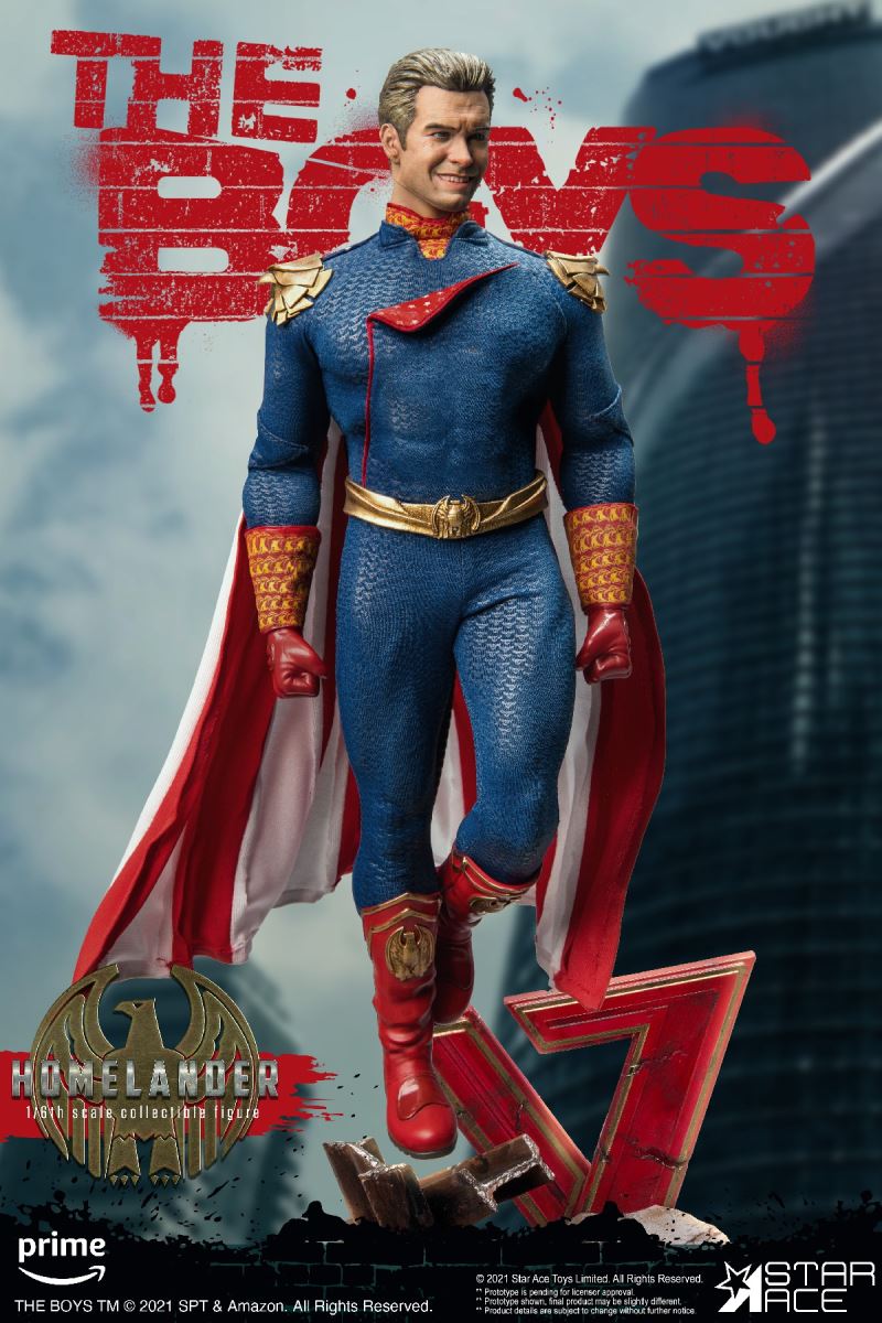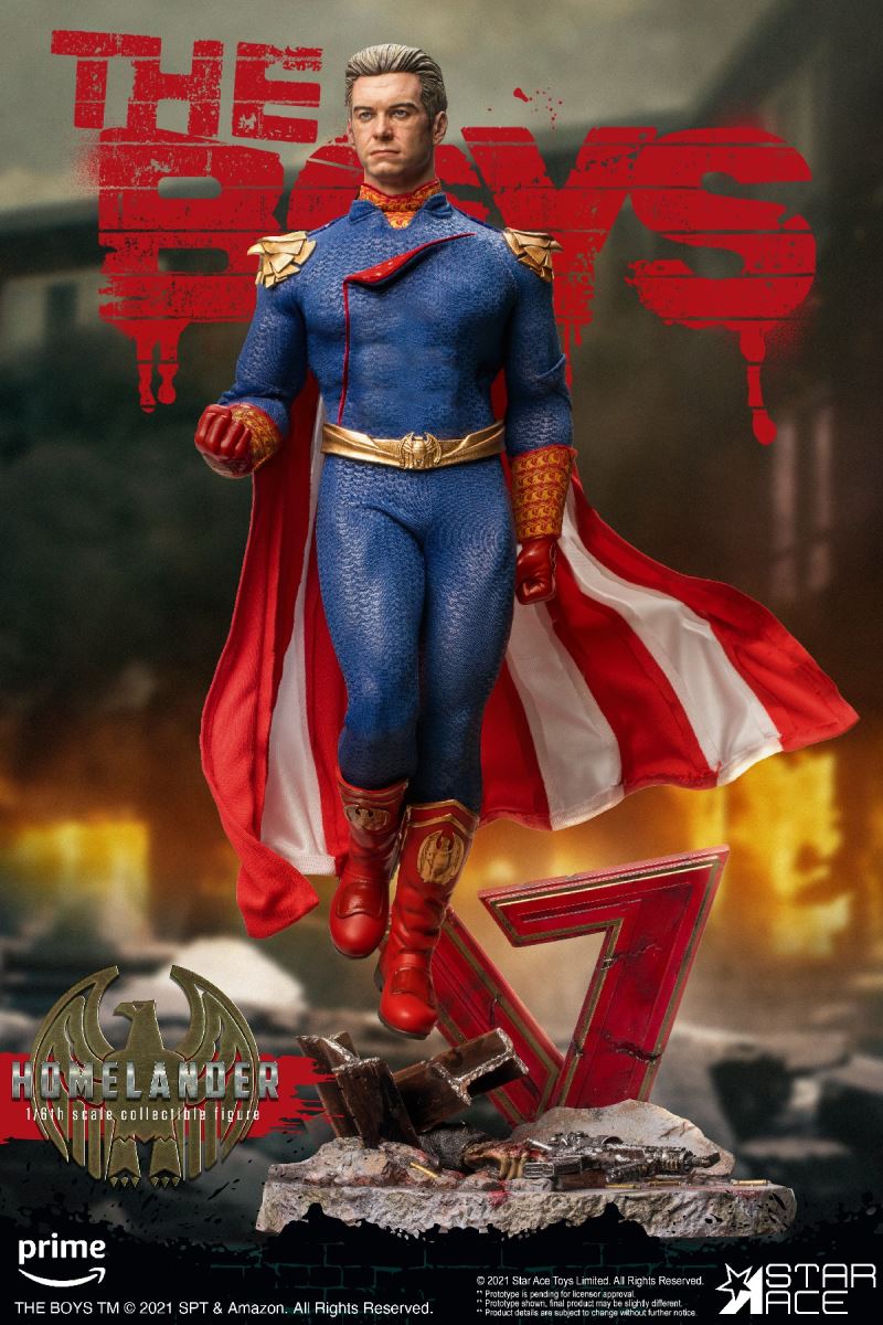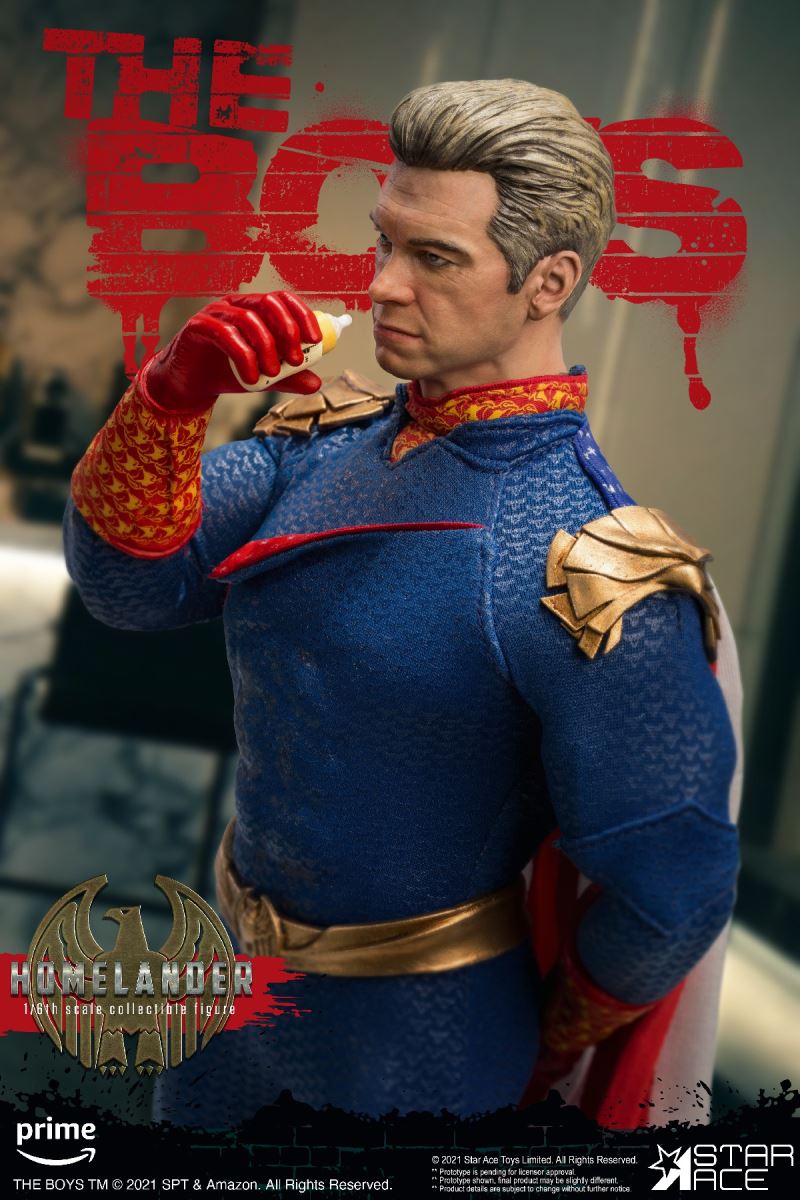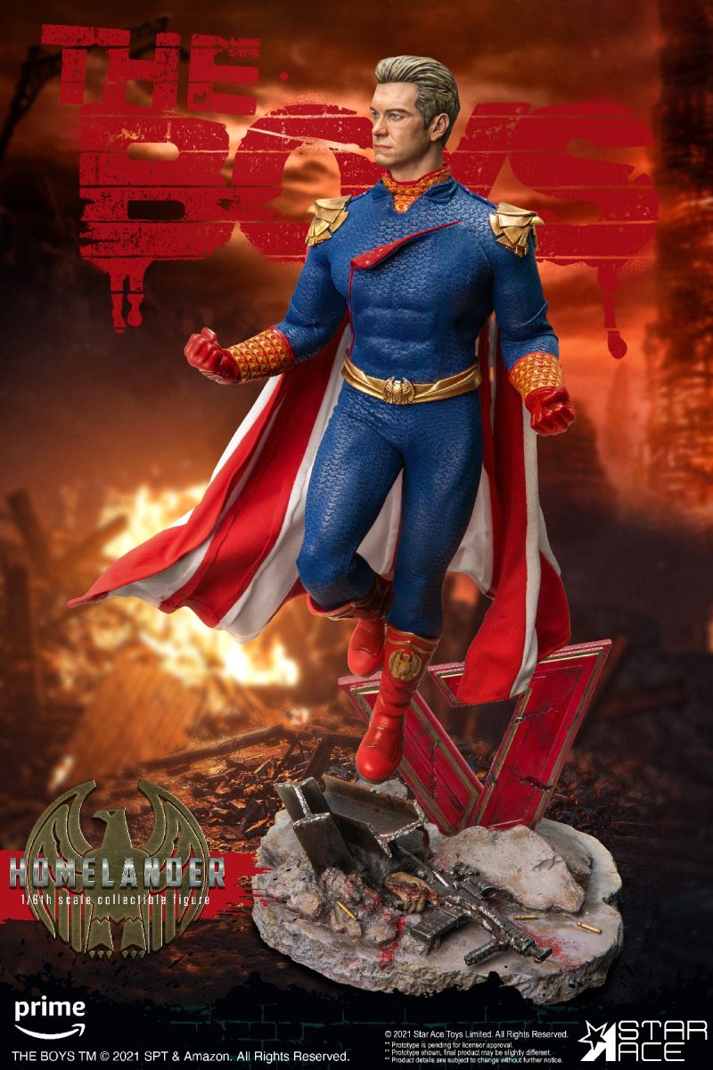 Product Code SA0106 / SA0107 / SA0108A0106 Homelander (Deluxe Edition)SA0107 Homelander (Normal Edition)SA0108 Homelander (Situational Platform)Ratio 1/6 (Height about 30 cm)Movie The Boys Black Robe Picket Team (TV series) 2019series MY FAVOURITE MOVIE SERIES series1/6 Homelander (Deluxe Edition/ Normal Edition/ Scenery Platform) Activity dolls include:-1/6 movable body, about 30 cm in height-One has more than one Articulated movable body-extremely realistic, realizing the role of Anthony Starr Anthony Starr in the TV series The Boys Black Pickets 2019 as Homelander-has a delicate and realistic image Homelander Head Sculpture1. Head Sculpture-1 Homelander head sculpture with serious facial expression (with LED light-up function)-1 extra Homelander smile head sculpture (Deluxe Edition only)2. Body-1 Seamless Body bag Colloidal body3. Hand-shaped palms, package:-1 pair of natural hand-shaped palms-1 pair of akimbo hand palms-1 right hand palm holding a baby bottle-1 right hand palmholding a photo frame4. Clothing-1 piece of blue Homelander suit-1 pair of shoulder armor-1 piece of gold Belt-1 pair of cloaks-1 pair of boots5. Accessories:-1 feeding bottle-1 photo frame-1 No. 5 compound (Compound V)6. The deluxe version (SA0107) comes with the following additional accessories, including:- 1 Homelander Smile Head Sculpture (Deluxe Edition only)7. Doll stand8. The scene platform is sold separately (SA0108)Date of Sale: 2nd Season, 2022** The final product may be slightly different from the prototype.** All information is subject to change without notice.The Boys TM & SPT & Amazon. All Rights Reserved.2021 Star Ace Toys Limited. All Rights Reserved.