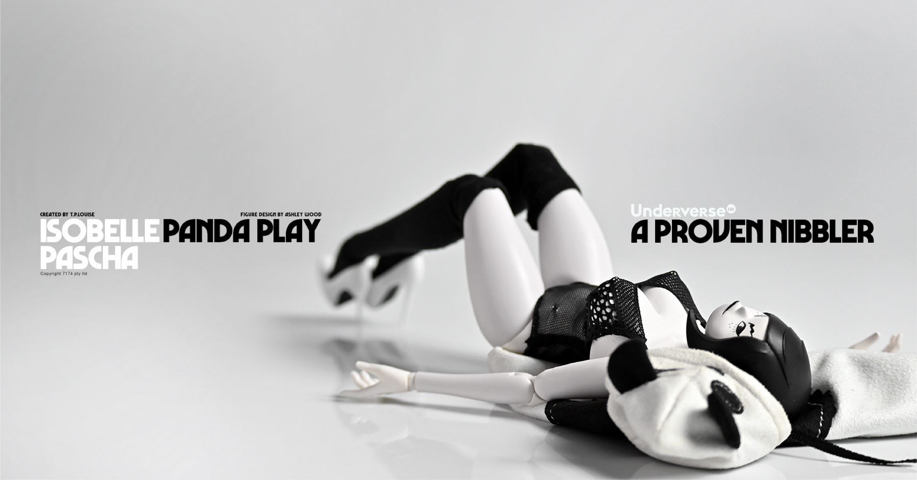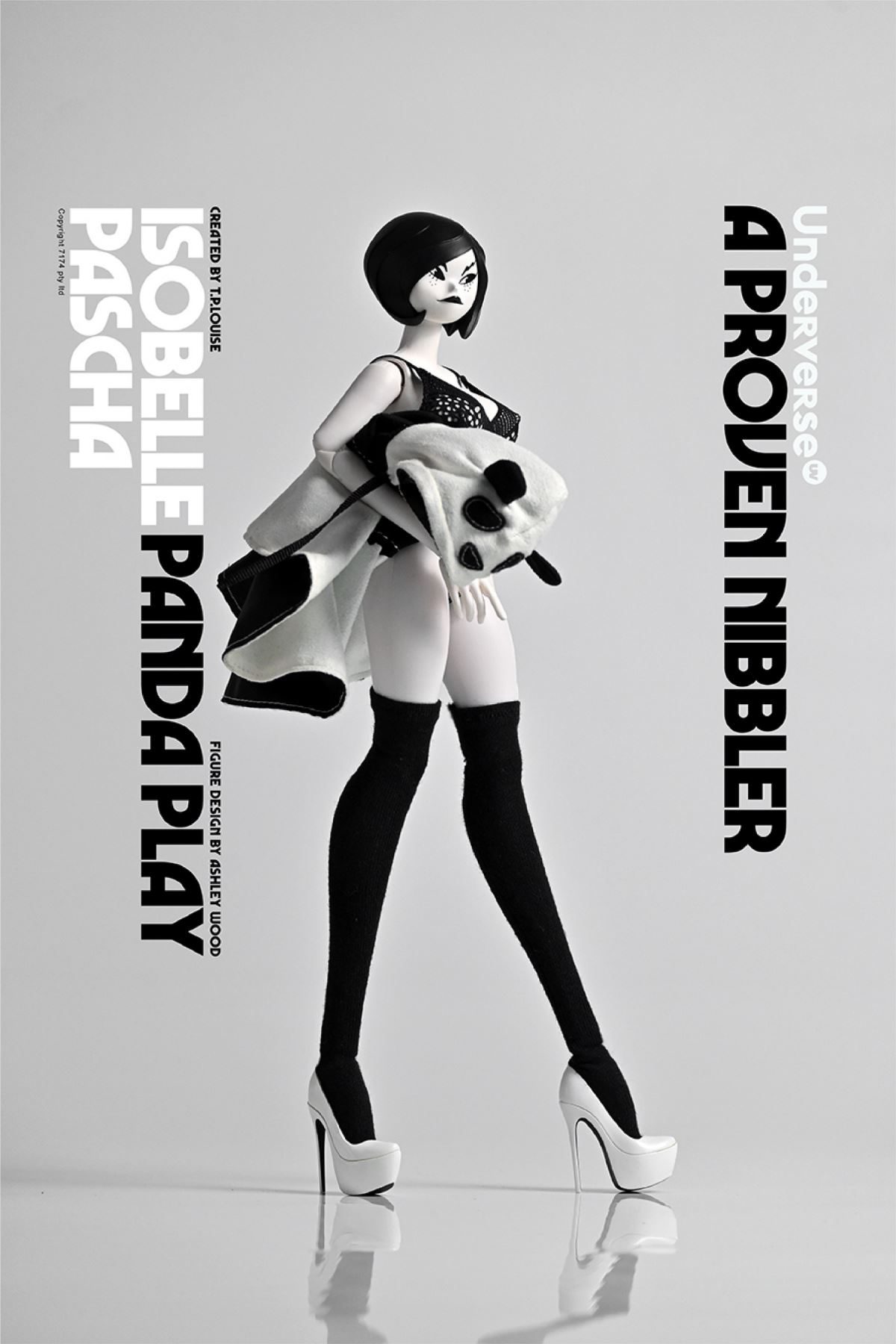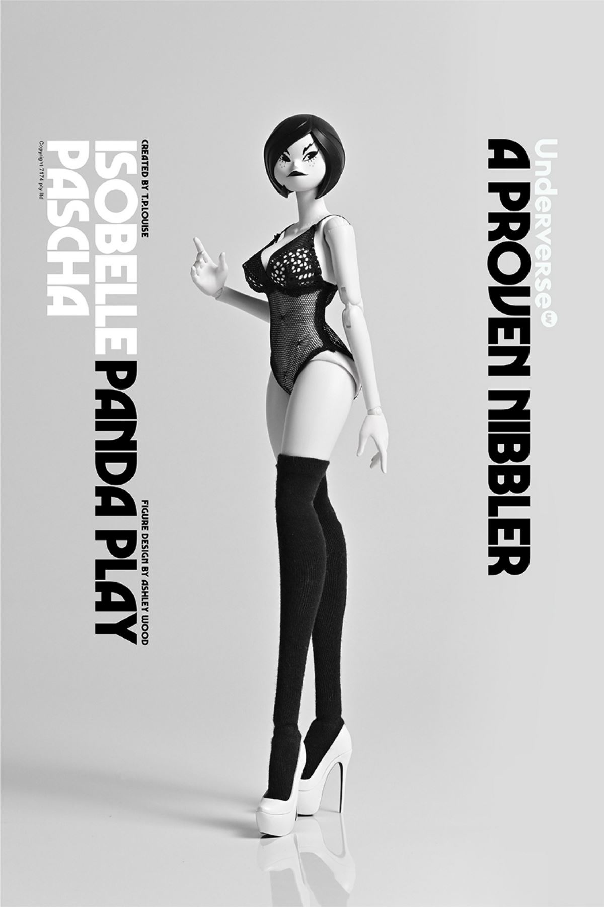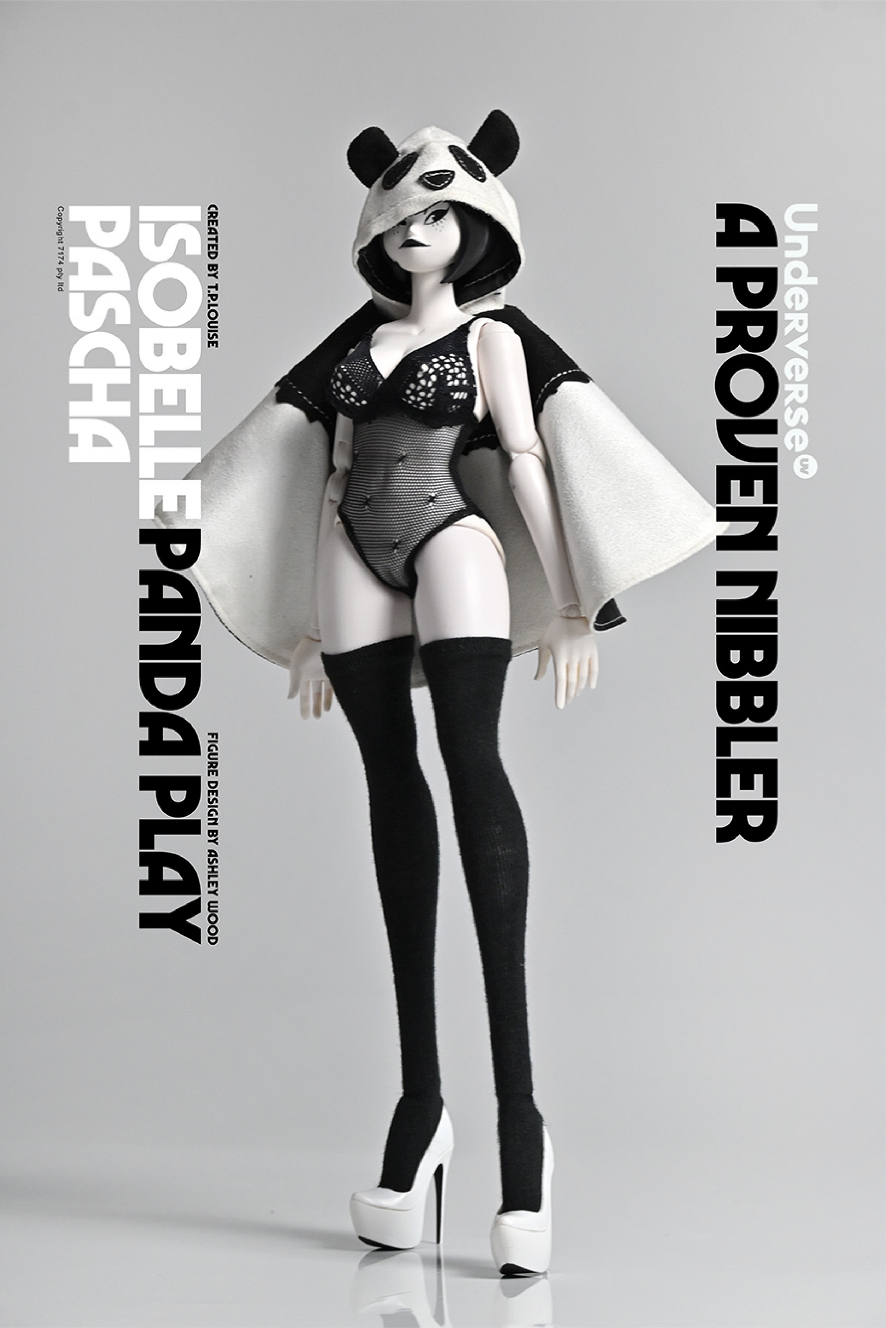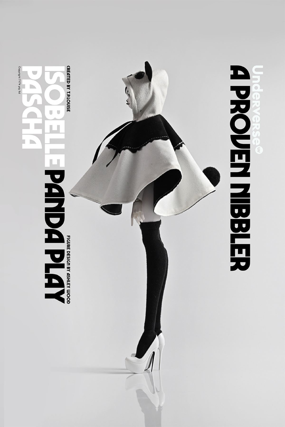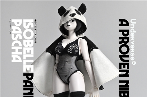 Name: THE WORLD OF ISOBELLE PASCHA (Isabel Pasha's World) Series 1/6 Collectible Action Figure PANDA PLAY ISOBELLE PASCHA Isabel Panda PashaRelease price: RMB 919 (free shipping)Release time: June 15, 2022 Sun 20:00Shipment time: Fourth quarter of 2022Properties:About 30CM high with25 joints movableAshley Wood / Siuyin Newly designed panda cape suitUV patented female bodyIncluding:11.8” joint movable UV body*1 bodyNew Design Panda Pasha Head Carving*1Panda Hooded Cloak*1Hand Shape*3 Pairs (Including Relaxed Hand Shape*1 Pair, Open Hand Shape*1 Pair, Pointing Hand Shape*1 Pair)Lace One Piece Underwear *1 setKnee-length socks*1 pairHigh heels*1 pairUnderverse doll platform*1Material:PVC, ABS, fabric produced byUnderverseCharacter prototype: TP Louise Figuredesign: Ashley Wood, Siuyin2022 UNDERVERSE LTD2022 7174 PTY LTD