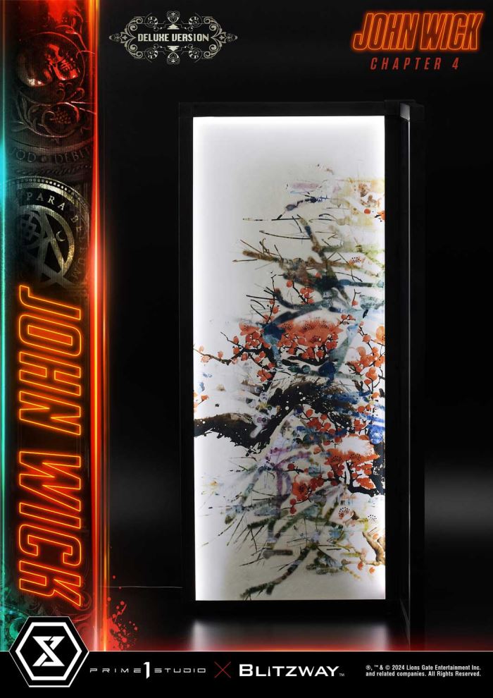 “They gave you my name…” – John Wick“Yeah” – Caine“I’m sorry” – John Wick“Me too” - CainePrime 1 Studio is extremely proud and thrilled to introduce our next entry to the coveted Premium Masterline series, the 1:4 scale PMJWK-01DXS John Wick Deluxe Bonus Version, from his last adventures in Chapter 4!Immerse yourself in the relentless world of action and vengeance with this jaw-dropping reproduction of John Wick, the legendary assassin from the acclaimed John Wick series. Known for its intense action sequences and compelling storytelling, the John Wick franchise has captivated audiences worldwide. With Keanu Reeves delivering iconic performance in all four movies, it is only natural that we at Prime 1 Studio, in collaboration with Blitzway, push ourselves to the limit by bringing you yet another stunning piece of art.At 21 inches tall, the Boogeyman is dressed in his signature black suit, that has been meticulously crafted and sewn with real fabric. He stands in a menacing pose, exuding a stylish, yet menacing aura. With a gun in his right hand, and a katana in his left, he is poised and ready for action. Every detail, from the texture of his suit, to the determined look in his eyes, has been expertly sculpted to bring John Wick to life. The likeness to Keanu Reeves is just uncanny, showcasing the craftsmanship and dedication that went into creating this masterpiece. The base features LED illumination, adding an extra layer of moody ambiance.The Deluxe Version adds a separate Art Wall, also LED illuminated, carefully recreated traditional Japanese paintings, as featured in the Osaka Continental’s exhibition hall, where the encounter between the two assassins went down.The Bonus Version, when ordered from our official store or any other authorized distributor, adds another swappable left-hand part, allowing you to display John Wick holding a pair of lethal nunchakus.This piece is more than just a collectible, it is a tribute to the enduring legacy of the character who has redefined the action genre. Elevate your collection with this exquisite statue, as it will make for a striking centerpiece that embodies the relentless spirit of Baba Yaga himself, a must-have for any fan of the series. Pre-order the PMJWK-01DXS John Wick Deluxe Bonus Version now and stay on the lookout for its companion piece, PMJWK-02DXS Caine, soon!Specifications:Statue Size approximately 22 inches tall [H:54cm W:24.5cm D:24.5cm]Statue Size approximately 23 inches tall with Art Wall [H:58cm W:27cm D:27cm]Highly detailed likeness sculpture of Keanu ReevesSophisticated tailored and designed outfitsJohn Wick: Chapter 4 themed baseLED Illuminated BaseLED Illuminated Art WallTwo (2) Swappable Left Hands (Normal, Holding Katana)Two (2) Swappable Right Hands (Normal, Holding Handgun)One (1) Swappable Left Hand (Holding Nunchuck) [BONUS PART]Notice:Prototype samples shown.Product details could be subject to change without further notice.Please note the final product specifications may differ because each product is Handmade.Since the product is still in the development stage, the Size (up to 10%) & Weight (up to 10kg) may be changed during the production stage.®, ™ & © 2024 Lions Gate Entertainment Inc. and related companies. All Right Reserved.DETAILSBrandsPRIME 1 STATUECollectionPremium MasterlineSeriesJOHN WICKScale1/4 ScaleProduct CodePMJWK-01DXSProduct Size Approx.H:54cm W:24.5cm D:24.5cmH:58cm W:27cm D:27cm (Art Wall only)Carton(Est):1 boxProduct Weight Approx.10 kgMaterialsPolystone and other materialsJAN4580708049649