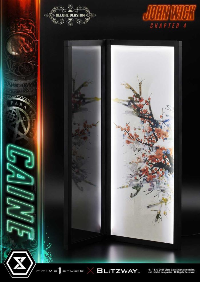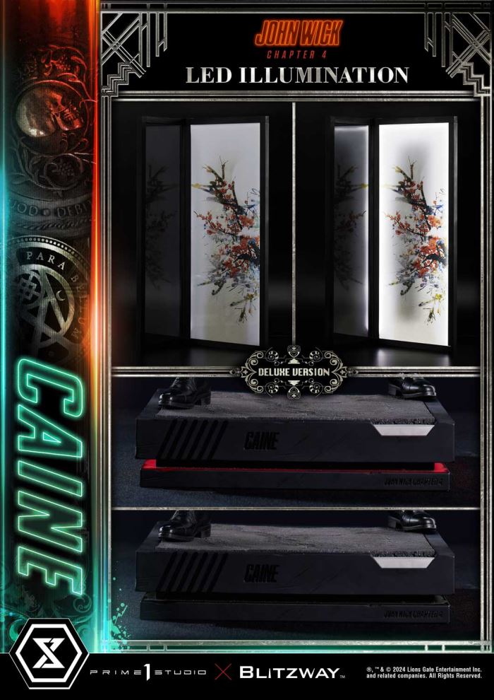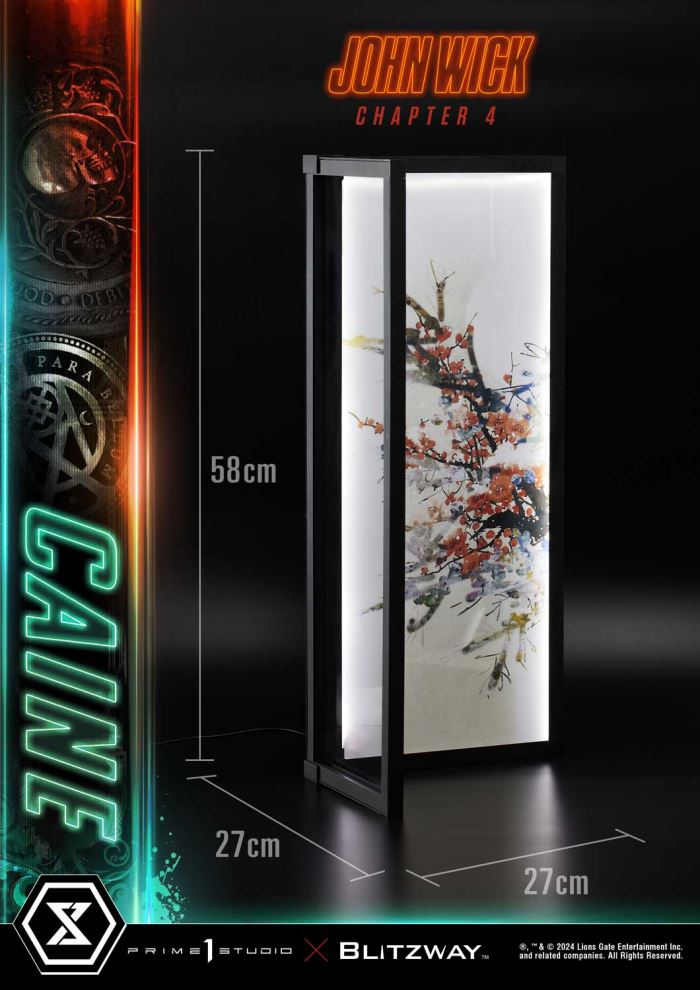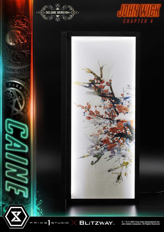 You should’ve stayed out, for all our sakes. - CaineI tried… - John WickPrime 1 Studio is extremely proud and thrilled to introduce our latest entry in the coveted Premium Masterline series, the 1:4 scale PMJWK-02DXS Caine Deluxe Bonus Version from John Wick: Chapter 4!Step into the intense and stylish world of John Wick with this breathtaking reproduction of Caine, a standout character introduced in the fourth film of the John Wick franchise. The series has revolutionized the action genre with its stunning choreography, rich world-building, and compelling narrative. The fourth movie introduced a highly skilled assassin and old friend of John, known for his lethal precision and unwavering resolve. Caine’s enigmatic presence and complex backstory have captivated audiences, making him a new fan-favorite in the John Wick saga. Prime 1 Studio, in collaboration with Blitzway, has gone above and beyond to bring you this stunning piece of art.Standing at 19 inches tall, the Blind Man is dressed in a sleek black suit, meticulously crafted and sewn from real fabric. Poised and alert, Caine listens intently for any sound, ready to detect and counter threats or launch precise attacks at the slightest noise from John Wick. With a gun in his right hand and a cane-sword in his left, every detail—from the texture of his suit to the determined look on his face—has been expertly sculpted to bring Caine to life. The likeness to Donnie Yen is uncanny, showcasing the exceptional craftsmanship and dedication involved in creating this masterpiece. The base features LED illumination, adding an extra layer of moody ambiance.The Deluxe Version includes a separate Art Wall, also LED illuminated, featuring carefully recreated traditional Japanese paintings, as seen in the Osaka Continental’s exhibition hall where the encounter between the two assassins took place.When you order the Bonus Version from our official online store or any authorized distributor, you will receive an additional swappable left-hand part holding a motion sensor, which Caine used at the Continental when fighting hordes of enemies.This piece is more than just a collectible; it is a tribute to the enduring legacy of a saga that has redefined the action genre. Elevate your collection with this exquisite statue, which serves as a striking centerpiece embodying the relentless spirit and style of Caine. It is a must-have for any fan of the series. Pre-order the PMJWK-02DXS Caine Deluxe Bonus Version now and pair it with its companion piece, PMJWK-01DXS John Wick, to recreate the epic action sequence from the Japanese Continental in the comfort of your home.Specifications:Statue Size: approximately 19 inches tall [H: 48cm W: 24.5cm D: 24.5cm]Statue Size with Art Wall: approximately 23 inches tall [H: 58cm W: 27cm D: 27cm]Highly detailed sculpture of Donnie Yen’s likenessFabric tailored outfitJohn Wick: Chapter 4 themed baseLED Illuminated BaseLED Illuminated Art WallOne (1) Pair of sunglassesOne (1) Swappable Left Hand (holding Cane/Sword)Two (2) Swappable Weapon Parts (Sword and Scabbard for the cane)One (1) Swappable Bonus Left Hand (Holding Motion Sensor) [BONUS PART]Notice:Prototype samples shown.Product details could be subject to change without further notice.Please note the final product specifications may differ because each product is Handmade.Since the product is still in the development stage, the Size (up to 10%) & Weight (up to 10kg) may be changed during the production stage.®, ™ & © 2024 Lions Gate Entertainment Inc. and related companies. All Right Reserved.DETAILSBrandsPRIME 1 STATUECollectionPremium MasterlineSeriesJOHN WICKScale1/4 ScaleProduct CodePMJWK-02DXSProduct Size Approx.H:48cm W:24.5cm D:24.5cmH:58cm W:27cm D:27cm (Art Wall only)Carton(Est):1 boxProduct Weight Approx.10 kgMaterialsPolystone and other materialsJAN4580708049670