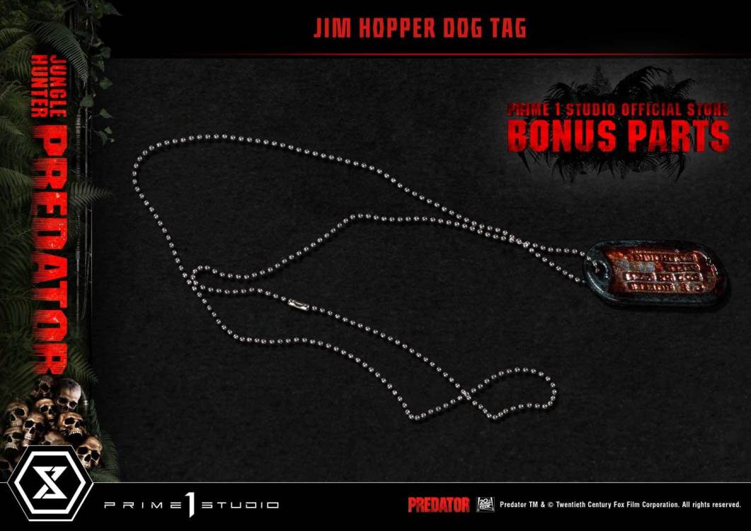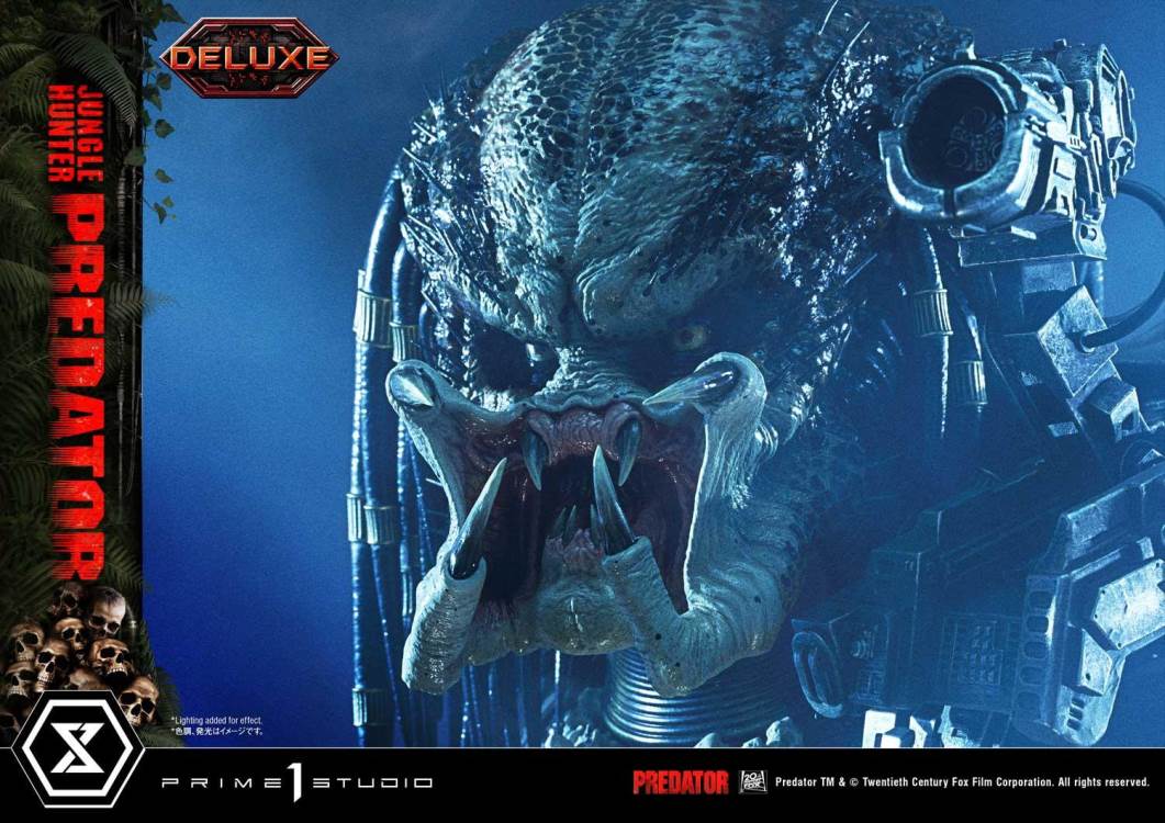 Jungle Hunter Predator ยืนตระหง่านอย่างสง่างามด้วยความสูงมากกว่า 35 นิ้ว เผยให้เห็นตัวเองว่าเป็นเจตจำนงที่น่าเกรงขามและอันตรายจากต่างโลกในการล่าเหยื่ออย่างไม่ลดละ ในช่วงเวลาสำคัญนี้ ที่ Jungle Hunter Predator เปิดเผยรูปร่างที่แท้จริงของเขาต่อชาวดัตช์ (ตัวเอกหลักของเรื่อง) ช่างฝีมือที่ Prime 1 Studio ได้นั่ง Bio Mask ของ Predator ไว้ที่รากที่มีปมของต้นไม้ ในภาพยนตร์เรื่องนี้ The Predator ถอด Bio-Mask ของเขาออกแล้วหย่อนลงในน้ำที่เน่าเสียและเต็มไปด้วยปลิงในป่า ซึ่งเราได้สร้างขึ้นใหม่อย่างซื่อสัตย์ที่นี่ด้วยเรซินโปร่งแสงและการรวมรายละเอียดเพื่อให้ได้เอฟเฟกต์ที่เป็นน้ำที่น่าเชื่อ