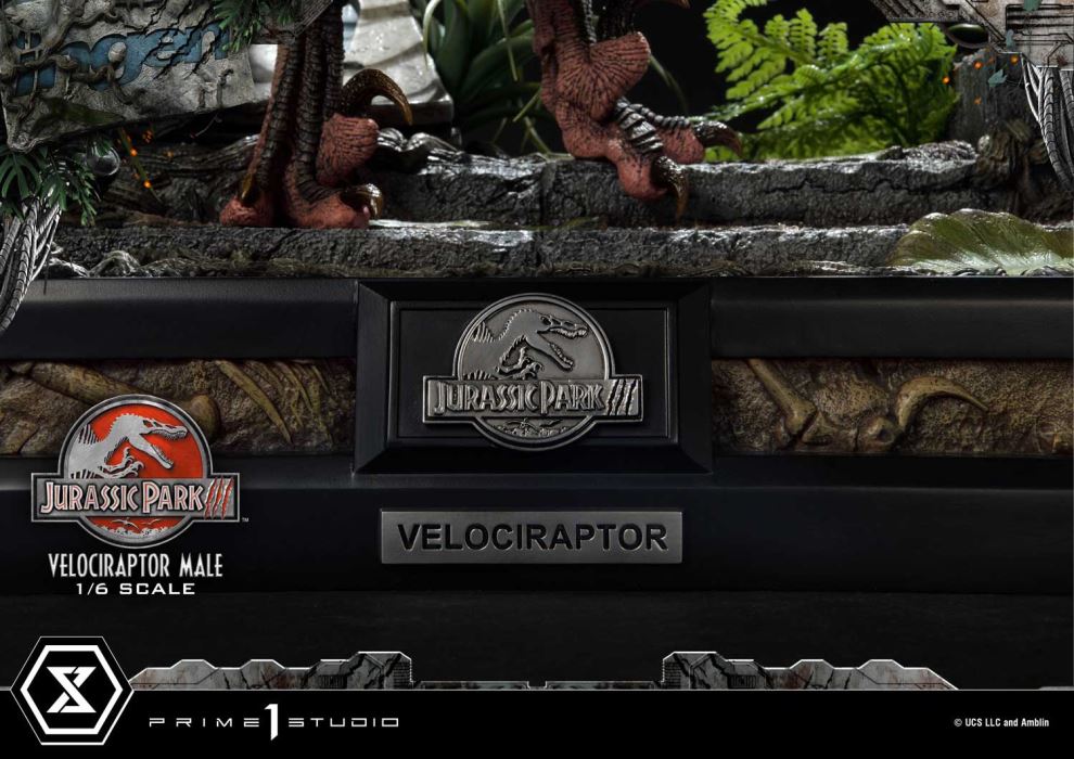 “Ellie, all our theories about raptor intelligence, what they were capable of… we weren’t even close”– Alan GrantPrime 1 Studio is proud to present you with the next entry to our Legacy Museum Collection of the Jurassic World III film, the 1/6 Scale LMCJP-10S Male Velociraptor Bonus Version!Our artists have come together once again to add to the ever-growing Jurassic Park series, this time around, we are bringing you the male velociraptor from the third movie. Great care and attention to detail have been put into this highly intelligent reptilian predator, we are talking realistic texturization of the skin, rows of razor-sharp teeth, and massive, curled claws. The male velociraptor features saturated and bright colors, painted and shaded to perfection! The 16-inch-tall dinosaur strides through a lush, jungle-themed base, emblazoned with Jurassic Park III logo at the front with its name carved. Could it be looking for the female velociraptor? Or perhaps stolen eggs?And if you order the Bonus version from our official store or any authorized distributor, receive a Velociraptor Resonating Chamber as a Bonus Part, a thrilling and collectible addition to elevate your overall Jurassic Park collection.This one is definitely a must-add to any Jurassic Park franchise fans, do not miss out and pre-order the LMCJP-10S Velociraptor Male Bonus Version while you can!Specifications:Statue Size approximately 15.8 inches tall and 25.6 inches wide [H:40cm W:65cm D:33cm]Jurassic Park-themed baseOne (1) Velociraptor Resonating Chamber [BONUS PART]Notice:Prototype samples shown.Product details could be subject to change without further notice.Please note the final product specifications may differ because each product is Handmade.Since the product is still in the development stage, the Size (up to 10%) & Weight (up to 10kg) may be changed during the production stage.Region Exclusive© UCS LLC and AmblinDETAILSBrandsPRIME 1 STATUECollectionLegacy Museum CollectionSeriesJurassic SeriesScale1/6 ScaleProduct CodeLMCJP-10SProduct Size Approx.H:40cm W:65cm D:33cmCarton(Est):1 boxProduct Weight Approx.About 11.4 kgMaterialsPolystone and other materialsJAN4580708049014