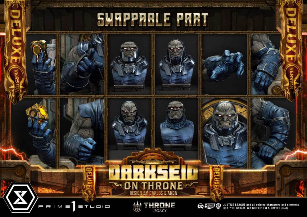 I will take you to a hell without exit or end”Prime 1 Studio is extremely proud to present another mind-bending addition to the beloved Throne Legacy. In collaboration with the acclaimed comic artist Carlos D’Anda, we are bringing you the 1:4 scale TLCDC-03DXS Darkseid On Throne Design By Carlos D’Anda Deluxe Bonus Version from the Justice League Comics.Darkseid was created by the legendary writer-artist Jack Kirby, and first appeared in “Superman’s Pal Jimmy Olsen” #134 back in 1970. Over the years, he has grown to be one of the most powerful beings in the DC Universe. The sadistic and tyrannical ruler of Apokolips whose goal is the complete and total subjugation of the multiverse by obliterating all the hope, free will, and joy of each and every sentient being. Prime 1 Studio took upon the challenge to breathe life into the God of Ultimate Evil but in a way that would instill primal fear in any who gaze upon him, all while using the highest and most intricate techniques to push and blend the boundaries of reality and fantasy.Darkseid is portrayed as a physically intimidating character as he towers over even the greatest that DC has to offer. His presence alone should send chills down the spine to anyone in his proximity. With Carlos’ design, we’ve made sure the otherworldly cosmic aura is encompassed in this awe-inspiring statue. As such, you have been brought in front of the Destroyer’s throne room for questioning or to request an audience, either way, it is more than likely not to be a friendly visit. The 25.5-inch throne has been sculpted and painted with the utmost attention to detail, different finishes, sheens, washes, highlights as well as LED illumination were all employed to bring out the regal bearing of the dark ruler. As much attention has been given to Darkseid himself, imbuing his face and body with the most intricate detail and texture in every line and crack. His intense LED-lit eyes would make you think more than twice before speaking as the slightest misstep out of line could cost you your life. The blue tunic contrasts with his invulnerable body in both a majestic and intimidating manner. In his right hand, he holds up an LED-illuminated Mother Box as his left arm rests on the throne.The Deluxe Version comes with a whopping four additional swappable head parts with variations to his eyes and smiles for you to expand the storytelling by finding the perfect face for the occasion, each coming with its own headstand. Three additional swappable right arms allow you to display him with a finger pointing toward the subject, holding an LED-illuminated tablet, or down resting on the throne. Two additional swappable left-arm parts let him grab down on the throne with his elbow up or reach forward menacingly.And when you order the Bonus Version from our official store or any authorized distributor, we’ve included an extra headstand and a sixth-head part variation with Darkseid’s Omega beams charging from his eyes, ready to fire at and incinerate any foe at any given moment.We truly believe this piece will fit right into any collection, or even be the first piece of a brand-new collection! Do not miss out on this absolutely mind-blowing interpretation of the deadly tyrannical Lord of Apokolips, pre-order the TLCDC-03DXS Darkseid On Throne Design By Carlos D’Anda Deluxe Bonus Version for a permanent aura of dread in your home. Specifications: Statue Size approximately 25.5 inches tall [H:65cm W:56cm D:51cm]One (1) LED-illuminated Darkseid Throne BaseFive (5) Swappable head partsFour (4) Swappable right arm parts (Mother Box, Tablet, Finger and Down)Three (3) Swappable left arm parts (Resting, Down and Up)Four (4) headstandsLED illumination in the eyes of all faces, Mother Box, and TabletOne (1) Bonus headstand [BONUS PART]One (1) Bonus Swappable head part with Omega Beams [BONUS PART] Notice:Prototype samples shown.Product details could be subject to change without further notice.Please note the final product specifications may differ because each product is Handmade.Since the product is still in the development stage, the Size (up to 10%) & Weight (up to 10kg) may be changed during the production stage. JUSTICE LEAGUE and all related characters and elements © & ™ DC Comics. (s23)DETAILSBrandsPRIME 1 STATUECollectionThrone LegacySeriesDC SeriesScale1/4 ScaleProduct CodeTLCDC-03DXSProduct Size Approx.H:65cm W:56cm D:51cmCarton(Est.): 2 boxesProduct Weight Approx.About 63.7 kgMaterialsPolystone and other materialsJAN4580708048536