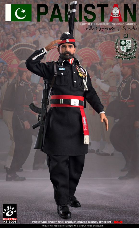 KING'S TOY : 1/6 Pakistan Iron Brothers / Pakistan Flag Ceremony Guard SoldierGuard Soldier # KT-8004Product List:1 Element Body2 Head Carvings3 Replacement Hands * 6 Only4 Hats5 Tops6 Fatting Underwear7 Pants8 Belt9 scarf10 waist seal11 armband12 medal * 313AK47 rifle14 leather shoes15 national flag * 216 bracket