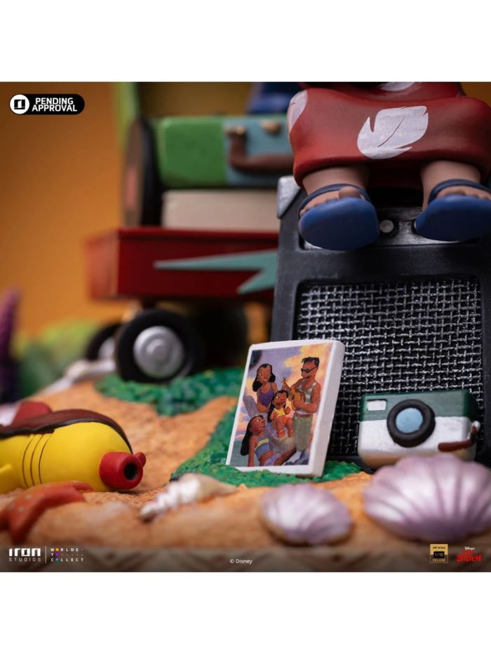 Digital Pre-Order - Statue Lilo & Stitch Deluxe - Disney Classics - Art Scale 1/10 - Iron StudiosWho are Lilo & Stitch?Lilo & Stitch, produced by Walt Disney Feature Animation in 2002, centers around two characters. The first is a six-year-old Hawaiian girl named Lilo Pelekai, an orphan raised by her older sister, Nani, after their parents' death. Spirited and eccentric, Lilo lives on the Island of Kauai where she attends Hula classes at Kaiāulu Hale, and her hobbies include photographing tourists and obese people, talking about creatures from horror movies, and idolizing Elvis Presley, though she doesn't understand that her eccentricities make her an outcast among most other children. The second character is an extraterrestrial creature called Experiment 626, who is adopted by Lilo as her pet, thinking that he is a dog, and names him Stitch. Stitch was genetically modified to cause destruction, with his original primary function being to provoke chaos throughout the galaxy, destroying everything he touches. He was designed to be abnormally strong, virtually indestructible, super intelligent, and very mischievous. Initially, he uses Lilo to avoid being captured by the intergalactic federation, but he and the girl develop a close bond through the Hawaiian concept of ohana, or extended family, making Stitch reconsider his destructive purpose to keep his newly discovered family together. Nominated for the Oscar for Best Animated Feature during the 75th ceremony in 2003, its success helped make the film a highlight of Disney's post-Renaissance era in the 2000s, spawning a franchise that includes three direct-to-video sequels and three TV series.Exploring the Lilo & Stitch Deluxe statue:On a base of sand and vegetation from the Hawaiian beaches of Kauai Island, a small, charismatic, and cute girl, wearing a traditional pink printed dress from her culture, joyfully plays her Ukulele while sitting on a small guitar amp, with a photo of her parents and a camera in front of the speaker screen—two items of great importance to her, along with an equally essential surfboard. With seashells, a starfish, and an alien ray gun fallen on the sand, beside her, her red wheelbarrow carries her suitcase turntable where her best friend from another world dances naturally, sometimes as a King of Rock duet, sometimes as a superhero with a red cape, or sometimes with a traditional Hula skirt and necklace. With the base adorned with waves around it, Iron Studios proudly presents the statue Lilo & Stitch Deluxe - Disney Classics - Art Scale 1/10, with four optional versions of Stitch: normal, as Elvis, as a superhero, or dancing the Hula, expanding its commemorative collection of Disney's 100 years.Figure details:The statue Lilo & Stitch Deluxe - Disney Classics - Art Scale 1/10 was created for the Disney Classics line from Iron Studios, composed of sets from the most beautiful, remarkable, and unforgettable feature animations from the dream world envisioned by Walt Disney. The statue measurements are 8.1 in (H) x 8.4 in (W) x 7.2 in (D) – 3.7 lb., which ensures an impressive display of the figure in any environment.Special features:The statue Lilo & Stitch Deluxe - Disney Classics - Art Scale 1/10 by Iron Studios will be produced in limited edition. The diorama base present rich details inspired by the original references.Materials and finishing of the piece:Just like all the other statues manufactured by Iron Studios, the statue Lilo & Stitch Deluxe - Disney Classics - Art Scale 1/10 is made with high-quality materials such as Polystone, and may contain parts in resin, PVC, metal, and fabric. In the finishing, the hand painting ensures a unique and exclusive artistic touch to satisfy any collector.Already available for Pre-order, presented on the Inside Iron Studios Day show of June, check out the other presented previously commemorative statues of Disney's 100 years: Mickey-Fantasia, Scar-The Lion King, Beauty and the Beast, The Little Mermaid, Pinocchio, Monsters, Inc. Diorama, Aladdin and Jasmine, Peter Pan Vs Hook, and Lion King Deluxe. Don't miss many other future news from Iron Studios on their social media.Product SpecificationsDescriptionStatue Lilo & Stitch Deluxe - Disney Classics - Art Scale 1/10 - Iron StudiosUpc61823195609800Product Code070541Scale1/10BrandIron StudiosProduct typeDigital Voucher