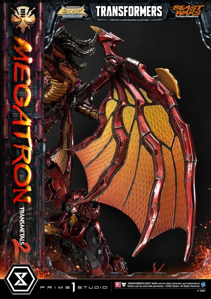 PMTFB-03 MEGATRON TRANSMETAL 2 (BEAST WARS: TRANSFORMERS)“Megatron does not yield! He conquers!”Prime 1 Studio is extremely proud to present an amazing addition to our Transformers line in the Premium Masterline series: PMTFB-03 MEGATRON TRANSMETAL 2 from BEAST WARS: TRANSFORMERS!At a staggering 29 inches, the incredibly ruthless and strategic leader of both the Predacons and the Darksyders...Megatron proves time and again that he is an indomitable nemesis!!! After absorbing the Spark of the original Megatron, this Megatron, already possessed of a Transmetal body was thrown into a lava pit whereby he acquired a larger, stronger dragon form.Prime 1 Studio’s group of talented sculptors and painters, whose strengths lie in realistic depictions of machinery and rendering a variety of materials, absolutely shine when they get to work on a character like a Transformer. Megatron’s dragon form is the perfect example of this. More formidable and powerful than his previous form, Megatron’s new body can breathe fire AND ice! Here, we see him burst forth from a scorching lava pit, fully prepared to deal maximum damage.Prime 1 Studio’s artists have really outdone themselves with every panel, gear, and joint they have sculpted into Megatron. The figure is intensely rewarding to behold due to its minute accuracy, and intricate detail. From Megatron’s devilish sneer, and head-mounted prehensile tail, to his well-armored, talon-equipped feet...this Predacon is a thing of brutal beauty! Furthermore, Prime 1 Studio’s painters have given Megatron a well-worn, battle-damaged look, over his metallic rendering, and realistic weathering.Megatron displays his full breadth and width on top of this molten rock base, with intense lava, splashing with fiery intensity! And what’s this? Poor Tarantulas...a victim of his own undoing...by crossing swords with an obviously overpowered Megatron!Hurry up and rush to Pre-Order this breathtaking Beast Wars Predacon today! It will not last forever![Product Specifications]・Statue Size approx. 29 inches tall [H:74cm W:64cm D:55cm]・Beast Wars: Transformers Transmetal 2-themed, lava base featuring Tarantulas[Notice]Prototype samples are shown.Product details could be subjected to change without further notice.