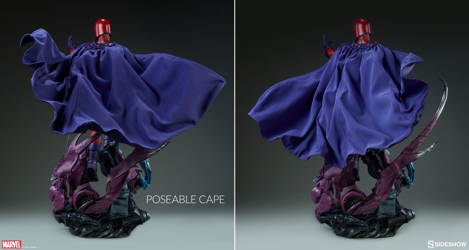 Magneto ABOUT THIS MAQUETTE“It is time that our enemies learn what we already know… that there is no place to hide!” Sideshow is thrilled to present the Magneto Maquette, using his mastery of magnetic fields to make his way into your collection. Measuring over 25” tall, the mutant known as Magneto hovers deftly over a base formed from the mangled remains of a Sentinel head. Scraps of the mutant-killing machine twist and coil under the immense influence of Magneto’s legendary powers. The Magneto Maquette has a strong physique, featuring a resin face and body. Magneto’s sculpted red suit is detailed with textured panels and piping, with armored purple gloves, boots, and a belt completing his signature color style. His helmeted portrait exudes determination, with gritted teeth and eyes whitened to show his metal-bending abilities in action. Magneto also wears a magnificent purple fabric cape, which includes internal wires for custom posing possibilities. Pair Magneto with the Wolverine Premium Format™ Figure to create an epic X-Men display with their proximity bases. Show two fierce foes preparing to face off, or two allies ensuring the future of mutantkind against the murderous Sentinels. The Exclusive edition of the Magneto Maquette includes an alternate unmasked portrait of the master of magnetism, revealing a more stoic and focused expression along with Magneto’s iconic silver hair. Prove the superior strength of mutants and add the Magneto Maquette to your Marvel collection today! LicenseMarvelTypeMaquetteMaterialsResinManufacturerSideshow CollectiblesArtistsAlex Pascenko (Design)Zac Roane (Design)Jean-Paul Mavinga (Design)David Igo (Design)Will Harbottle (Design & Sculpt)Marco Plouffe (Keos Masons) (Design & Sculpt)Nathan Mansfield (Sculpt)Chadwick Anderson (Mold & Cast)Ed Bradley (Paint)Bernardo Esquivel (Paint)Esther Skandunas (Costume Fabrication)Tim Hanson (Costume Fabrication)The Sideshow Design and Development TeamADDITIONAL DETAILS & DIMENSIONSExpected to ShipDec 2018 - Feb 2019Item shown is a prototype. When shipped, the final production piece may differ in appearance.Product Size25.25 H (641.35mm) x 16 W (406.4mm) x 14 L (355.6mm)*Product Weight15.00 lbs (6.8 kg)*Dimensional WeightTBDInt'l Dim. WeightTBD* Size and weight are approximate values.SKU3005351UPC747720234598© 2018 MARVEL