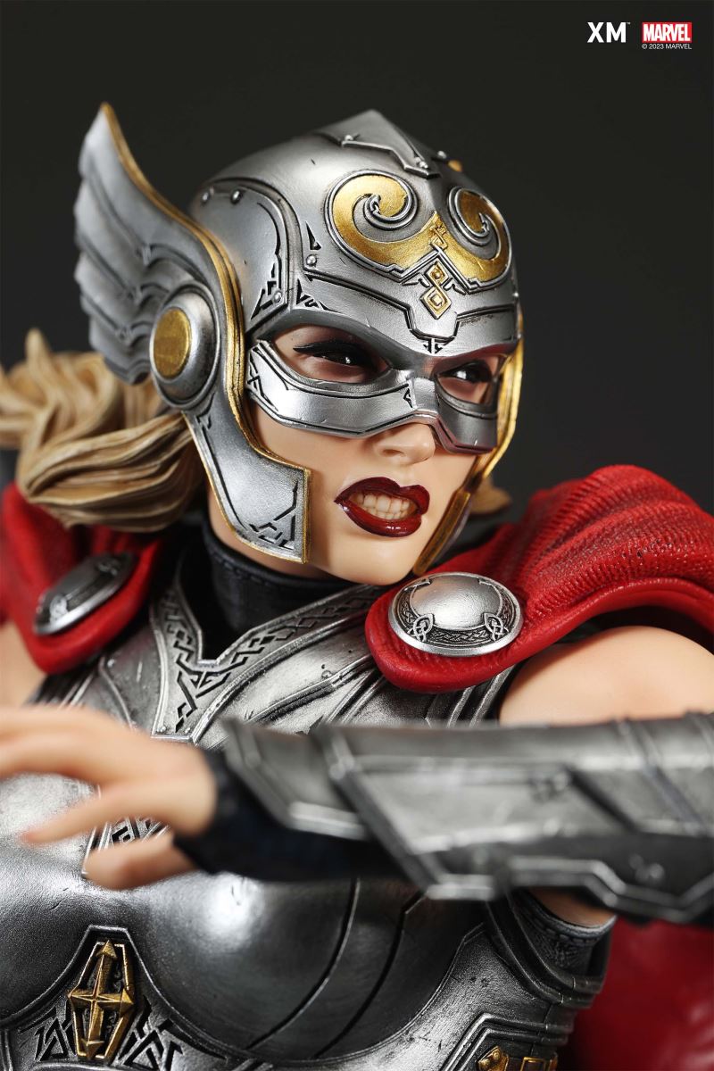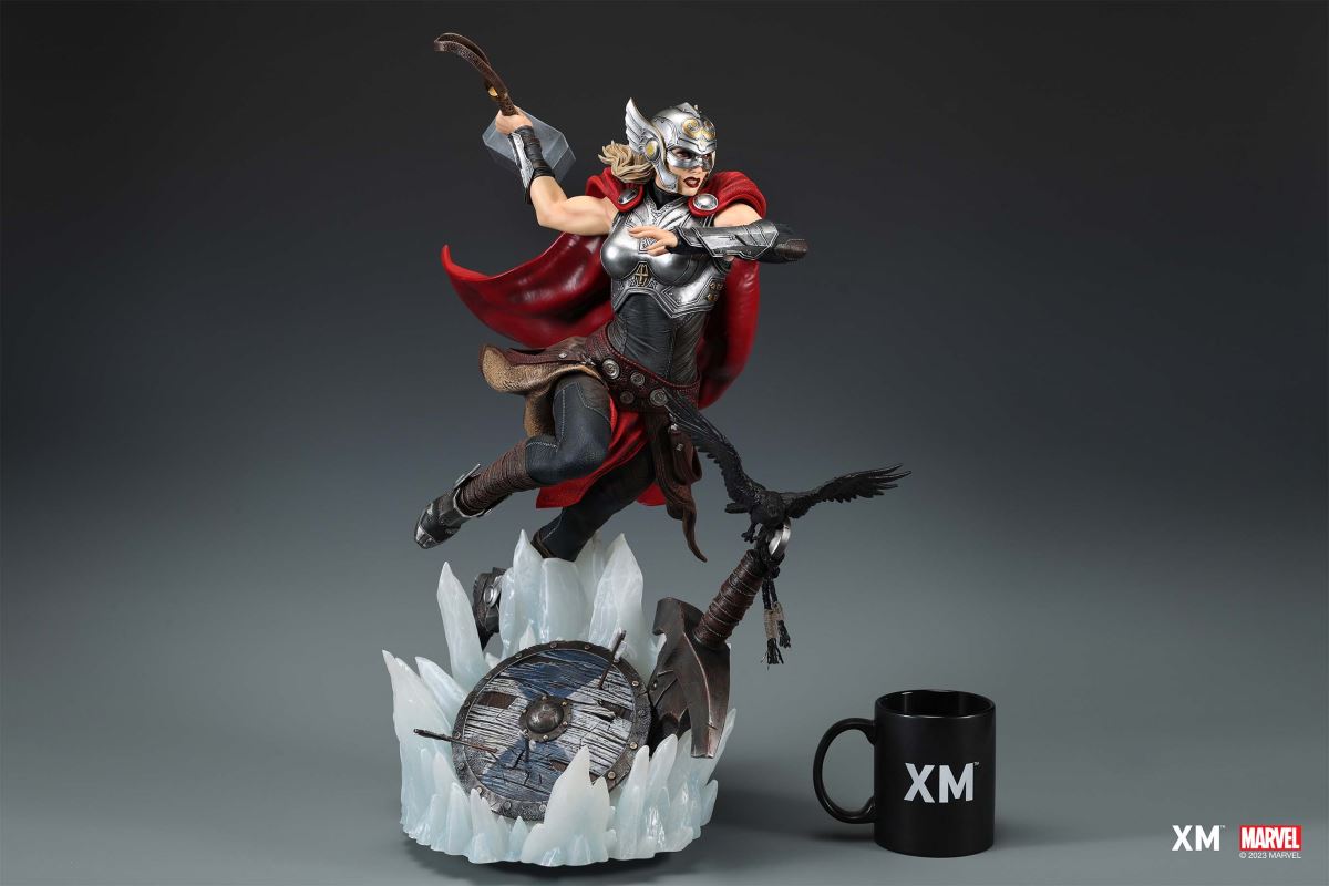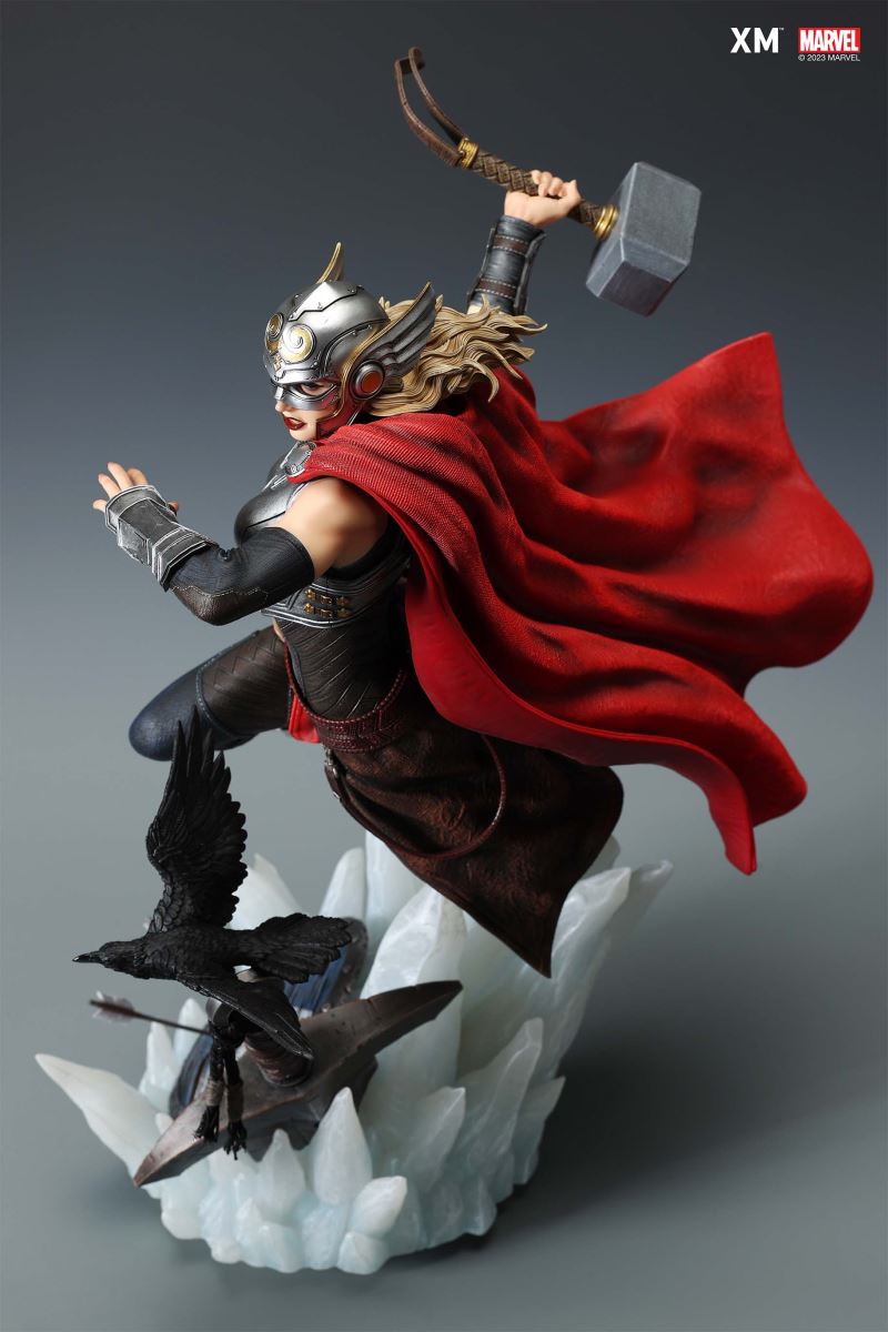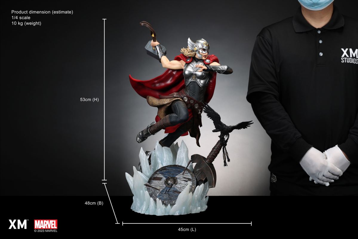 XM Studios is excited to present the next 1/4 scale Marvel Premium Collectibles, Mighty Thor!Each painstakingly handcrafted statue is individually hand-painted with XM’s famous quality finish, and comes in a bold, dynamic, and story-laden style. Jane Foster was granted Thor’s powers when she was deemed worthy to wield Mjolnir. This statue showcases her Asgardian strength and flight as she charges forward with the Mjolnir in her hand as the new Goddess of Thunder. Mighty Thor is seen in mid-flight on an ice crystal base battlefield as she wields the mythical hammer, preparing to throw an attack. She is cladded in Asgardian armor in silver, red and black colour scheme, with leathery tones and textures modernized in XM style. Her unwavering determination to take down the enemies is striking beneath her winged helm. Mighty Thor Premium Collectibles statue features:Highly detailed sculpt featuring Mighty Thor on battlefield charging with a ravenCrafted in PolystoneEach painstakingly handcrafted statue is individually hand-painted with the highest possible quality finishES: 199 Artists:Jorge Molina (2D)Tiago Zenobini (3D)XM Studios Design and Development Team Manufactured by:XM Studios Product and Box Dimensions:Est. Product Size: 45 x 48 x 53cmEst. Box Size: 70 x 55 x 28cmEst. Product Weight: 10kgEst. Shipping Weight: 13kgNote: Prototype shown and pending final approval, final product may differ. Batteries will not be included for products with light up features due to customs.