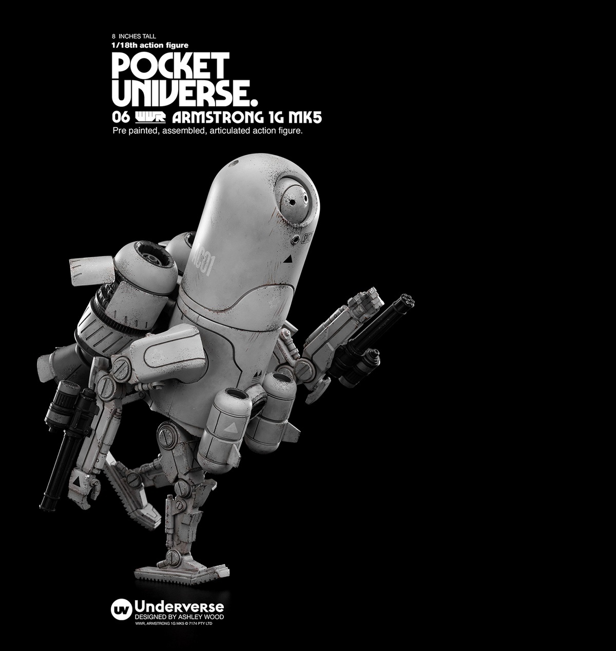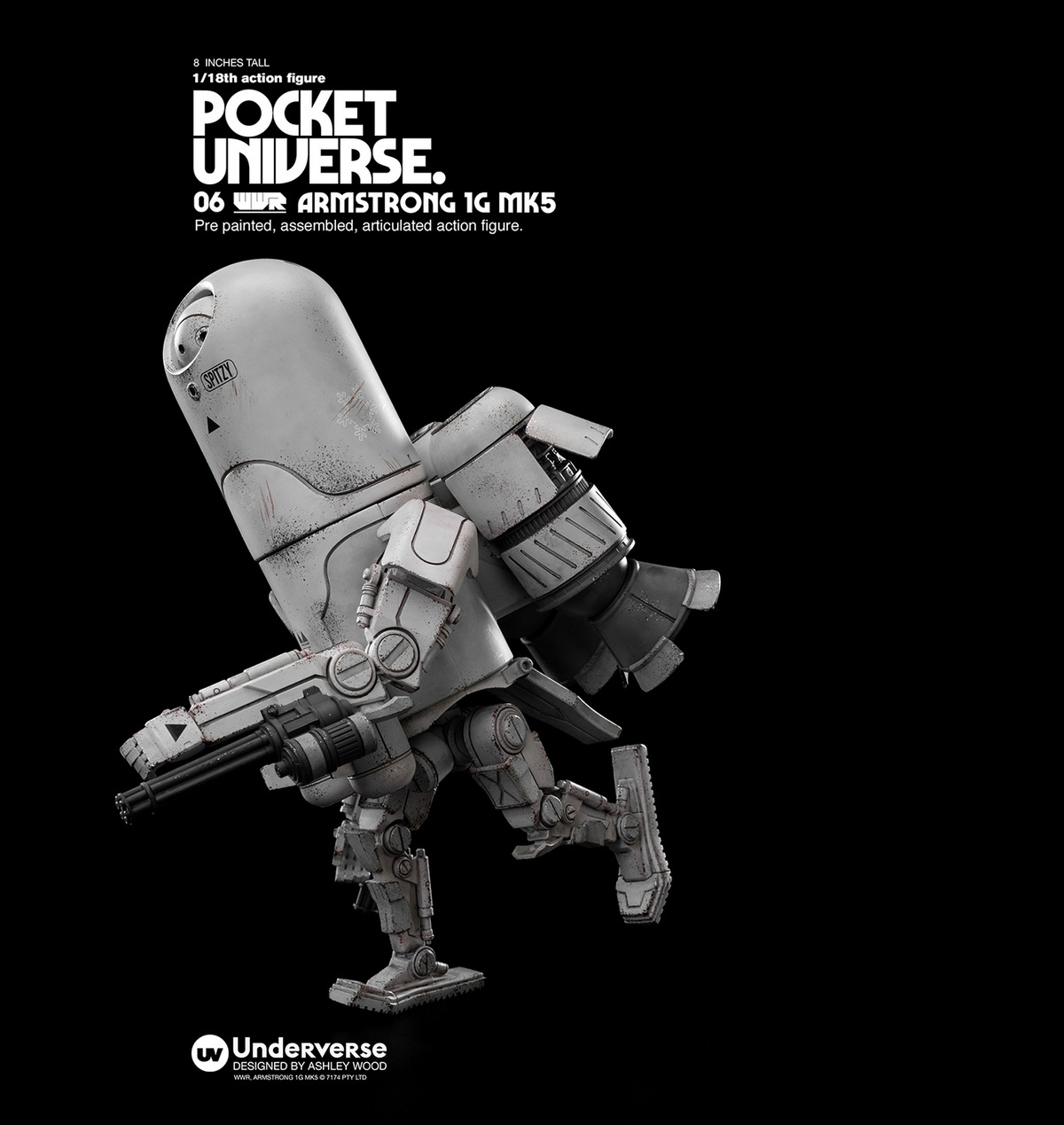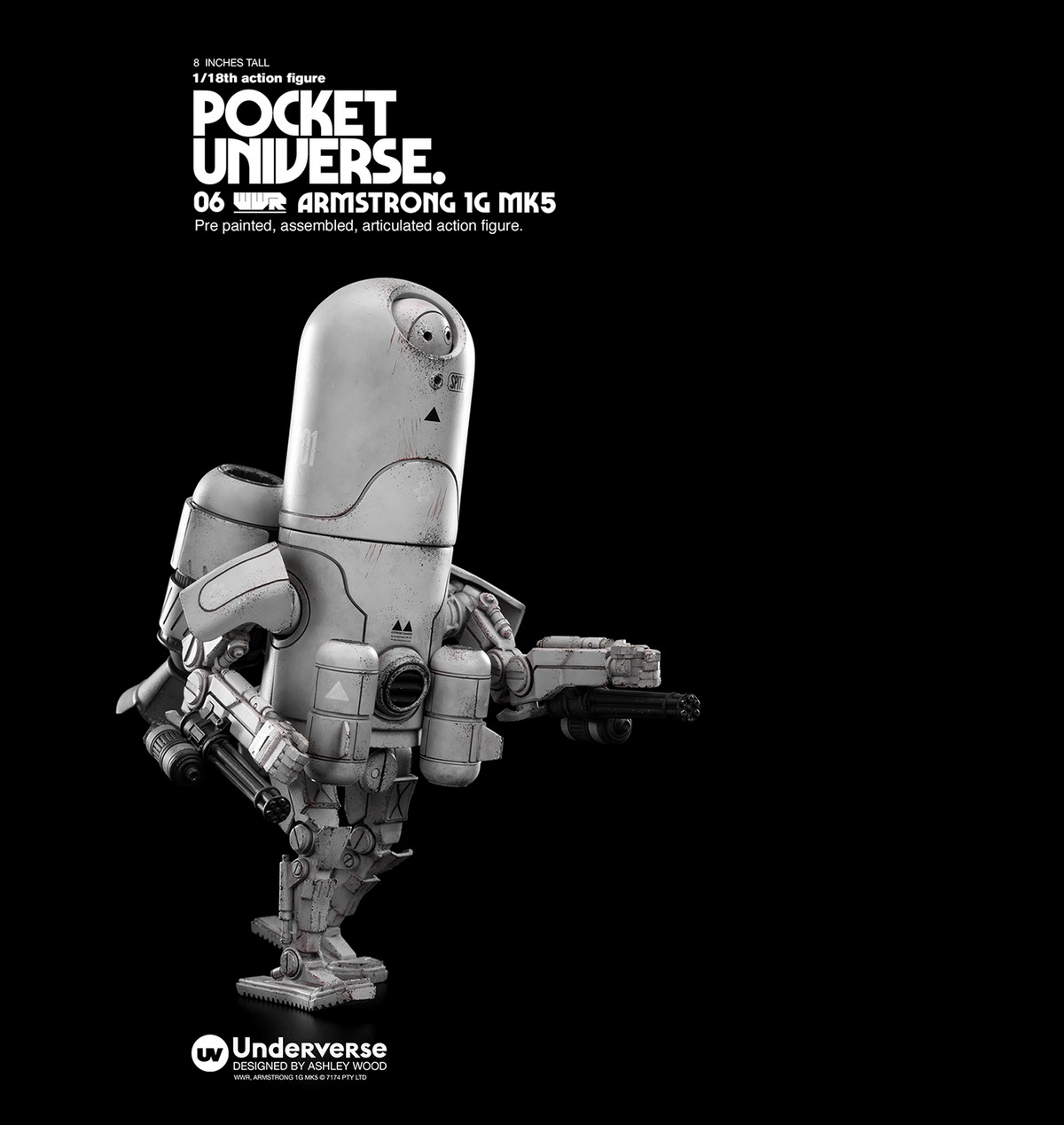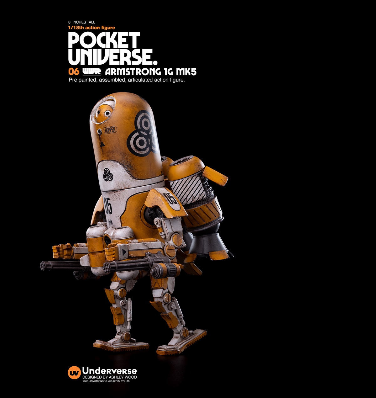 Name:UNDERVERSEPOCKET UNIVERSE pocket universe seriesWORLD WAR ROBOT21/18 mini action figure ARMSRTONG 1G MK5Armstrong 1G MK5, often used in air combat, guerrilla warfare, or personal protection. The 1/18 ARMSRTONG 1G MK5 of the pocket universe series is divided into two camps in orange and blue, with a height of about 20cm (8”), 22 movable joints, and equipped with miniature gun barrels on both arms, making it always at the forefront of destructive robots.( This detail page may not reflect)Series Introduction: The Pocket Universe series spans all the original worlds created by ASHLEY WOOD, this series is presented in pocket mini size. Stylized painting 1/18 joint action figures, the adventure of the multiverse is instant Departure!Release time: May 31, 2022 at 20:00Release price: RMB 899 with freeshipping Shipping time: The first quarter of 2023Properties:about 8'' (20cm) high with22 movable joints,stylized and old -fashioned Outfit New Faction Colors:BLUE: MEDITERRANEANN GUARDOrange: NORTH MOLE FRM MILITIASnow: FROST GUARD Winter GuardIncludes:ARMSRTONG 1G x 1 BODYMATERIALS:ABS, PVC, VINLYUnderverse ProducedDesign: Ashley Wood@ 2022 UNDERVERSE LTD@ 2022 7174 PTY LTD