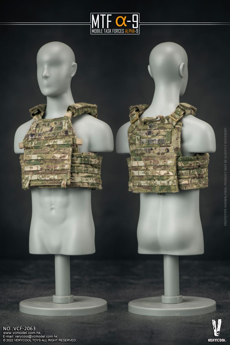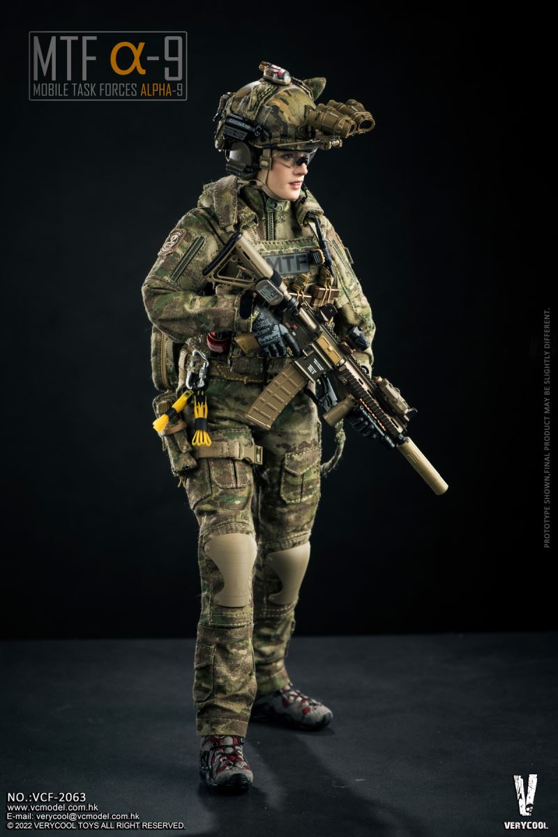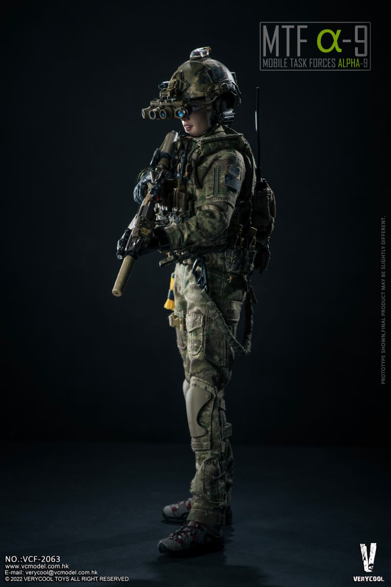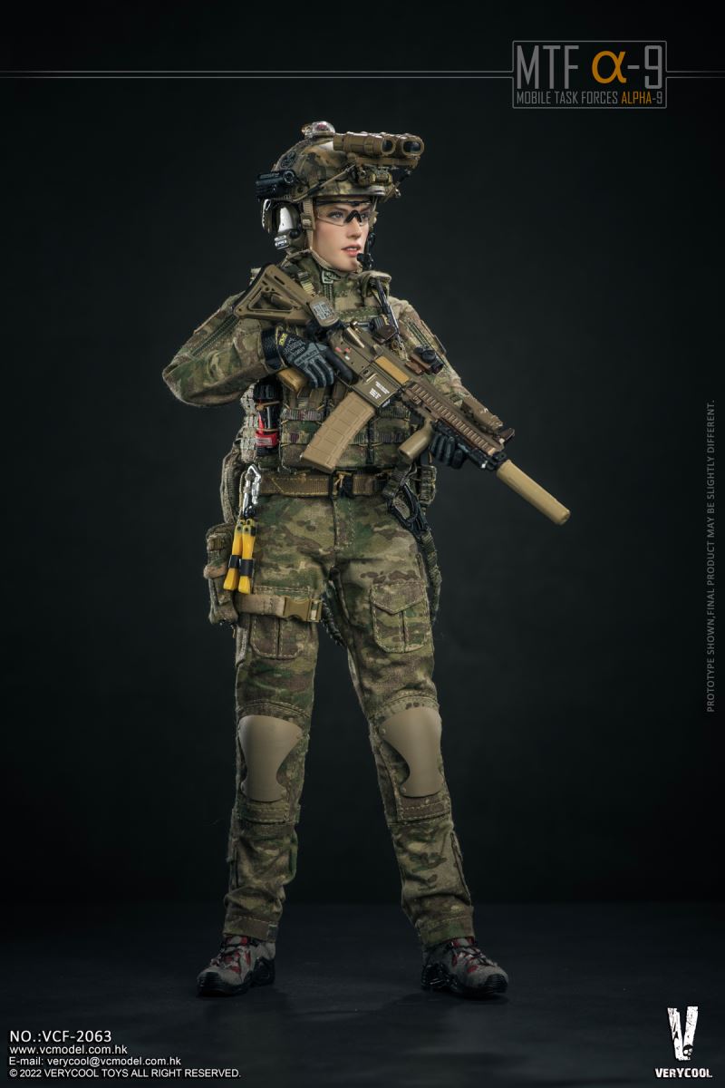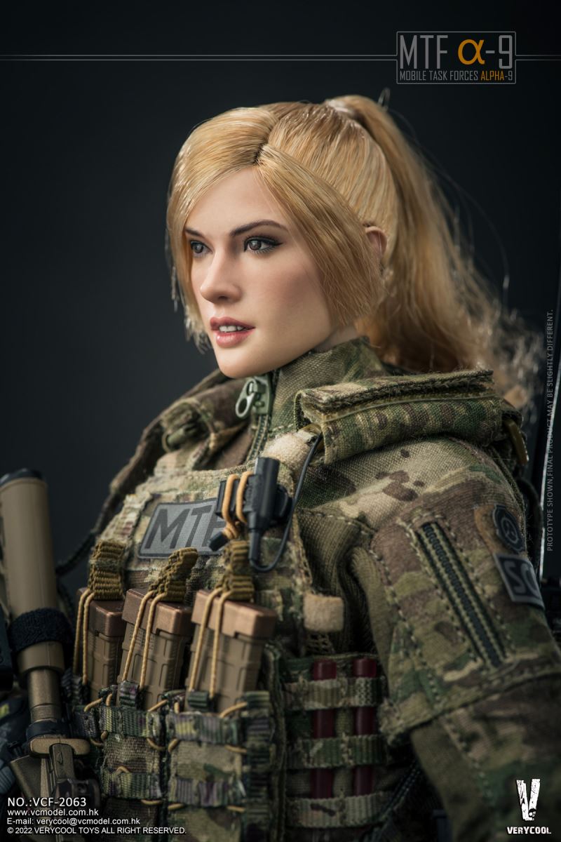 VERYCOOL : 1/6 MTFα-9(Mobile Task Force Alpha-9)Product Name: 1/6 MTF α-9 (Mobile Task Force Alpha-9)Product No.: VCF-2063Product List:-Emulational Head Sculpture-VC 3.0 Medium Chest Female Body (soft chest)-Combat Shirt (MultiCam)-Combat Pants (MultiCam)-Helmet Velcro Kit-Helmet Cat Ears*2-BDU Belt-DCS Base Carrier-Radio Pouch-5.56 Mag Pouch*3-Pistol Mag Pouch*2-Dump Pouch-Tactical Belt-GTX Boots-Gun Sling-Pistol Holster-Personal Retention Lanyard-Emergency Tourniquet-Emergency Tourniquet-Elastic*5-Reflective Patch*8-Fast Helmet(MultiCam)-GPNVG-18 Anvis Night Vision Goggle-Battery Pack for NVG Goggles-NVG Mount-MANTA Strobe- MPLS LED Task Light-Helmet Camera- Ballistic Safety Glasses-HK416 Assault Rifle-PmagG 30+Extension*3-Pmag 40-T1 Red dot-Rear Sight-Front Sight- LA5 PEQ Laser-M600 Scout Light-AAC Suppressor-RVG Vertical Grip-GPS SAT NAV Watch-RSA Rail Sling Attachment-Glock 17 Pistol-Glock 17 Magazine*2-Winkler Belt Knife with Sheath -Peltor ComTac II Headset-U94 PTT-AN/PRC 148 Radio-Carabiner*2- Nylon Handcuff*2-Glow Stick*2-Right Gloved Hand Holding Gun-Right Gloved Left Holding Gun-Left Grabbing Gloved Hand-Left Gripping Gloved HandRelease Date: Q2 2023*Thanks DAMTOYS for the weapons;*Prototype shown, final product may be slightly different;*No notice will be given if there is any chance to the product.