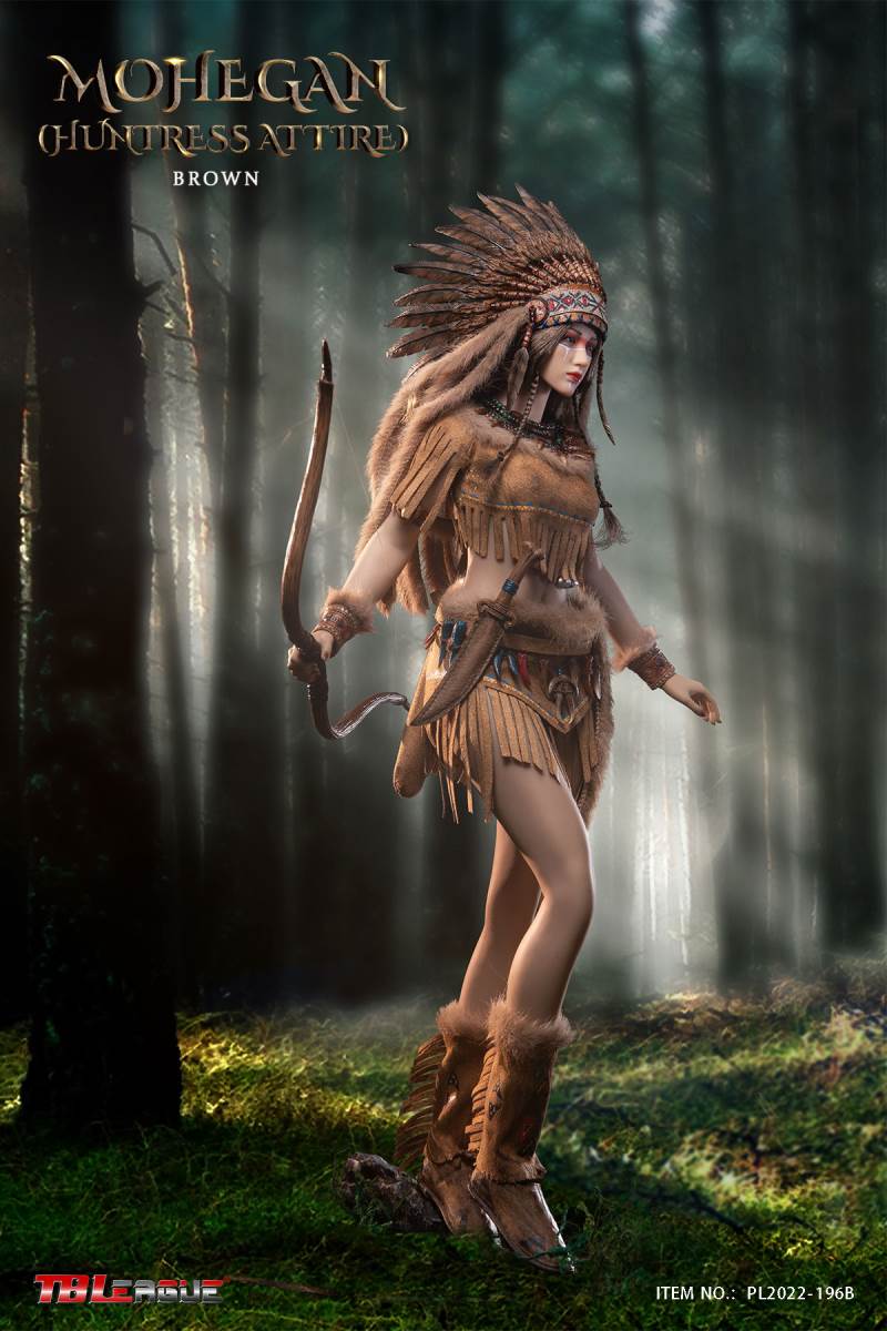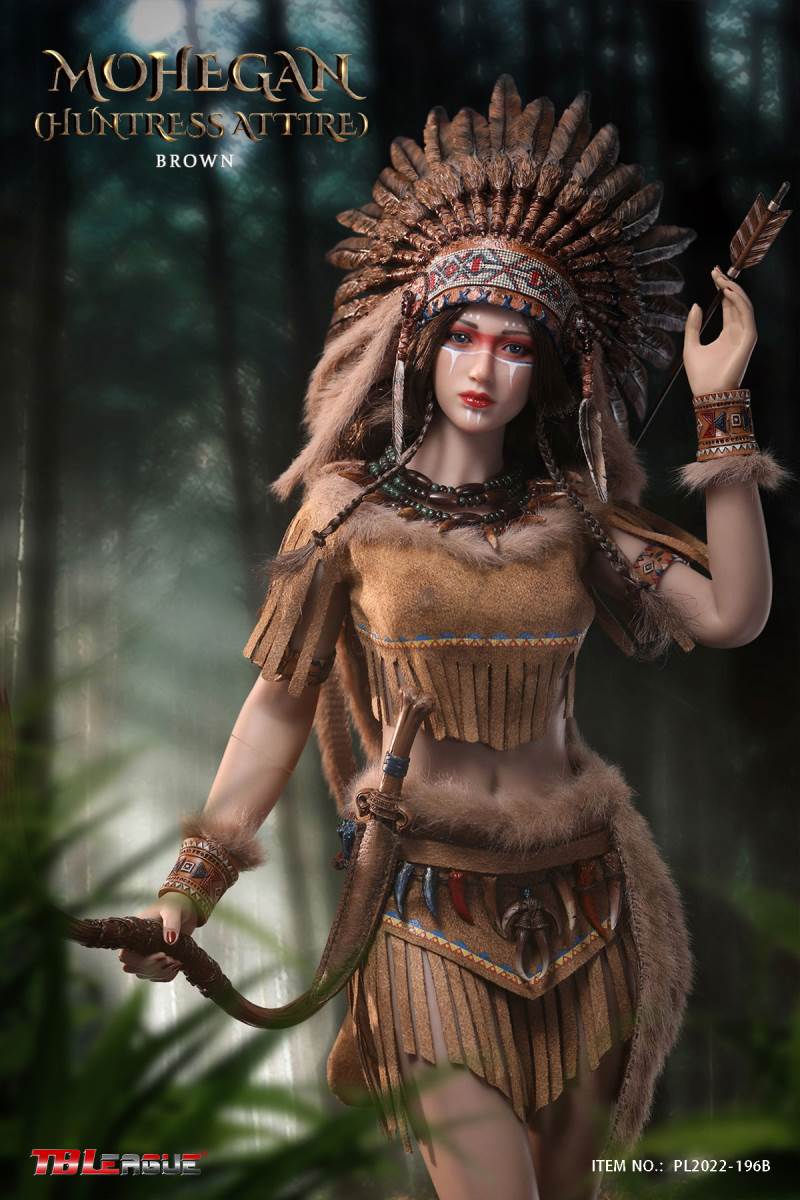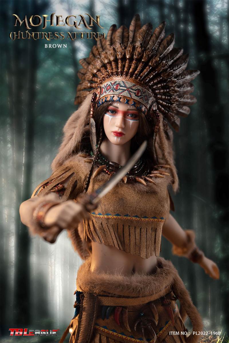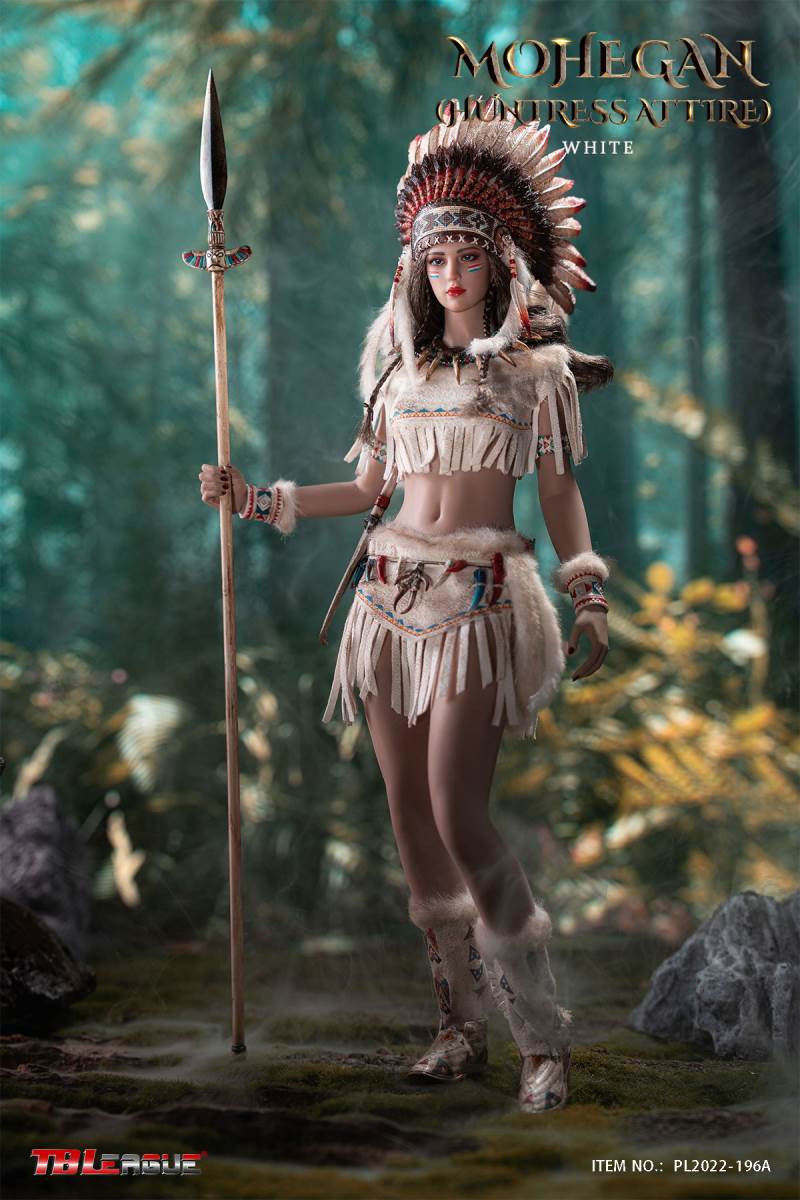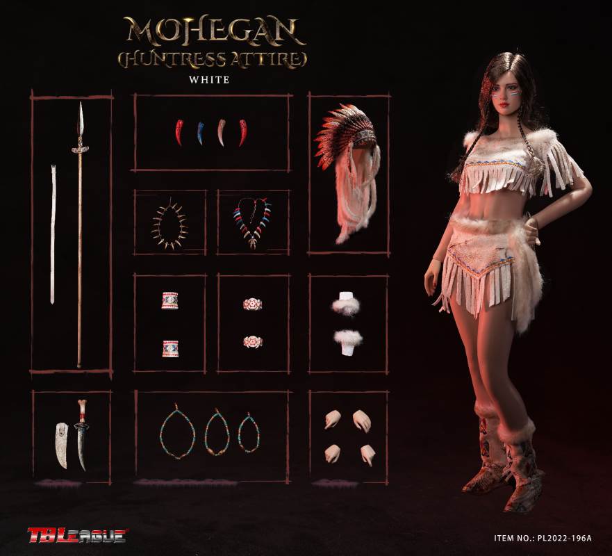 Mohegan (huntress attire)-White 1/6 Scale Action FigureItem Name: Mohegan (huntress attire)-White 1/6 Scale Action FigureItem No: PL2022-196ABar Code: 697 127233 152 6Packing List:1) 1 * war bonnet2) 1 * head sculpt3) 1 * TBLeague 1/6 scale female seamless body with metal skeleton4) 3 * bead necklace (different length)5) 1 * imitation beast tooth necklace6) 1 * clothes for upper body7) 1 * skirt8) 1 pair * underpants9) 1 pair * calf sleeves trimmed with faux fur10) 1 pair * shoes11) 1 pair * arm bands12) 1 pair * wrist bands13) 1 pair * wrist sleeves trimmed with faux fur14) 1 * waist chain with imitation beast teeth15) 4 * imitation beast teeth16) 1 * sheath for the dagger17) 1 * dagger18) 1 * white waist belt19) 1 * long spear20) 3 pairs* interchangeable handsPackaging:1 product/individual boxGW: 1.52 kgMeasurements: 24.3cm*11cm *38.0cm6 products/master cartonGW: 10.02 kgMeasurements: 50cm*36.7cm*40.5cm