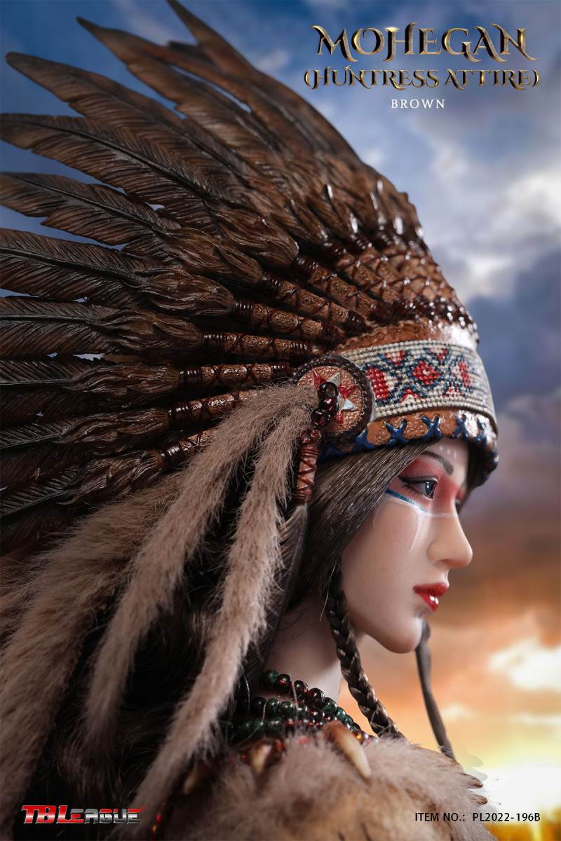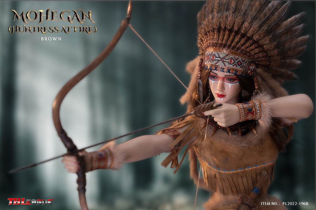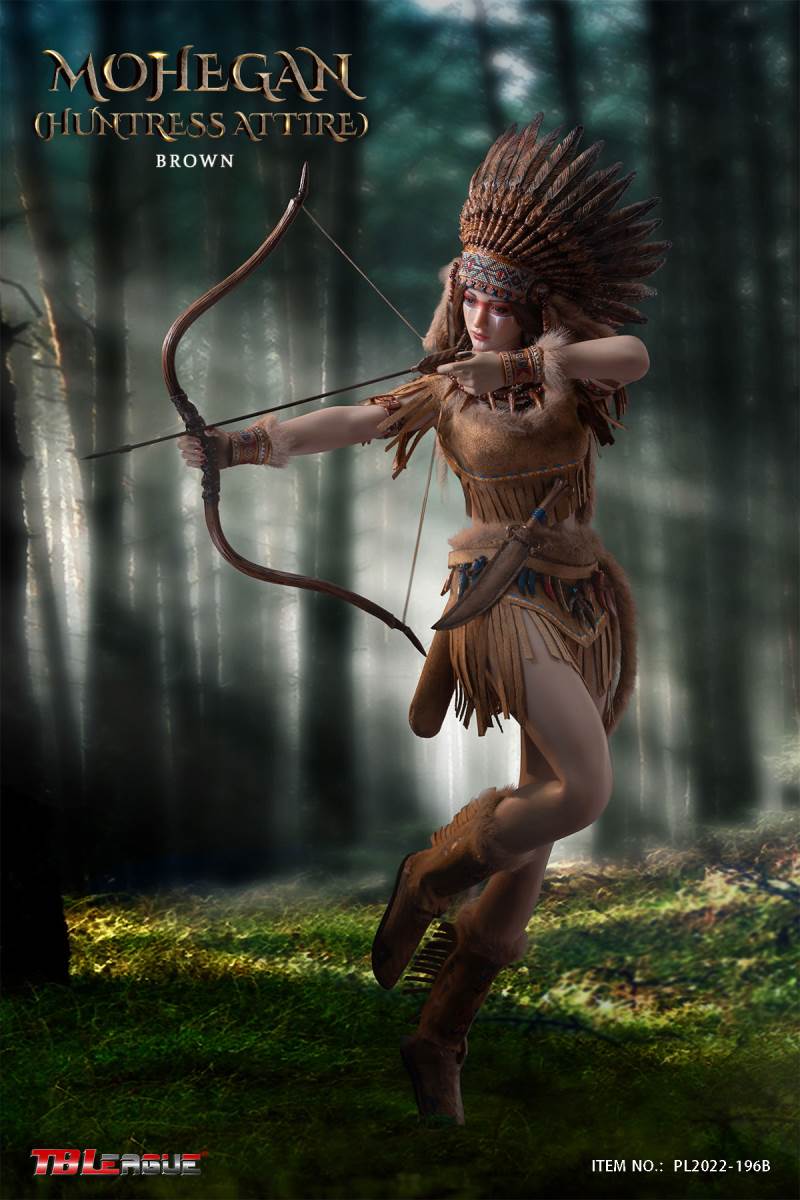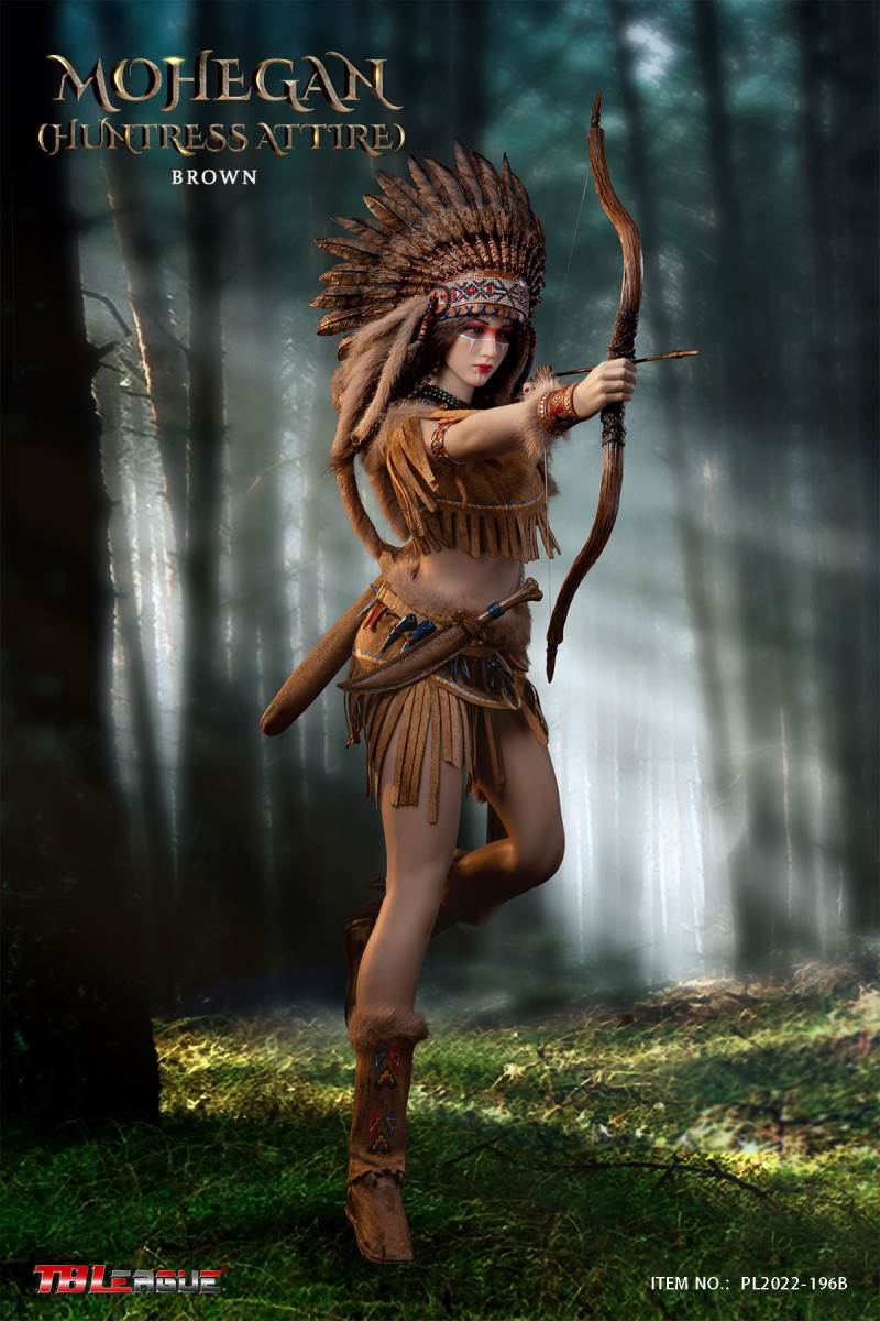 Mohegan (huntress attire)-White 1/6 Scale Action FigureItem Name: Mohegan (huntress attire)-White 1/6 Scale Action FigureItem No: PL2022-196ABar Code: 697 127233 152 6Packing List:1) 1 * war bonnet2) 1 * head sculpt3) 1 * TBLeague 1/6 scale female seamless body with metal skeleton4) 3 * bead necklace (different length)5) 1 * imitation beast tooth necklace6) 1 * clothes for upper body7) 1 * skirt8) 1 pair * underpants9) 1 pair * calf sleeves trimmed with faux fur10) 1 pair * shoes11) 1 pair * arm bands12) 1 pair * wrist bands13) 1 pair * wrist sleeves trimmed with faux fur14) 1 * waist chain with imitation beast teeth15) 4 * imitation beast teeth16) 1 * sheath for the dagger17) 1 * dagger18) 1 * white waist belt19) 1 * long spear20) 3 pairs* interchangeable handsPackaging:1 product/individual boxGW: 1.52 kgMeasurements: 24.3cm*11cm *38.0cm6 products/master cartonGW: 10.02 kgMeasurements: 50cm*36.7cm*40.5cm