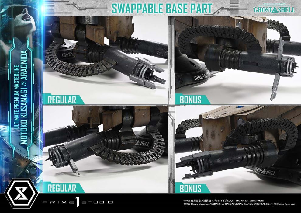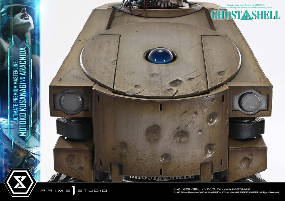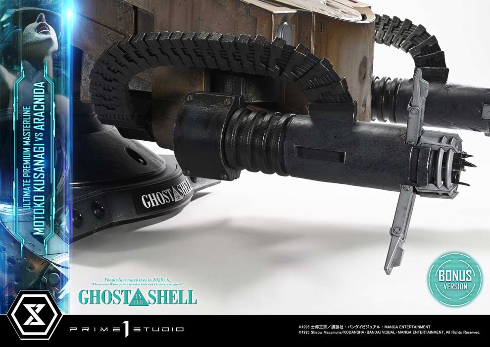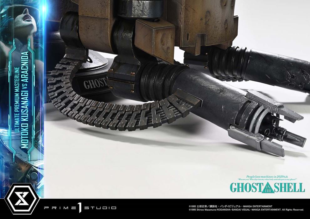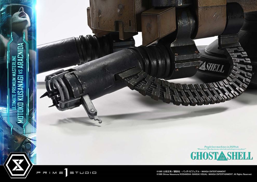 Shattered shell. Whispering ghost.The climactic moment of 2029, captured in 1/4 scaleReleased in theaters in 1995, GHOST IN THE SHELL continues to inspire tech culture around the world. From the visionary mind of director Mamoru Oshii, the iconic showdown between Motoko Kusanagi and the Arachnida comes to life in the Ultimate Premium Masterline series.This 1/4 scale statue captures the climactic moment where Public Security Section 9’s Major Motoko Kusanagi faces off alone against the autonomous multi-legged tank known as the Arachnida. She leaps onto the silent, imposing war machine, her cybernetic body pushed past its limits by sheer will. What does it mean to be human? This unforgettable scene offers one possible answer—now frozen in time and transformed into three-dimensional form, like a moment suspended in slow motion.Every element, from the torn thermoptic camouflage suit and exposed muscle fibers to the snapping cables, is sculpted and painted with precision. The overexertion of her body is most evident in her left arm as she strains to pry open the hatch. The tension flowing from forearm to fingertips is rendered with striking detail. Her face, caught between agony and resolve, gives form to the whisper of the ghost that drives her forward.Measuring 80 cm deep, the massive Arachnida dominates the scene with overwhelming presence, its design guiding the viewer’s gaze directly toward Kusanagi like visual speed lines. Bullet scars across its armored front, a glowing camera eye on its deck, and damaged manipulator arms all convey its cold, mechanical reality.This bonus version includes an alternate set of manipulator arms with a deployed Gatling gun, recreating the intense moment when Kusanagi is ambushed by a hail of gunfire during her infiltration. The tension of that instant comes vividly back to life in your display.Bring home the core themes and atmosphere of a legendary sci-fi anime. Take the dive into a world of expansive sculptural storytelling.Specifications:One (1) Swappable Pair of Arachnida Manipulator Arms (Damaged)One (1) Swappable Pair of Arachnida Manipulator Arms (Firing) [BONUS PART]Notice:Prototype samples shown.Product details could be subject to change without further notice.Please note the final product specifications may differ because each product is Handmade.Since the product is still in the development stage, the Size (up to 10%) & Weight (up to 10kg) may be changed during the production stage.©1995 Shirow Masamune/KODANSHA・BANDAI VISUAL・MANGA ENTERTAINMENT. All Rights Reserved.DETAILSBrandsPRIME 1 STATUECollectionUltimate Premium MasterlineSeriesGhost in the ShellScale1/4 ScaleProduct CodeUPMGITS-02SProduct Size Approx.H:68cm W:49cm D:80cmH:68cm W:53cm D:80cm(Firing Manipulator Arms)Carton(Est):1 boxProduct Weight Approx.25.4 kgCarton Size Approx.Carton A [ H 58cm × W 74cm × D 48.5cm ]MaterialsPolystone and other materialsJAN4582647122063