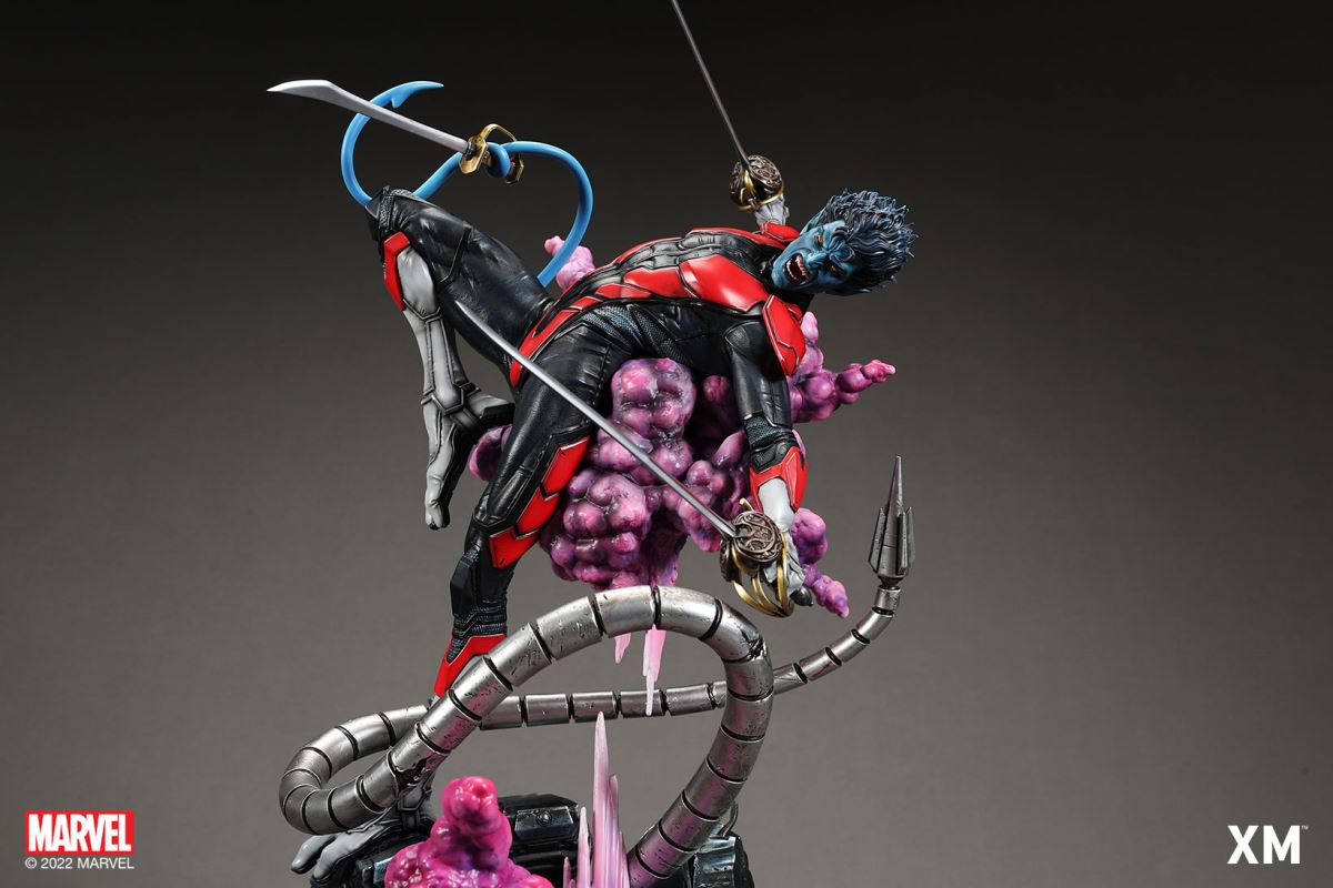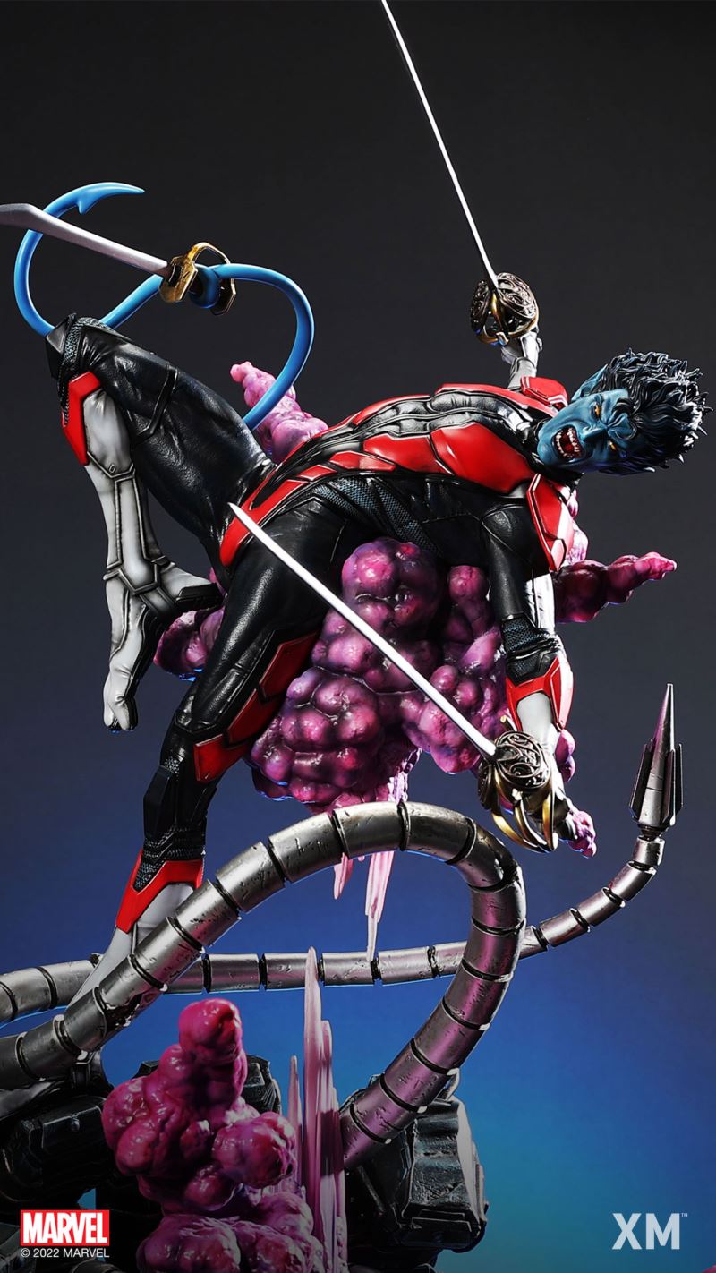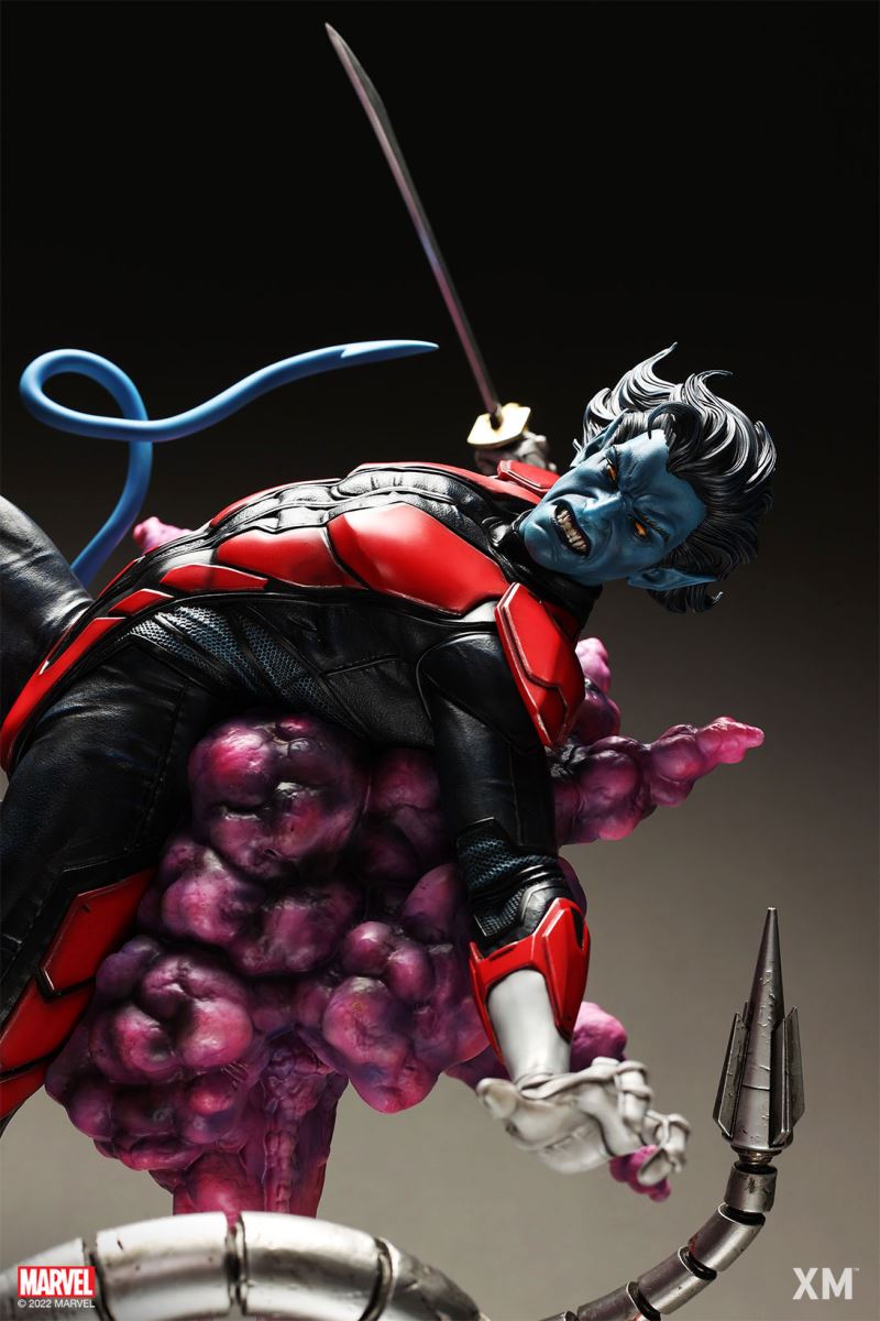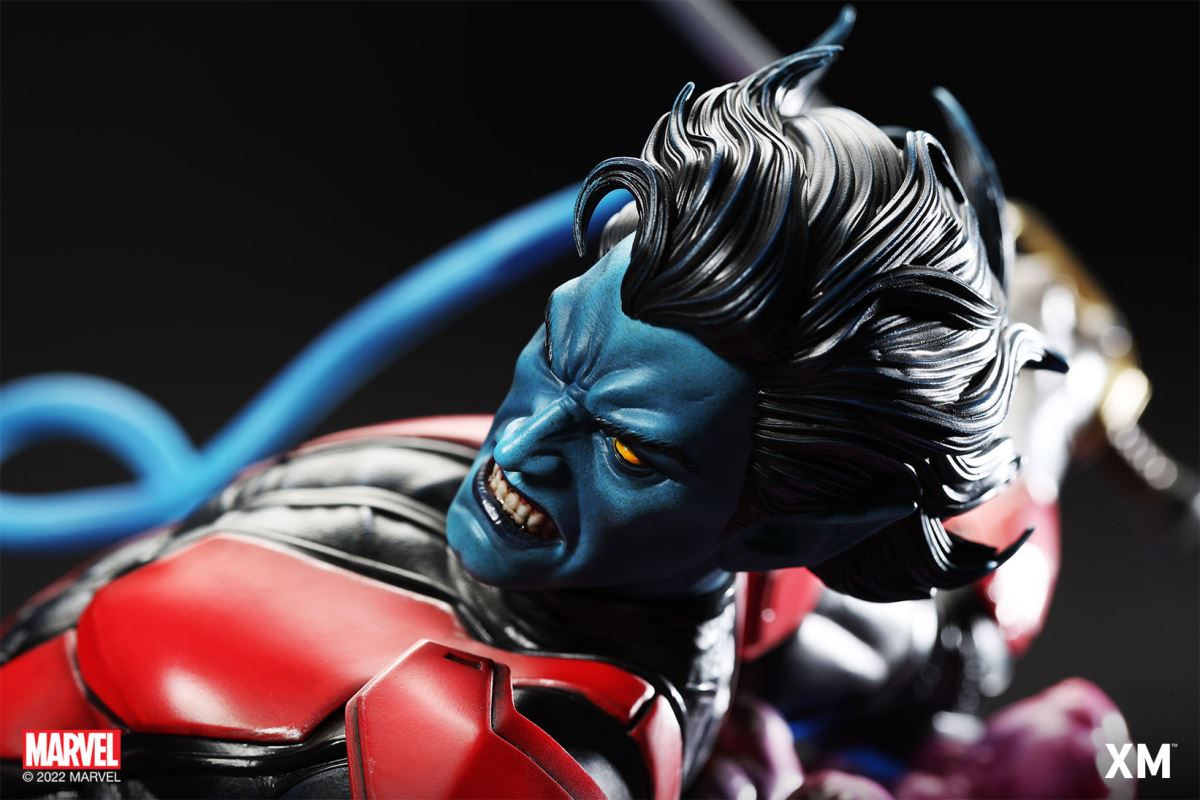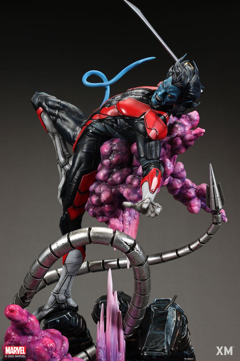 XM Studios is excited to present our next 1/4 scale MARVEL Premium Collectibles series statue, Nightcrawler (Classic). Each painstakingly handcrafted statue is individually hand-painted with the highest possible XM’s famous quality finish.Nightcrawler’s agility and acrobatic reflexes are showcased here as he teleports away from Sentinel’s tentacles, leaving a trail of BAMF! cloud as he carries the momentum and prepares to launch a downward attack. This is a dynamic piece packed with movement and action that is further highlighted by the Sentinel’s tentacles twining around, following the mutant hero as Sentinel attempts an attack.Kurt Wagner is donned in his red and black outfit which is modernized with textures and panels. His blue prehensile tail curls behind him as he springs into action.Collectors can choose between various head, arms and tail switch outs for swashbuckling, trio-swords wielding Nightcrawler, or a more iconic portrait featuring his shorter hair, equipped with 1 sword.Character BackgroundBorn in Bavaria to the blue-skinned shapeshifting mutant later known as Mystique, Kurt Wagner was shunned at birth due to his having blue skin, pointed ears, fangs, and a long pointed tail. At the time disguised as Baroness Wagner, Mystique's true identity was revealed after she gave birth to Kurt, and the pair were chased by an angry mob. Fleeing to the nearby falls, Mystique threw the infant Kurt over the edge and fled. Read more at https://www.marvel.com/characters/nightcrawlerThe Nightcrawler (Classic) Premium Collectibles statue features:Two (2) head sculpts: 1 with snarling portrait, 1 with baring teeth portraitTwo (2) left arm switch outs: 1 without weapon, 1 wielding a sword resembling cutlassTwo (2) right arm switch outs: 1 wielding a sword resembling cutlass, 1 wielding a rapier with ornate decorationsTwo (2) tail switch outs: 1 without weapon, 1 wielding a rapier with ornate decorationsHighly detailed sculpt featuring Nightcrawler (Classic) teleporting away from SentinelCrafted in PolystoneEach painstakingly handcrafted statue is individually hand-painted with the highest possible quality finishES: 299Artists:Jorge Molina (2D)Juan Nahuel Novelletto (3D)XM Studios Design and Development TeamManufactured by:XM StudiosProduct and Box DimensionsProduct Size: 43*45*83cmEst. Box Size: 80*45*40cmEst. Product Weight: 22kgEst. Shipping Weight: 25kgNote: Prototype shown and pending final approval, final product may differ. Batteries will not be included for products with light up features due to customs.