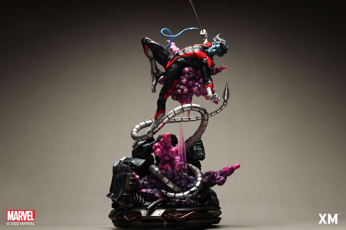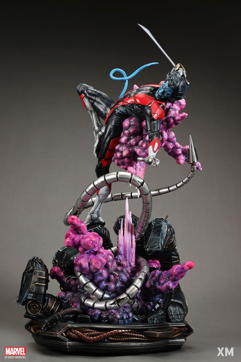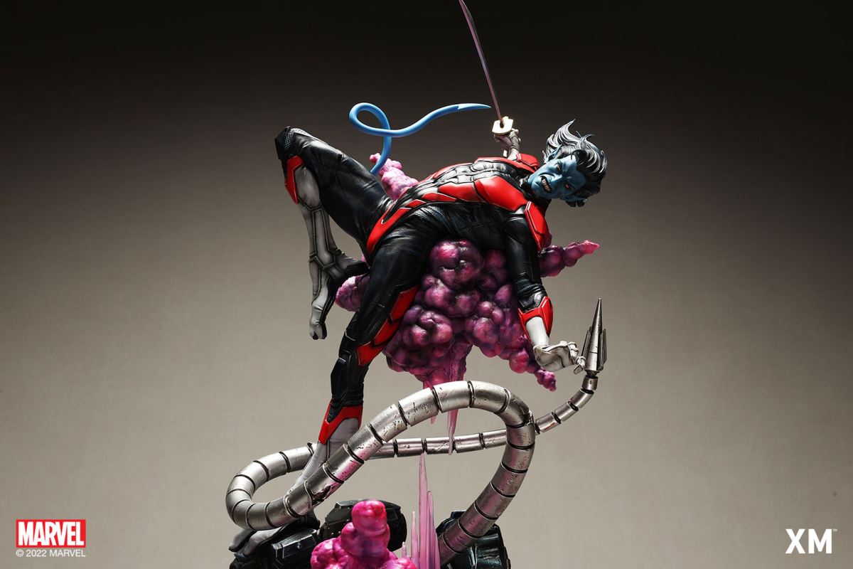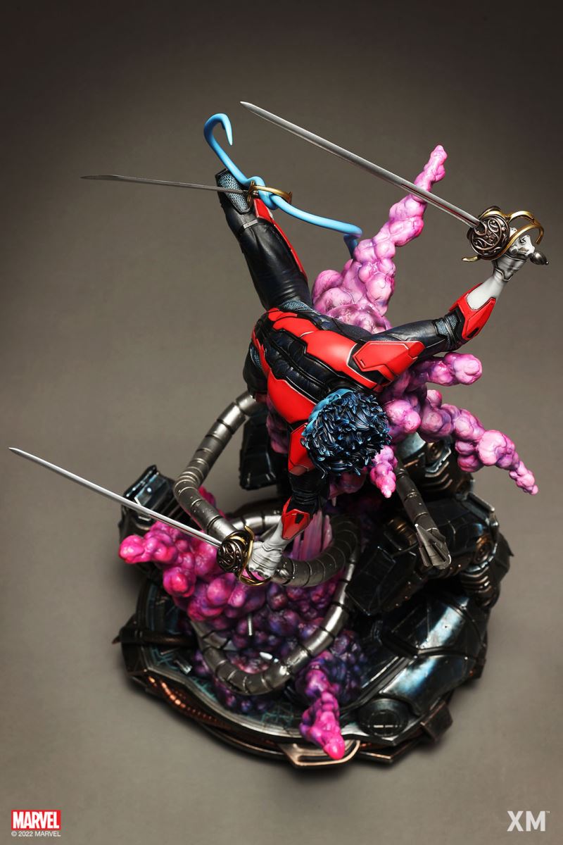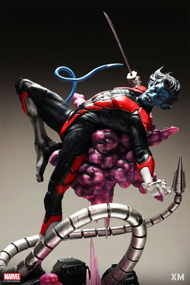 XM Studios is excited to present our next 1/4 scale MARVEL Premium Collectibles series statue, Nightcrawler (Classic). Each painstakingly handcrafted statue is individually hand-painted with the highest possible XM’s famous quality finish.Nightcrawler’s agility and acrobatic reflexes are showcased here as he teleports away from Sentinel’s tentacles, leaving a trail of BAMF! cloud as he carries the momentum and prepares to launch a downward attack. This is a dynamic piece packed with movement and action that is further highlighted by the Sentinel’s tentacles twining around, following the mutant hero as Sentinel attempts an attack.Kurt Wagner is donned in his red and black outfit which is modernized with textures and panels. His blue prehensile tail curls behind him as he springs into action.Collectors can choose between various head, arms and tail switch outs for swashbuckling, trio-swords wielding Nightcrawler, or a more iconic portrait featuring his shorter hair, equipped with 1 sword.Character BackgroundBorn in Bavaria to the blue-skinned shapeshifting mutant later known as Mystique, Kurt Wagner was shunned at birth due to his having blue skin, pointed ears, fangs, and a long pointed tail. At the time disguised as Baroness Wagner, Mystique's true identity was revealed after she gave birth to Kurt, and the pair were chased by an angry mob. Fleeing to the nearby falls, Mystique threw the infant Kurt over the edge and fled. Read more at https://www.marvel.com/characters/nightcrawlerThe Nightcrawler (Classic) Premium Collectibles statue features:Two (2) head sculpts: 1 with snarling portrait, 1 with baring teeth portraitTwo (2) left arm switch outs: 1 without weapon, 1 wielding a sword resembling cutlassTwo (2) right arm switch outs: 1 wielding a sword resembling cutlass, 1 wielding a rapier with ornate decorationsTwo (2) tail switch outs: 1 without weapon, 1 wielding a rapier with ornate decorationsHighly detailed sculpt featuring Nightcrawler (Classic) teleporting away from SentinelCrafted in PolystoneEach painstakingly handcrafted statue is individually hand-painted with the highest possible quality finishES: 299Artists:Jorge Molina (2D)Juan Nahuel Novelletto (3D)XM Studios Design and Development TeamManufactured by:XM StudiosProduct and Box DimensionsProduct Size: 43*45*83cmEst. Box Size: 80*45*40cmEst. Product Weight: 22kgEst. Shipping Weight: 25kgNote: Prototype shown and pending final approval, final product may differ. Batteries will not be included for products with light up features due to customs.