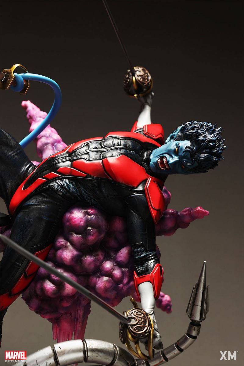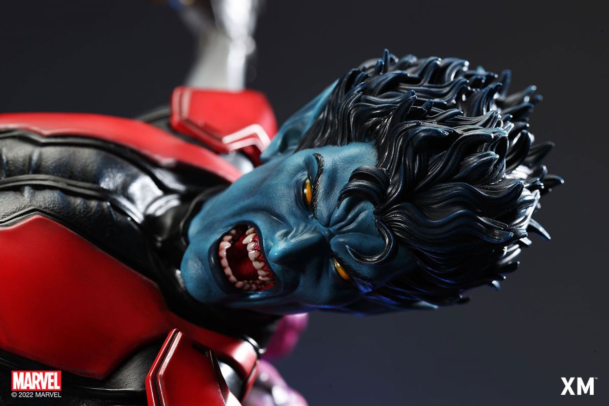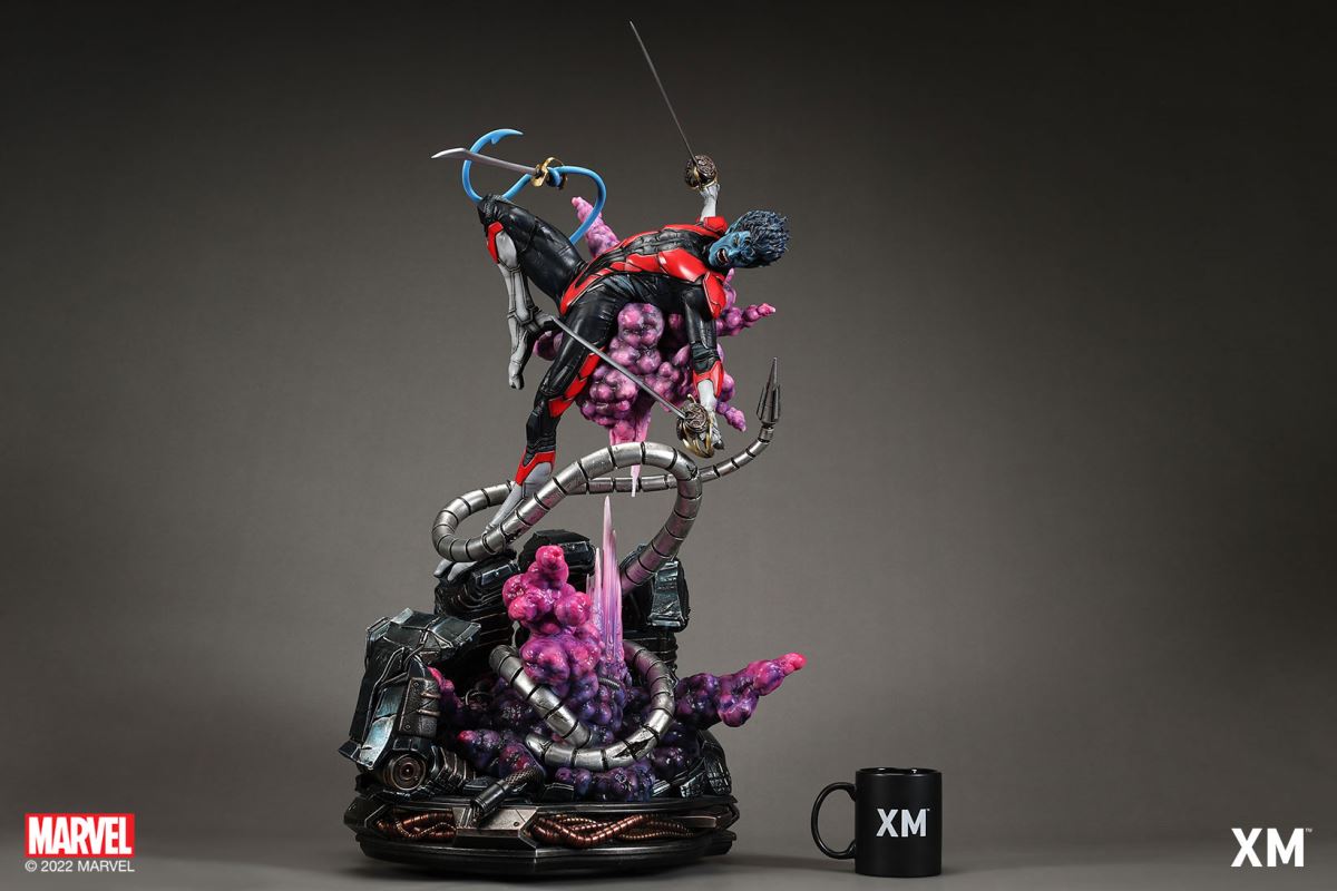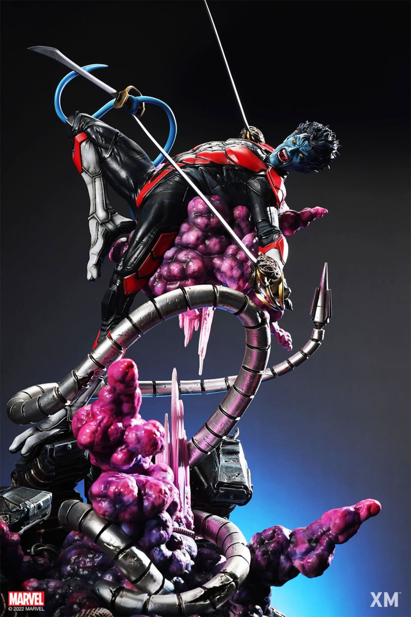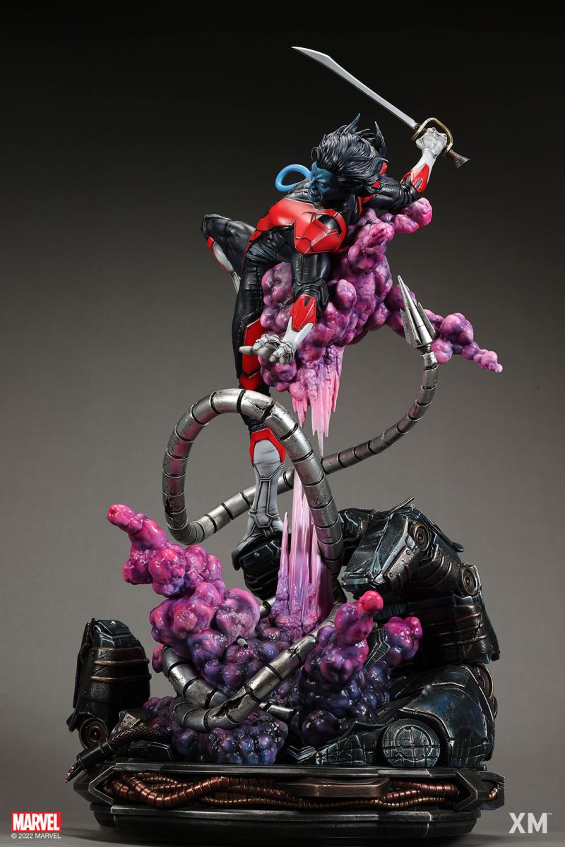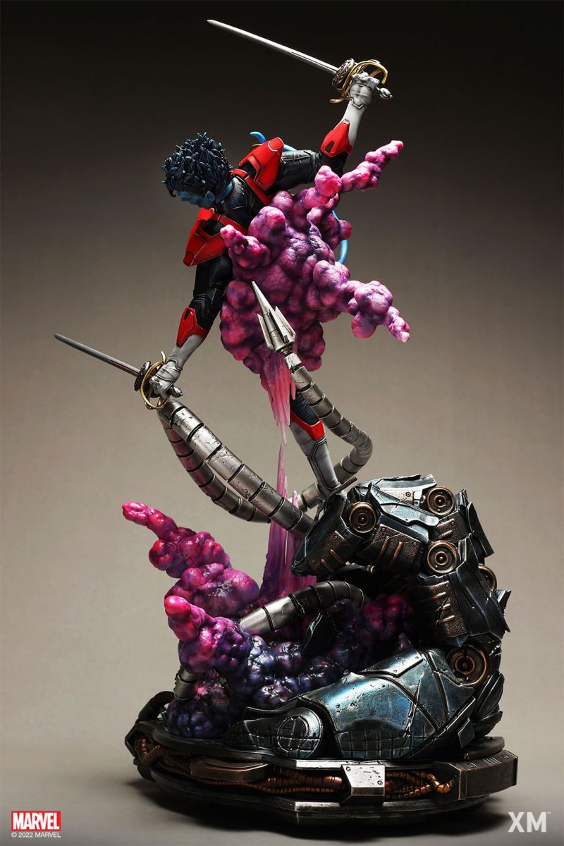 XM Studios is excited to present our next 1/4 scale MARVEL Premium Collectibles series statue, Nightcrawler (Classic). Each painstakingly handcrafted statue is individually hand-painted with the highest possible XM’s famous quality finish.Nightcrawler’s agility and acrobatic reflexes are showcased here as he teleports away from Sentinel’s tentacles, leaving a trail of BAMF! cloud as he carries the momentum and prepares to launch a downward attack. This is a dynamic piece packed with movement and action that is further highlighted by the Sentinel’s tentacles twining around, following the mutant hero as Sentinel attempts an attack.Kurt Wagner is donned in his red and black outfit which is modernized with textures and panels. His blue prehensile tail curls behind him as he springs into action.Collectors can choose between various head, arms and tail switch outs for swashbuckling, trio-swords wielding Nightcrawler, or a more iconic portrait featuring his shorter hair, equipped with 1 sword.Character BackgroundBorn in Bavaria to the blue-skinned shapeshifting mutant later known as Mystique, Kurt Wagner was shunned at birth due to his having blue skin, pointed ears, fangs, and a long pointed tail. At the time disguised as Baroness Wagner, Mystique's true identity was revealed after she gave birth to Kurt, and the pair were chased by an angry mob. Fleeing to the nearby falls, Mystique threw the infant Kurt over the edge and fled. Read more at https://www.marvel.com/characters/nightcrawlerThe Nightcrawler (Classic) Premium Collectibles statue features:Two (2) head sculpts: 1 with snarling portrait, 1 with baring teeth portraitTwo (2) left arm switch outs: 1 without weapon, 1 wielding a sword resembling cutlassTwo (2) right arm switch outs: 1 wielding a sword resembling cutlass, 1 wielding a rapier with ornate decorationsTwo (2) tail switch outs: 1 without weapon, 1 wielding a rapier with ornate decorationsHighly detailed sculpt featuring Nightcrawler (Classic) teleporting away from SentinelCrafted in PolystoneEach painstakingly handcrafted statue is individually hand-painted with the highest possible quality finishES: 299Artists:Jorge Molina (2D)Juan Nahuel Novelletto (3D)XM Studios Design and Development TeamManufactured by:XM StudiosProduct and Box DimensionsProduct Size: 43*45*83cmEst. Box Size: 80*45*40cmEst. Product Weight: 22kgEst. Shipping Weight: 25kgNote: Prototype shown and pending final approval, final product may differ. Batteries will not be included for products with light up features due to customs.