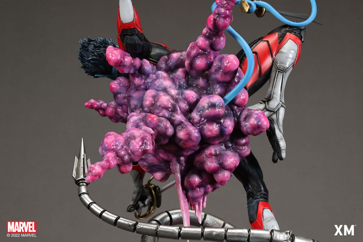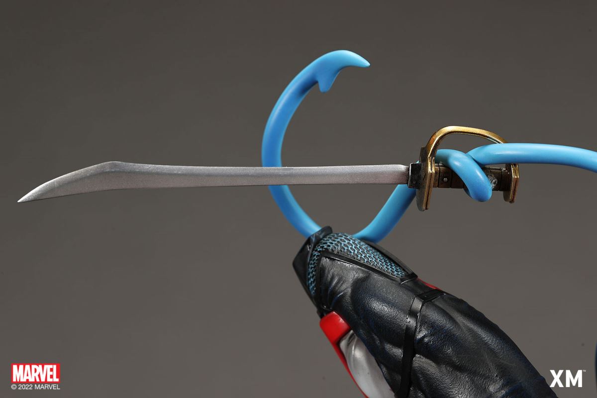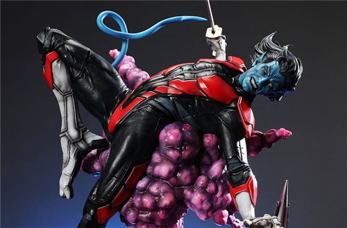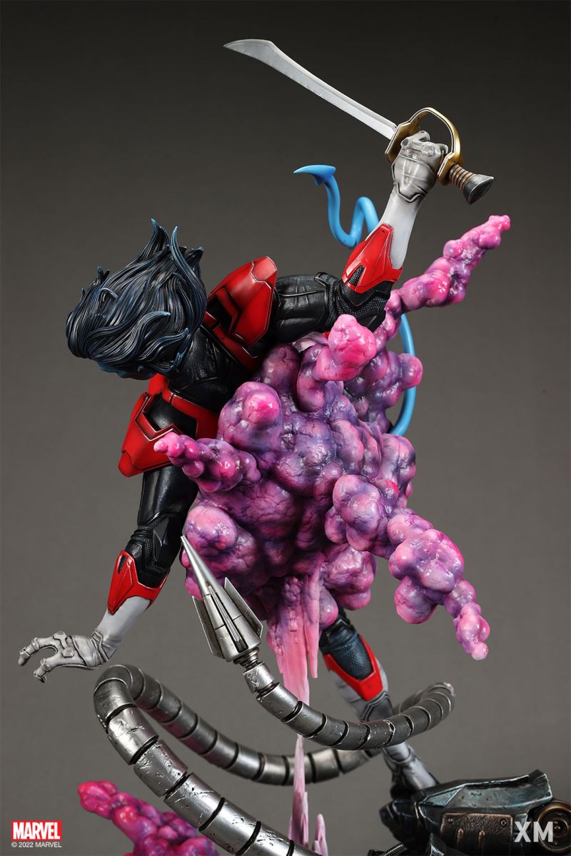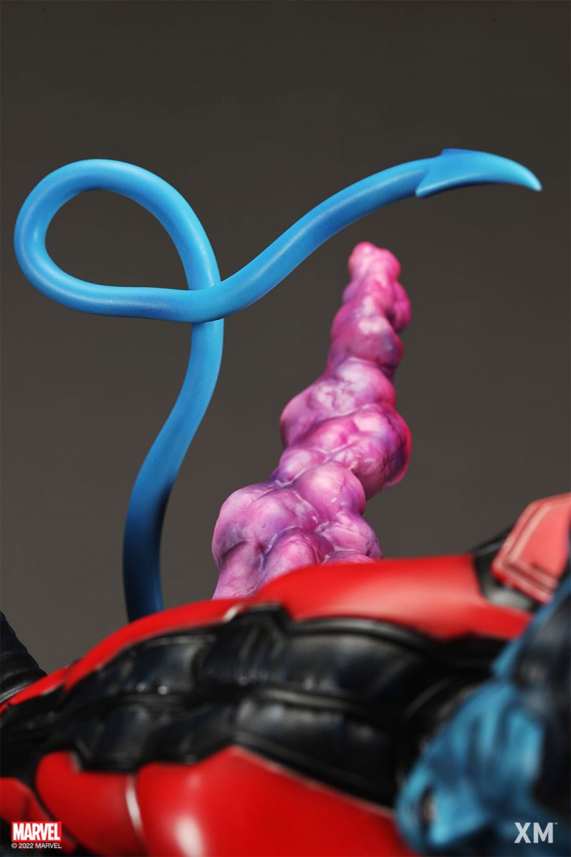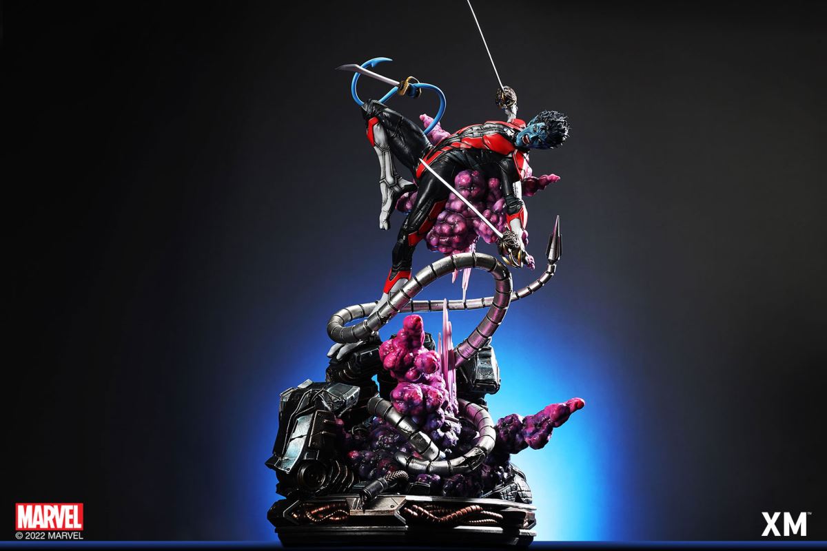 XM Studios is excited to present our next 1/4 scale MARVEL Premium Collectibles series statue, Nightcrawler (Classic). Each painstakingly handcrafted statue is individually hand-painted with the highest possible XM’s famous quality finish.Nightcrawler’s agility and acrobatic reflexes are showcased here as he teleports away from Sentinel’s tentacles, leaving a trail of BAMF! cloud as he carries the momentum and prepares to launch a downward attack. This is a dynamic piece packed with movement and action that is further highlighted by the Sentinel’s tentacles twining around, following the mutant hero as Sentinel attempts an attack.Kurt Wagner is donned in his red and black outfit which is modernized with textures and panels. His blue prehensile tail curls behind him as he springs into action.Collectors can choose between various head, arms and tail switch outs for swashbuckling, trio-swords wielding Nightcrawler, or a more iconic portrait featuring his shorter hair, equipped with 1 sword.Character BackgroundBorn in Bavaria to the blue-skinned shapeshifting mutant later known as Mystique, Kurt Wagner was shunned at birth due to his having blue skin, pointed ears, fangs, and a long pointed tail. At the time disguised as Baroness Wagner, Mystique's true identity was revealed after she gave birth to Kurt, and the pair were chased by an angry mob. Fleeing to the nearby falls, Mystique threw the infant Kurt over the edge and fled. Read more at https://www.marvel.com/characters/nightcrawlerThe Nightcrawler (Classic) Premium Collectibles statue features:Two (2) head sculpts: 1 with snarling portrait, 1 with baring teeth portraitTwo (2) left arm switch outs: 1 without weapon, 1 wielding a sword resembling cutlassTwo (2) right arm switch outs: 1 wielding a sword resembling cutlass, 1 wielding a rapier with ornate decorationsTwo (2) tail switch outs: 1 without weapon, 1 wielding a rapier with ornate decorationsHighly detailed sculpt featuring Nightcrawler (Classic) teleporting away from SentinelCrafted in PolystoneEach painstakingly handcrafted statue is individually hand-painted with the highest possible quality finishES: 299Artists:Jorge Molina (2D)Juan Nahuel Novelletto (3D)XM Studios Design and Development TeamManufactured by:XM StudiosProduct and Box DimensionsProduct Size: 43*45*83cmEst. Box Size: 80*45*40cmEst. Product Weight: 22kgEst. Shipping Weight: 25kgNote: Prototype shown and pending final approval, final product may differ. Batteries will not be included for products with light up features due to customs.