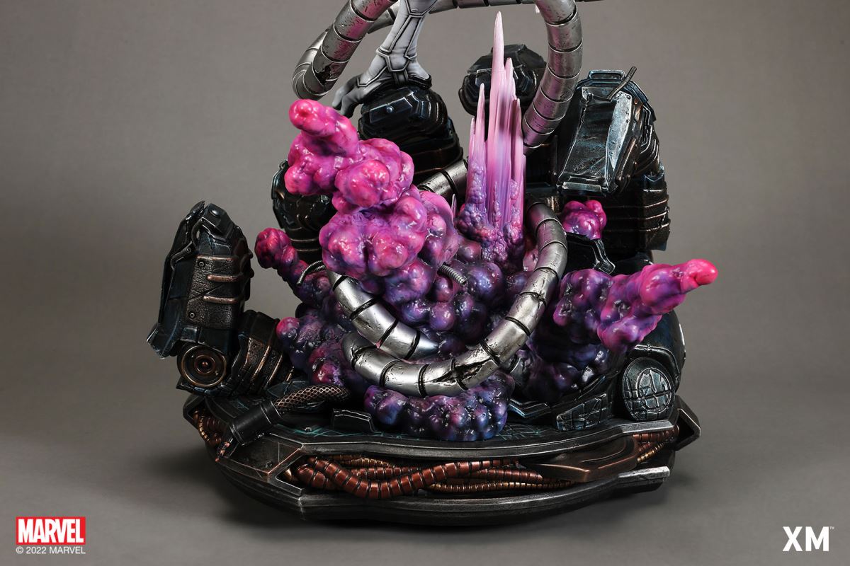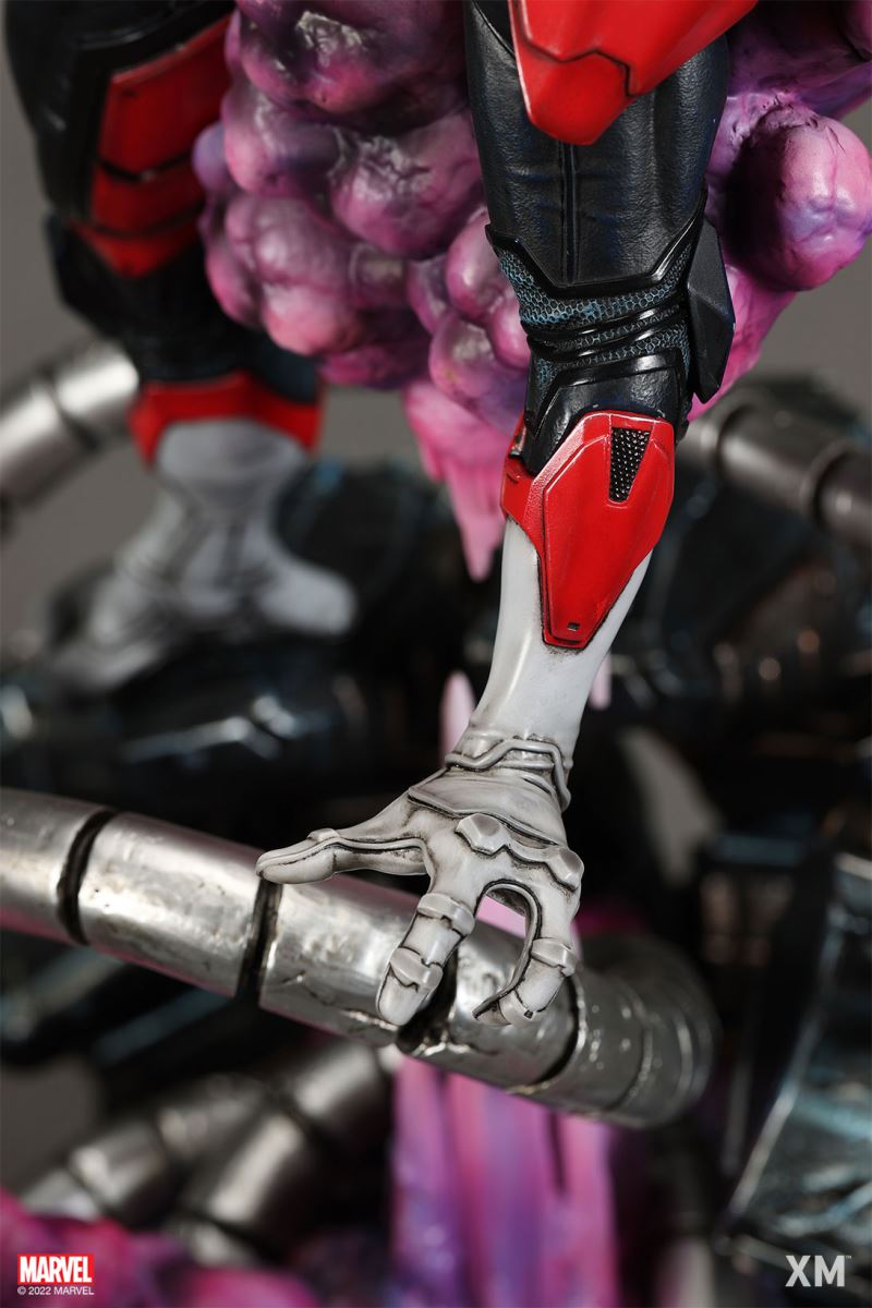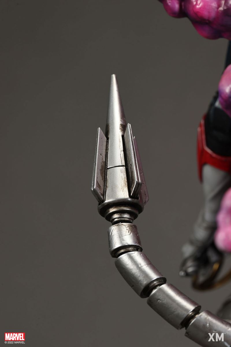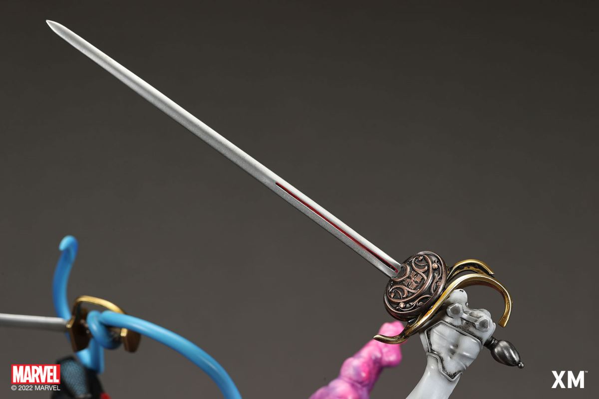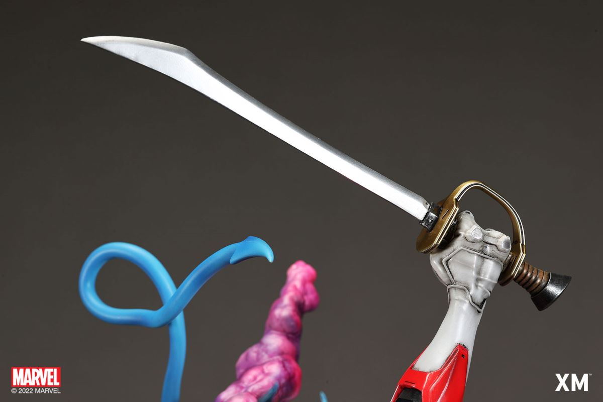 XM Studios is excited to present our next 1/4 scale MARVEL Premium Collectibles series statue, Nightcrawler (Classic). Each painstakingly handcrafted statue is individually hand-painted with the highest possible XM’s famous quality finish.Nightcrawler’s agility and acrobatic reflexes are showcased here as he teleports away from Sentinel’s tentacles, leaving a trail of BAMF! cloud as he carries the momentum and prepares to launch a downward attack. This is a dynamic piece packed with movement and action that is further highlighted by the Sentinel’s tentacles twining around, following the mutant hero as Sentinel attempts an attack.Kurt Wagner is donned in his red and black outfit which is modernized with textures and panels. His blue prehensile tail curls behind him as he springs into action.Collectors can choose between various head, arms and tail switch outs for swashbuckling, trio-swords wielding Nightcrawler, or a more iconic portrait featuring his shorter hair, equipped with 1 sword.Character BackgroundBorn in Bavaria to the blue-skinned shapeshifting mutant later known as Mystique, Kurt Wagner was shunned at birth due to his having blue skin, pointed ears, fangs, and a long pointed tail. At the time disguised as Baroness Wagner, Mystique's true identity was revealed after she gave birth to Kurt, and the pair were chased by an angry mob. Fleeing to the nearby falls, Mystique threw the infant Kurt over the edge and fled. Read more at https://www.marvel.com/characters/nightcrawlerThe Nightcrawler (Classic) Premium Collectibles statue features:Two (2) head sculpts: 1 with snarling portrait, 1 with baring teeth portraitTwo (2) left arm switch outs: 1 without weapon, 1 wielding a sword resembling cutlassTwo (2) right arm switch outs: 1 wielding a sword resembling cutlass, 1 wielding a rapier with ornate decorationsTwo (2) tail switch outs: 1 without weapon, 1 wielding a rapier with ornate decorationsHighly detailed sculpt featuring Nightcrawler (Classic) teleporting away from SentinelCrafted in PolystoneEach painstakingly handcrafted statue is individually hand-painted with the highest possible quality finishES: 299Artists:Jorge Molina (2D)Juan Nahuel Novelletto (3D)XM Studios Design and Development TeamManufactured by:XM StudiosProduct and Box DimensionsProduct Size: 43*45*83cmEst. Box Size: 80*45*40cmEst. Product Weight: 22kgEst. Shipping Weight: 25kgNote: Prototype shown and pending final approval, final product may differ. Batteries will not be included for products with light up features due to customs.