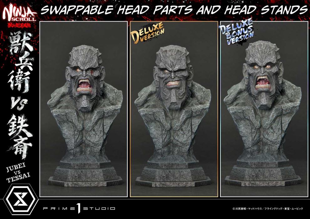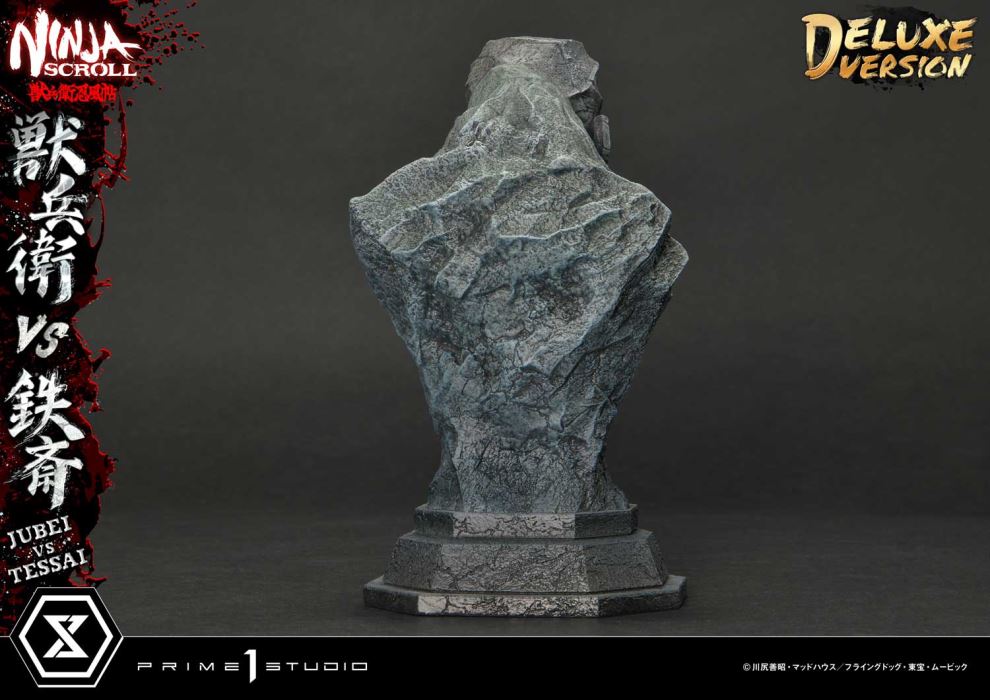 “Oh, my best hat...”A Razor-Sharp Slash, Tearing Through Fate.The Legendary Sword Fight, Dynamically Realized.With its groundbreaking action and beautiful design, Ninja Scroll has left a lasting mark on anime history. Now, more than 30 years since its release, the fierce battle between Jubei and Tessai makes its debut in the Ultimate Premium Masterline series!This statue dynamically captures the sword fight that marks the beginning of the fierce clash between Jubei Kibagami and the Eight Devils of Kimon. The layout, featuring stone lanterns and dynamic effects, creates a strong sense of spatial depth. Moreover, Jubei’s unforgettable slash, a highlight of the film, is brought to life with an LED lighting feature. The light slicing through the base vividly conveys the sharp trajectory of his blade.Naturally, every detail has been carefully crafted to faithfully recreate the outstanding character designs and artwork of Yutaka Minowa. From their rugged faces, piercing gazes, and realistic muscle definition to the natural flow of their clothing, every angle of this piece offers something to admire.The DX Bonus Version includes additional head parts and head stands. Jubei reveals his wounded face beneath his woven hat, while Tessai wears a sneering expression as he looks down at his opponent. These interchangeable parts allow for various display options to suit your preferences.Additionally, this version comes with an exclusive Tessai head part, featuring him with eyes wide open in a fierce battle cry. This piece perfectly captures his overwhelming power and arrogance, traits that helped him annihilate the Kouga clan of Mochizuki in an instant.Long-time fans of Ninja Scroll will surely be thrilled, and some may even be inspired to watch the anime for the first time thanks to this statue,” said director Yoshiaki Kawajiri. This timeless legend, revived through modern sculpting techniques, is a gift to both new and old fans alike!Specifications:Ninja Scroll Themed Base (with LED Illumination)Two (2) Swappable Jubei Heads (Bare Face, Wearing Woven Hat)One (1) Jubei Head StandTwo (2) Swappable Tessai Heads (Bleeding from Left Eye, Sneering)One (1) Tessai Head StandOne (1) Swappable Bonus Tessai Head (Shouting) [BONUS PART]One (1) Tessai Bonus Head Stand [BONUS PART] LED Power Supply Method: TBA* Please prepare batteries, USB cables, or other necessary items depending on the final power supply method.Notice:Prototype samples shown.Product details could be subject to change without further notice.Please note the final product specifications may differ because each product is Handmade.Since the product is still in the development stage, the Size (up to 10%) & Weight (up to 10kg) may be changed during the production stage.©川尻善昭・マッドハウス/フライングドッグ・東宝・ムービックDETAILSBrandsPRIME 1 STATUECollectionUltimate Premium MasterlineSeriesNinja ScrollScale1/4 ScaleProduct CodeUPMNS-01DXSProduct Size Approx.H:101cm W:73cm D:36cmCarton(Est):3 boxProduct Weight Approx.29.7 kgMaterialsPolystone and other materialsJAN4582647120519