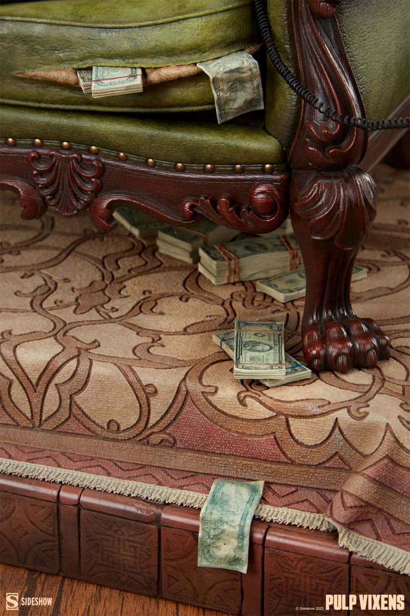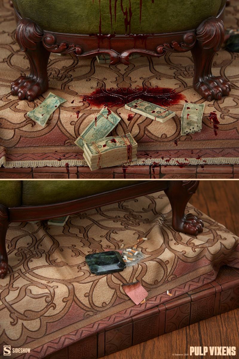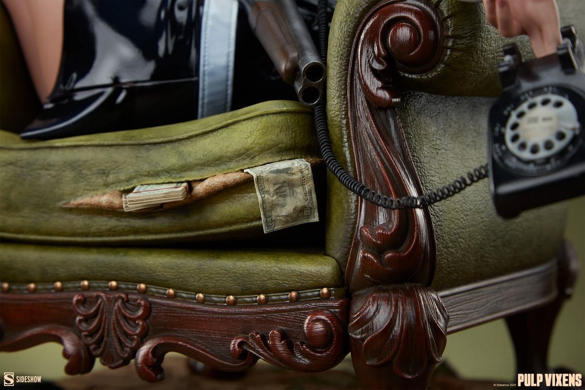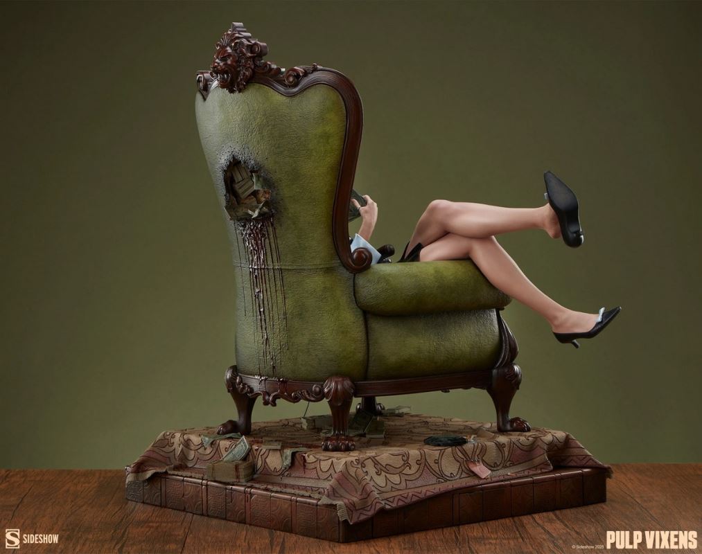 Charm? Charisma? Dumb luck? Call it what you like — Eleanor Bridgeburn has it to spare.Step into a world of power plays, deception, and danger with the Pulp Vixens: Killer Return Premium FormatTM Figure from Sideshow Originals.Payback’s a blonde! All eyes are on Eleanor Bridgeburn as she nimbly infiltrates the private study of a corrupt diplomat with ties to an international arms syndicate. This isn’t her first dance with danger and it certainly won’t be her last, which is more than she can say for her target. It seems the late ambassador’s upholstery had an ulterior purpose, as bundles of illicit bills spill out of every rip, tear, and double-barrel blast hole through the fabric. (That's one way to make a withdrawal!) Luxuriously reclined in the lavish armchair, Eleanor phones in the success of her latest job to an unseen handler — you’ll never guess where the money was hidden!The polystone Pulp Vixens: Killer Return Premium FormatTM Figure stands 18” tall x 17” wide x 13.75” deep, fully sculpted to capture the poise and panache that Eleanor, code name Darling, brings to her deadly missions. Dressed in ‘60s mod style, the agent’s black and white coat is both fashionable and functional for messy jobs. This quarter-scale pinup statue also includes two portraits: one with a blonde updo and checkered sunglasses, the other wearing a white wig and a rain hat to match her espionage ensemble. The aftermath of her assignment is woven into every scenic detail, from the ashtray and burned papers to the bloodstained rug now sitting askew in the study.Better keep your wits about you: Eleanor always delivers payback — with interest. Add the Pulp Vixens: Killer Return Premium FormatTM Figure to your collection now and let the games beginPurchase LimitsLimit of 2 per person.MaterialsPolystoneWarning: Cancer and reproductive harm. For exposures to both listed carcinogens and reproductive toxicants.Product SizeHeight: 18 (46 cm)Width: 17 (43 cm)Depth: 13.75 (35 cm) ** Size and weight are approx. valuesLearn moreSKU 300940UPC 747720276987