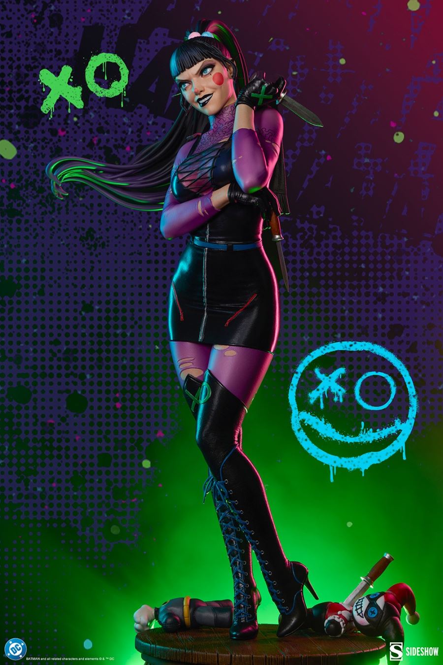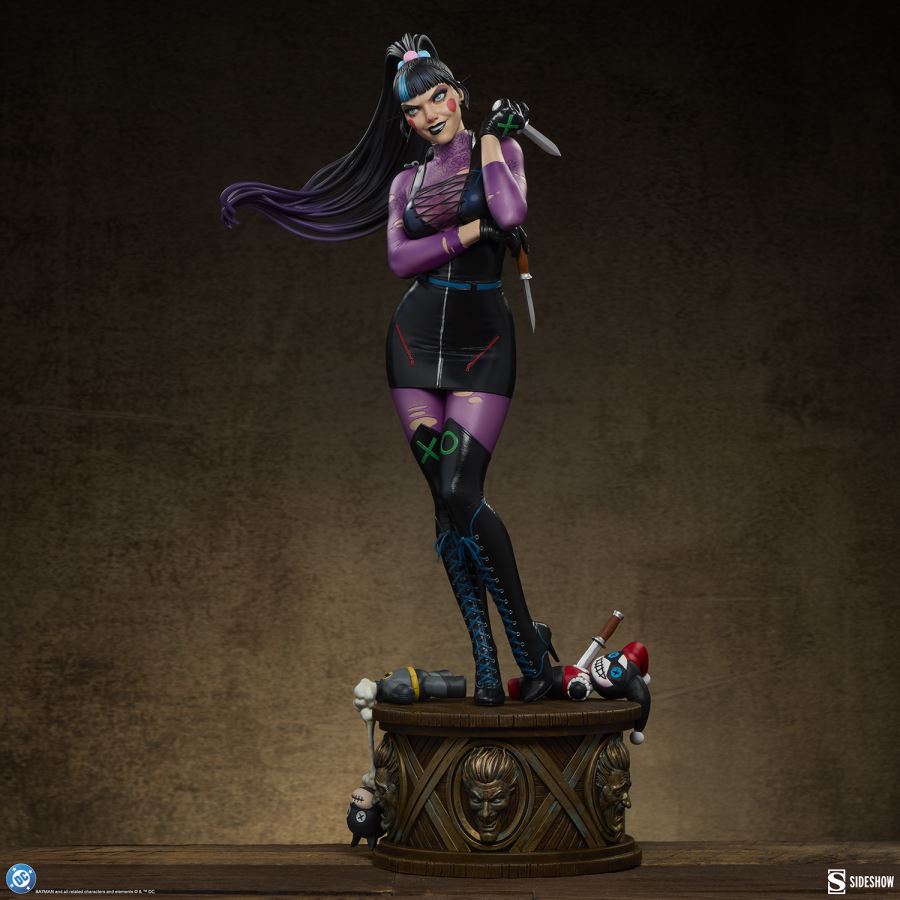 Sideshow and Warner Bros. Discovery Global Consumer Products (WBDGCP) present the Punchline™ Premium Format™ Figure. This officially licensed DC-themed collectible paints a cunning clown groupie in a chaotic, colorful light.It’s a mad world, and she’s the solution. The Punchline Premium Format™ Figure measures 21.75 inches (55.2 centimeters) tall, 11.14 inches (28.2 centimeters) wide, and 8.1 inches (20.5 centimeters) deep as Alexis Kaye carves out a place for herself within the coterie of Gotham City baddies. Both a lover and a hater, she takes her costume and makeup cues from The Joker™ while torturing torn toy versions of Harley Quinn™ and Batman™ — hey, every fangirl needs a hobby.Inspired by the character’s appearance in The Joker War story arc, this fully sculpted comic book collectible depicts Punchline in a ripped purple bodysuit, black dress and corset bodice, knee-high black boots, and a small black cape. She wields her preferred weapon in her right hand while standing upon a circular pedestal resembling wooden baseboard and tarnished brass. The quarter scale DC statue includes two portraits: one neutral and enigmatic, the other devious, revealing the pleasure Punchline derives from her Super-Villain status. Each expression is accompanied by a long, high ponytail streaked by vivid blue.The Exclusive Edition of the Punchline Premium Format™ Figure features a third alternate portrait, which shows Alexis sneering — both proud and pouting, demonstrating how she can alter her personality to manipulate the outcome of any situation. This Sideshow exclusive version has a different right arm configuration with a trick weapon balanced expertly and hidden from view.Radicalize your shelf and bring home the Punchline Premium Format™ Figure by Sideshow today!MaterialsPolystoneProduct SizeHeight: 21.75 (55 cm)Width: 11.14 (28 cm)Depth: 8.1 (21 cm) *