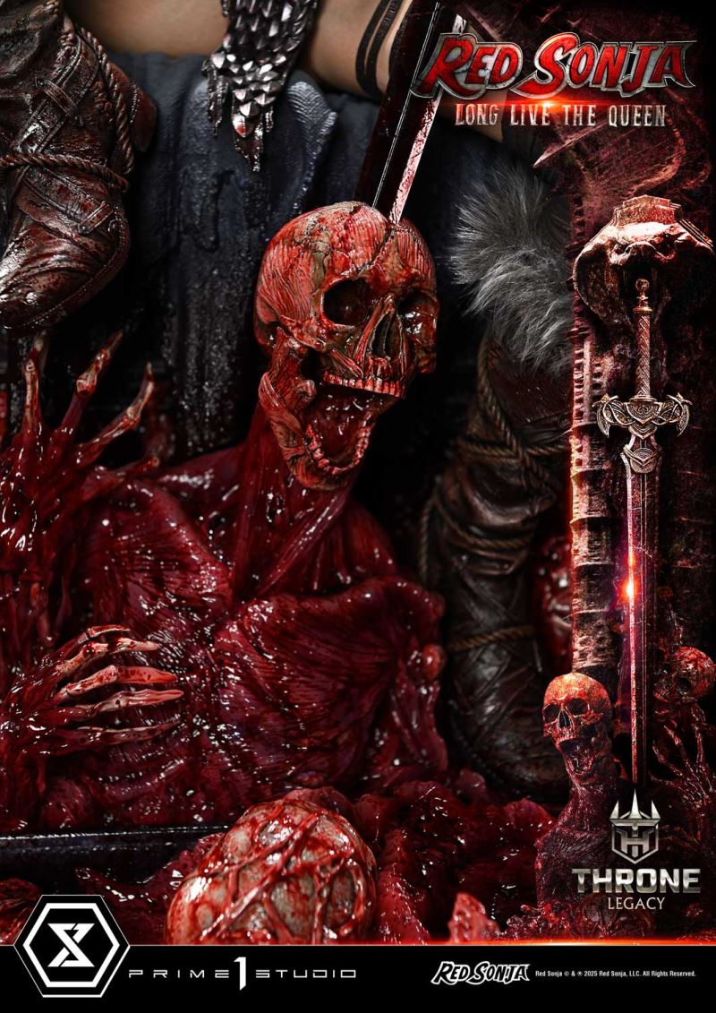 After vanquishing evil, upon the bloodstained throne—the indomitable red-haired queen realized in 1/3 scale.Unyielding will and divine combat prowess—Red Sonja, the character who laid the foundation for female warriors in American comics, joins the Throne Legacy lineup.Created to commemorate the 50th anniversary of the character’s debut, this official artwork by Ian MacDonald inspired the 1/3 scale statue titled Red Sonja: Long Live the Queen. Victorious in a bloody battle on enemy soil, the crimson-haired warrior seizes the throne with a bold pose. Her fierce yet beautiful presence has been fully realized in three dimensions.Her iconic red hair is layered with multiple tones, designed to catch the light and reveal rich shadows. Deep eyes and freckled skin emphasize her humanity. The supple proportions combine finely sculpted muscle with feminine softness. Scale-patterned bikini armor and a greatsword evoke the weight of real metal, while the cloak and boots, finished with faux fur, capture a wild, natural texture. Every element of her gear conveys distinct materiality.The ominous throne is faithfully based on the colors and shapes of the original artwork. At her feet, the dark spawn writhe lifelessly; gothic candelabras burn with wax candles; and a massive serpent rears its head behind her. All elements serve to exalt the rise of a new sovereign.This bonus version includes an exclusive interchangeable right arm holding a long-handled axe. The heavy, engraved blade, stained with dark red blood, further highlights both the queen’s regal bearing and the primal instincts of a warrior.The red-haired warrior enthroned as queen—an essential centerpiece worthy of absolute loyalty in any collection.Specifications:Red Sonja-themed BaseOne (1) Swappable Left Arm (Sword)One (1) Swappable Left Arm (Axe) [BONUS PART]Notice:Prototype samples shown.Product details could be subject to change without further notice.Please note the final product specifications may differ because each product is Handmade.Since the product is still in the development stage, the Size (up to 10%) & Weight (up to 10kg) may be changed during the production stage.Red Sonja © & ® 2025 Red Sonja, LLC. All Rights Reserved.DETAILSBrandsPRIME 1 STATUECollectionThrone LegacySeriesRed SonjaScale1/3 ScaleProduct CodeTLCRS-01SProduct Size Approx.H:77cm W:68cm D:63cmH:90cm W:68cm D:63cm(with Axe)Carton(Est):3 boxProduct Weight Approx.47 kgCarton Size Approx.Carton A [ H 67.5cm × W 75.5cm × D 44cm ]Carton B [ H 80.5cm × W 73cm × D 36cm ]Carton C [ H 44cm × W 91cm × D 42.5cm ]MaterialsPolystone and other materialsJAN4582647122773