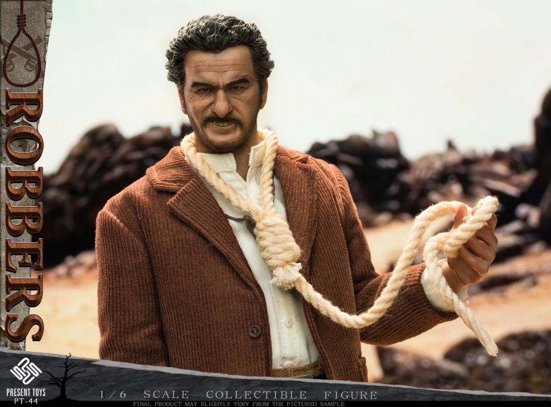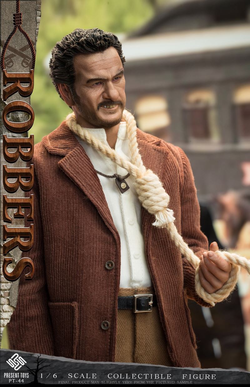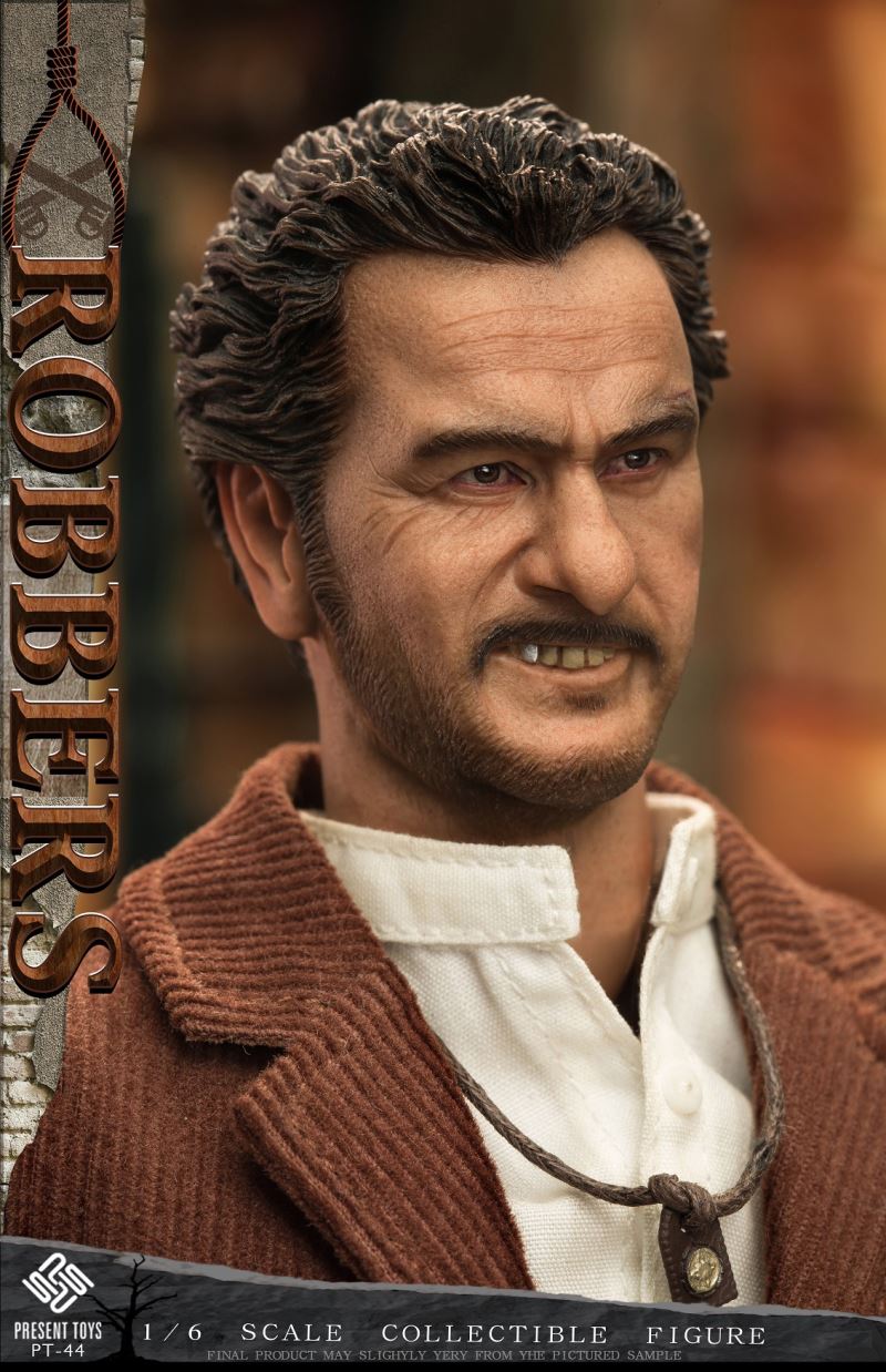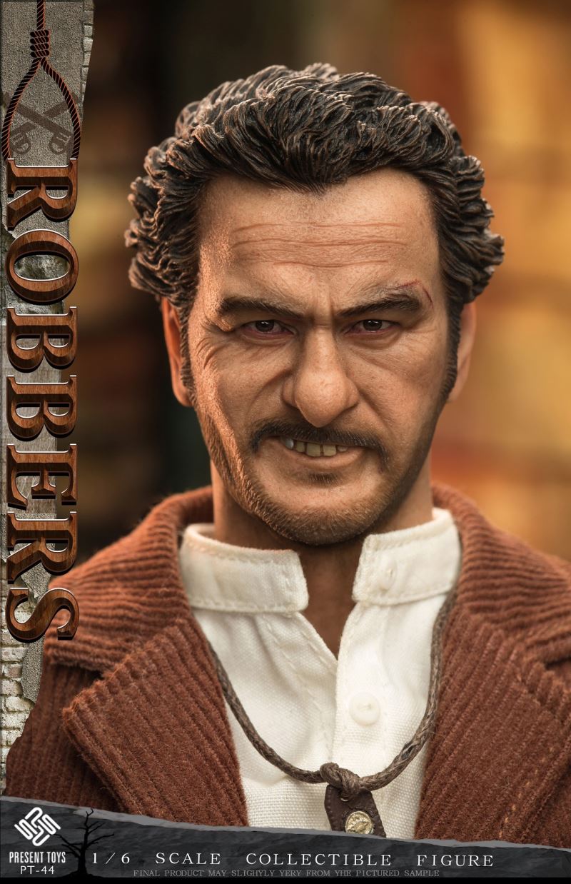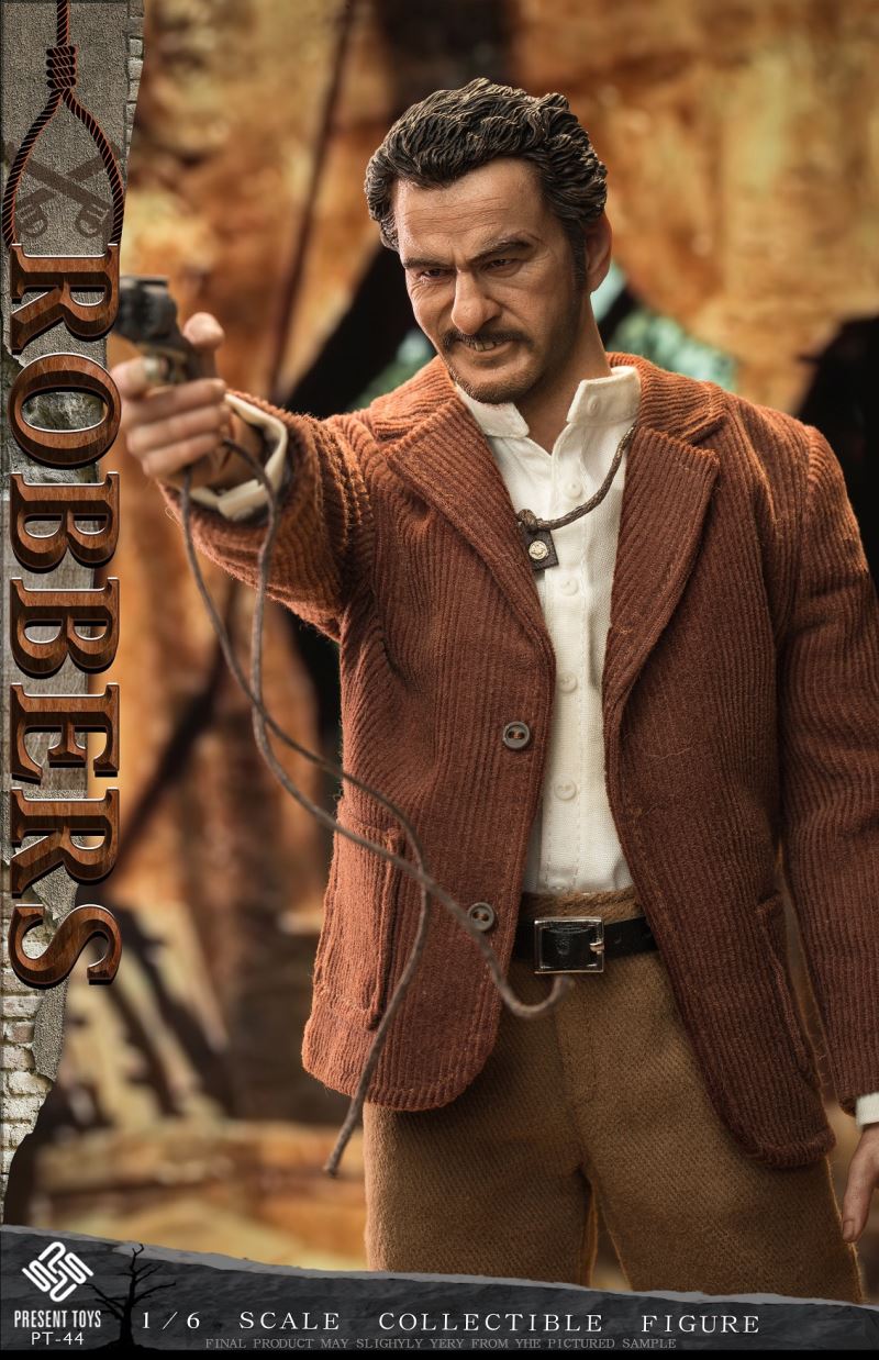 PRESENT TOYS New Product: 1:6 collectible toy –RobberProduct Specs:Name: RobberProduct Number: PT-sp44Scale: 1/6Product List:Head sculpture *2Articulated body*1Hand*6Pipe* 1Carbinerifle *1Revolver*1Moneybag * 1Detonator* 1Rope*1Necklace*1Exclusiveplatform*1Costume:Shirt * 1Coat * 1Pants * 1Belt * 1Boots * 2Estimate release date 2023 1st-2nd quarter(subject to the actual delivery time of themanufacturer.)
