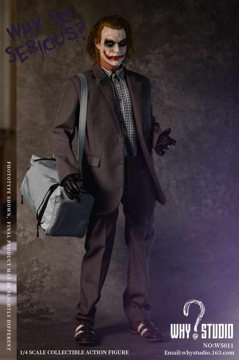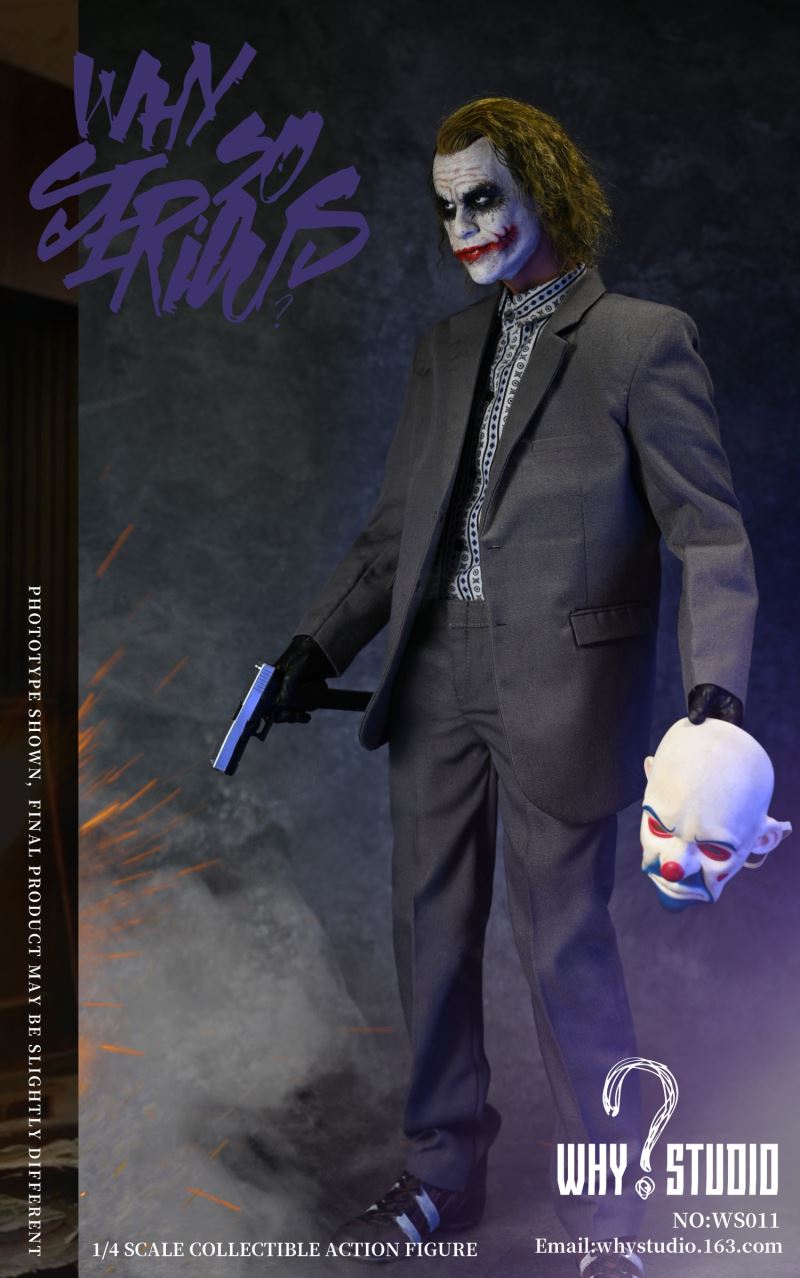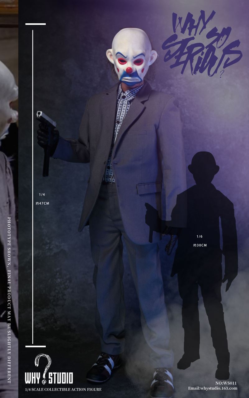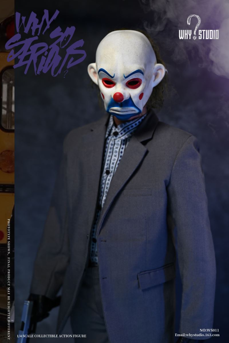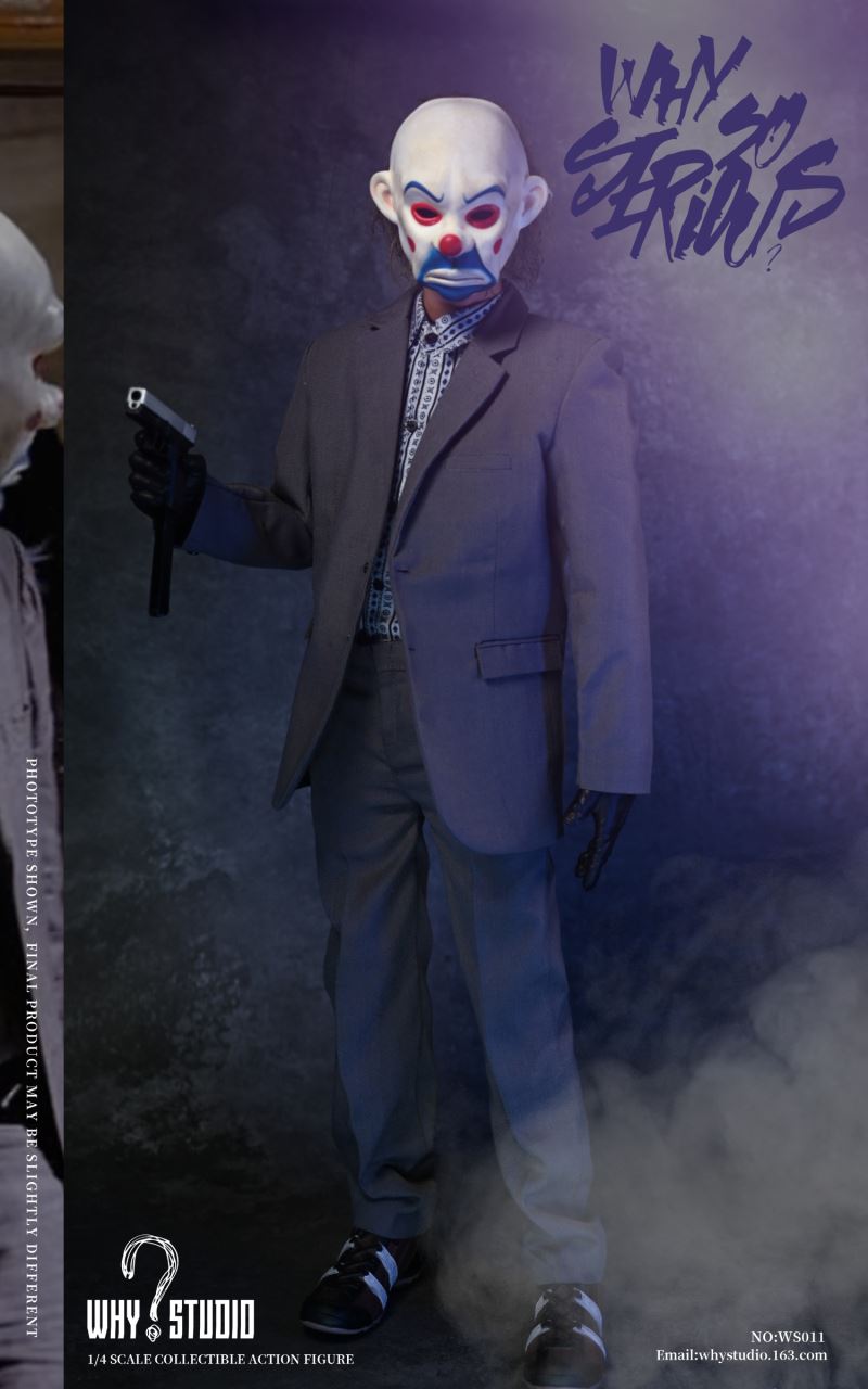 WHY STUDIO New Product 1/4 NO: WS011 Bandit joker action figureLimit: 100 setsMaterial: alloy, plastic, clothList of accessories:Hair transplant carving * 11/4 body action model * 11/4 hand model * 5Floral shirt * 1Suit pants * 1Suit top * 1Blue messenger bag * 1joker mask * 1Shoes * 2Pistol * 1Submachine gun * 1Shotgun * 1Hand grenade * 11Torpedo rack * 1USD * 6