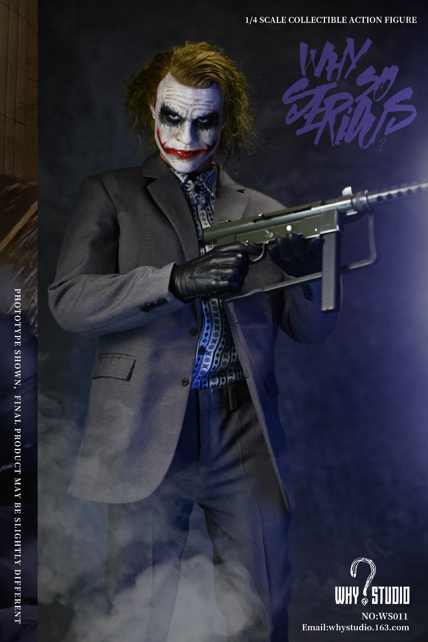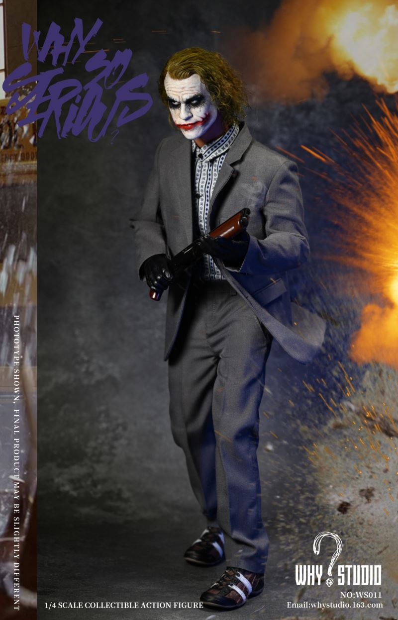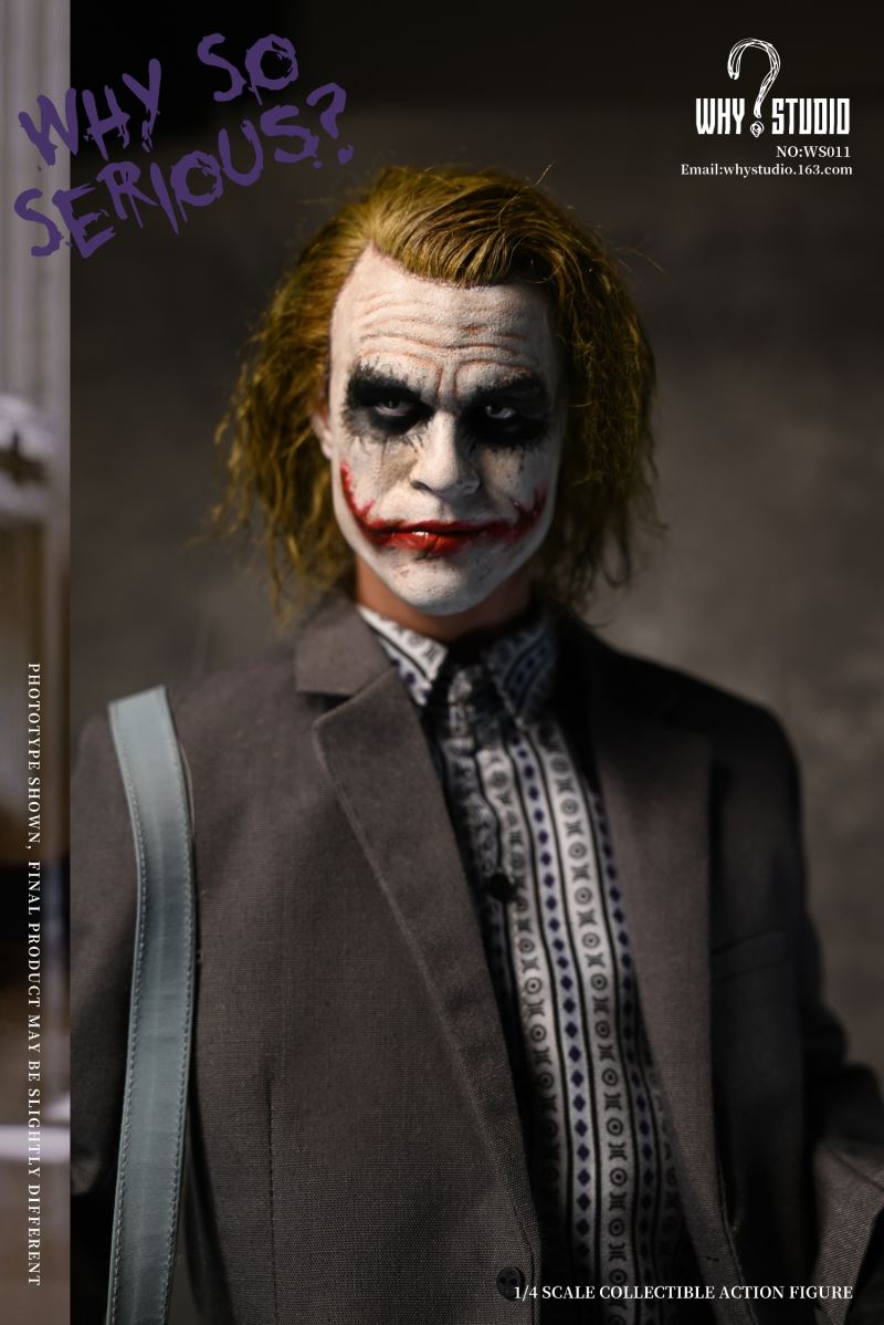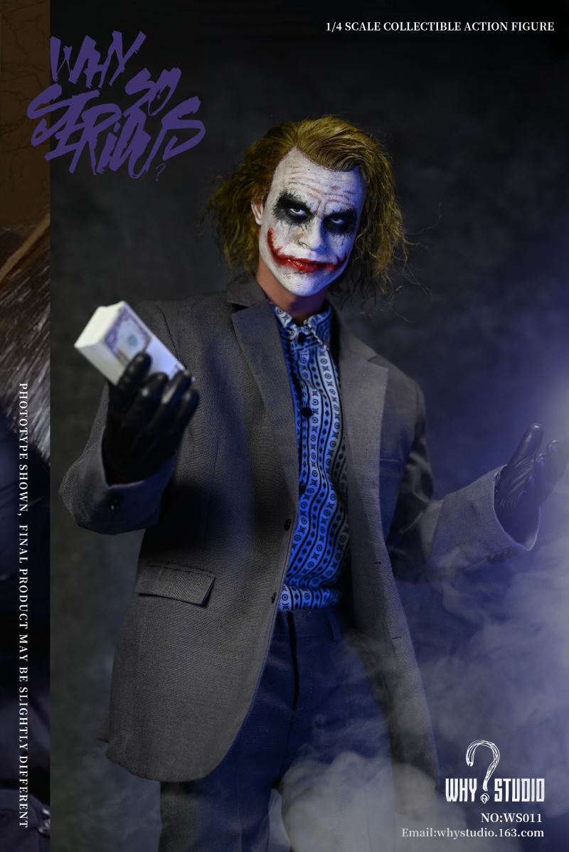WHY STUDIO New Product 1/4 NO: WS011 Bandit joker action figureLimit: 100 setsMaterial: alloy, plastic, clothList of accessories:Hair transplant carving * 11/4 body action model * 11/4 hand model * 5Floral shirt * 1Suit pants * 1Suit top * 1Blue messenger bag * 1joker mask * 1Shoes * 2Pistol * 1Submachine gun * 1Shotgun * 1Hand grenade * 11Torpedo rack * 1USD * 6