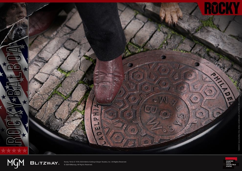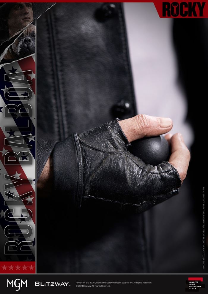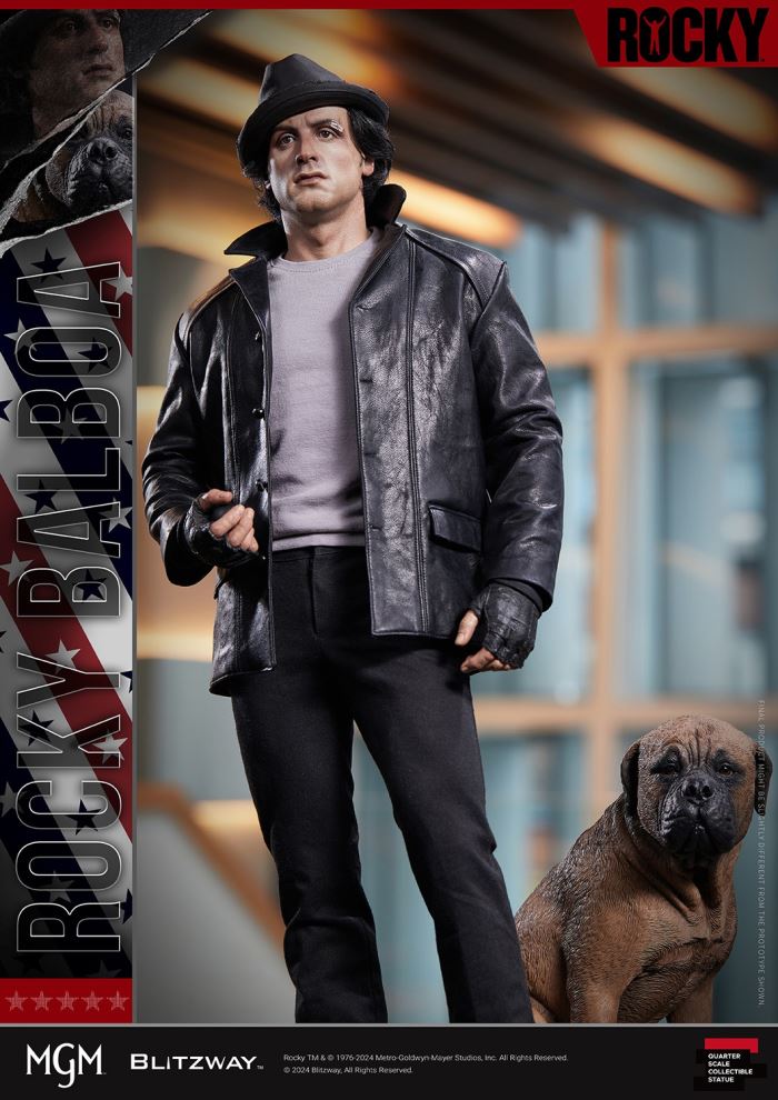 We are pleased to introduce Rocky Balboa and his loyal training partnerButkus, the protagonists of the 1976 film Rocky.This film shows us the passion and perseverance to pursue your dreams and illustrates what can be achieved by doing so. We bring the impressive touchingscenes back to life in real life.This product not only includes a jacket made of genuine leather, but also contains various details that reflect Rocky Balboa's unique masculinity: such ashair details expressed in the form of hair transplants, and scars on his eyebrows.What we have prepared for you is Rocky, who embodies his passion through unremitting training and competition on the road to chasing his dreams, andButkus These will be a great experience for fans of the movie 'Rocky' Once again it brought extraordinary touching.1. Product detailsProduct size (mm*) W 300 x D 305 x H 543 (Including base)Product weight* 10kg (Including product only)13.5kg (Including packaging)Transport box size (mm*) W 438 x D 654 x H 388 (1pc / 1 carton)*Actual dimensions and weight may vary.2. MaterialsHead ResinHair Wool (hair transplant)Body Polystone, Resinbase & accessories PolystoneClothing Fabric, Real LeatherPackaging Carton + Styrofoam3. Shipping informationProduct name Rocky 1976Authorized party MGMProduced by BLITZWAYProduct number BW-SS-22101Product Line Superb Scale StatueProduct Type 1/4 Scale StatueEstimated Shipment 2024.4QPrice $649UPC (JAN Code) 88093214722355. Product Details– Sculpture height is approximately 21.4 inches [W 300 mm x D 305 mm x H 543 mm ( Includes base)]– Sculpture that highly replicates Sylvester Stallone’s appearance– Carefully tailored costume– Rocky 1 style base– One (1) head (comes with top hat)– One (1) right hand ( Holding Rubber Ball)- One (1) Left Hand (Regular Hand)- One (1) Butkus (Puppy)- One (1) Nameplate6. IMPORTANT NOTICE- Product details are subject to change without notice.- The final product is subject to change.7. Production Team- Director: Sungwoong Bae, HyuckChul Kwon- Planning: Won Choi- Executive Director: HyuckChul Kwon- Marketing: Won Choi, Inae Kang, SangWook Park- Art Director: KA Kim- Art Consultant: Deacon- Head Sculpture : KA Kim- Head sculpting assistant: Hajeong Lee- Head painting: KA Kim- Head hair transplant: Hajeong Lee- Body sculpting: Ban_C- Bucus sculpture: Dari_J- Three-dimensional base: Deacon, Inho Hwang- Accessory sculpture: Inho Hwang, Dari_J- Costume tailoring: Ara Kim- Painting: Hanshol Yu, O_deng, Dari_J- Art support: Eo Jin, Hahyeon Park, Yongjun Jung- External management: Jueun Lee- Modeling: BLITZWAY Casting Team- Concept design: BLITZWAY Design Team- Product Photography: BLITZWAY Photography Team- Photography Editor: BLITZWAY Design Team- Packaging Design: BLITZWAY Design TeamThe BLITZWAY Design & Development TeamManufactured by BLITZWAY(C) 2024 Blitzway. All Rights Reserved.