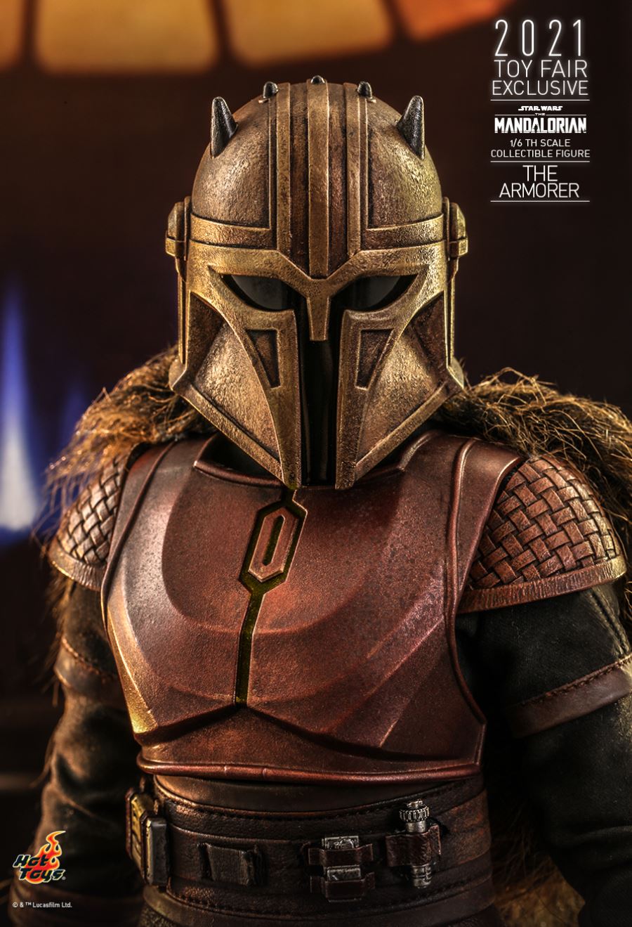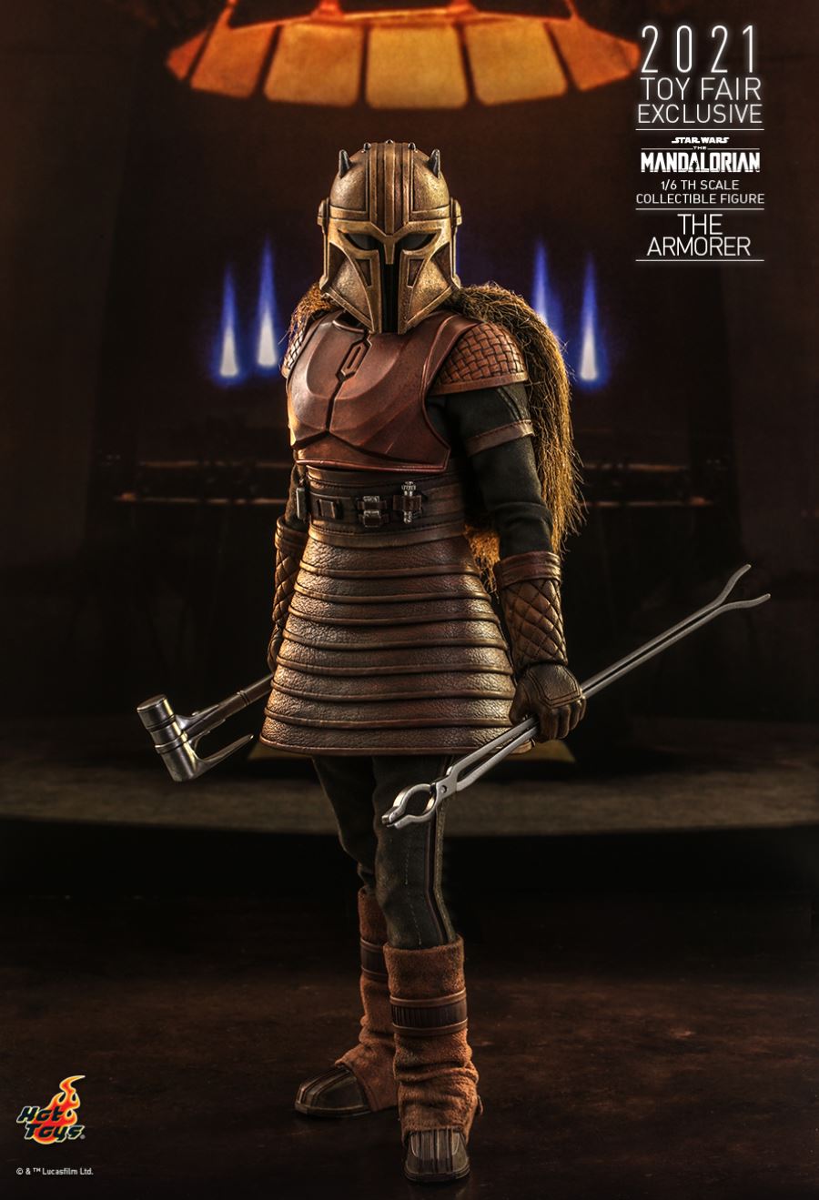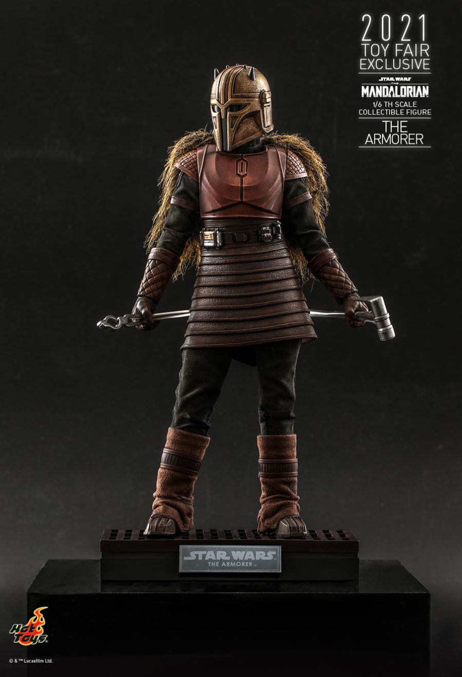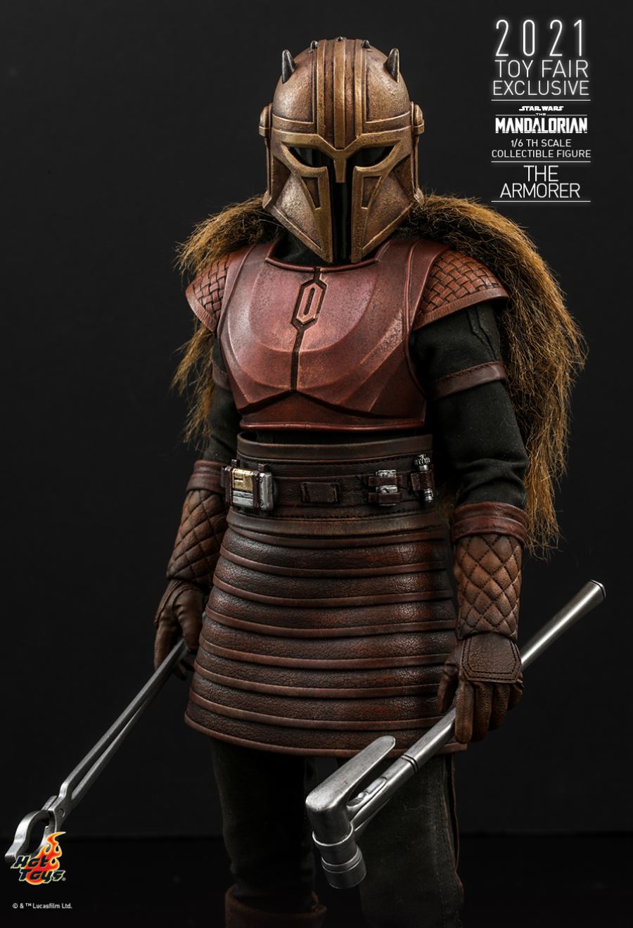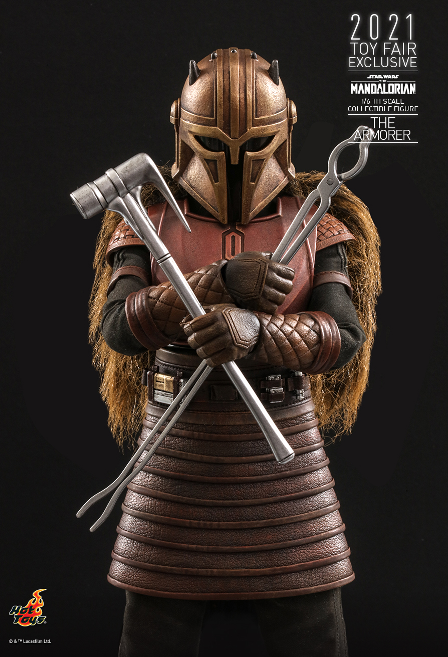 STAR WARS: THE MANDALORIAN™THE ARMORER™1/6TH SCALE COLLECTIBLE FIGURE“When one chooses to walk the way of the Mandalore, you are both hunter and prey.”The Armorer plays a vital role in keeping the culture of the Mandalorians alive. She forges beskar armor in the ancient tradition of her people. Star Wars fans were captivated by her character and story.Today, in the further continuation of The Mandalorian collectible series, Hot Toys is thrilled to present the 1/6th scale collectible figure of The Armorer as a Hot Toys 2021 Toy Fair Exclusive item!The collectible figure features a finely crafted helmet and armor pieces, meticulously tailored outfit with faux-fur coat, a selection of tools, a display stand, and a themed backdrop!Seek The Armorer now for your Star Wars: The Mandalorian collection!SPECIFICATIONSPRODUCT CODETMS044PRODUCT NAMETHE ARMORER™HEIGHTAPPROXIMATELY 29 CM TALLPOINTS OF ARTICULATIONS0SPECIAL FEATURESNEWLY CRAFTED GOLDEN BRONZE COLORED THE ARMORER HELMET AND BRONZE COLORED BODY ARMOR WITH SPECIALLY APPLIED DISTRESS EFFECTSARTISTSHEAD SCULPTED BY N/AHEAD PAINTED BY N/AHEAD ART DIRECTED BY N/AThe 1/6th scale The Armorer™ Collectible Figure special features:- Authentic and detailed likeness of The Armorer in Star Wars: The Mandalorian- Newly crafted golden bronze colored The Armorer helmet and bronze colored body armor with specially applied distress effects- Body with over 26 points of articulations- Approximately 29 cm tall- Six (6) pieces of interchangeable gloved hands including:- One (1) pair of fists- One (1) pair of accessories holding hands- One (1) Beskar holding left hand- One (1) gesture left handCostume:- One (1) brown colored fur collar- One (1) finely crafted The Armorer armor in bronze color with weathering effects- One (1) dark green-colored shirt- One (1) pair of dark brown colored gauntlets- One (1) dark brown colored utility belt with accessories- One (1) dark brown colored Kilt- One (1) pair of dark green-colored pants- One (1) pair of armored boots with weathering effectsAccessories:- One (1) battle damaged Mandalorian chest armor- One (1) piece of Beskar- One (1) pair of tongs- One (1) hammer- One (1) ladle- One (1) welder- One (1) covent themed backdrop- Figure stand with Star Wars logo and character nameplateRelease date: Approximately Q3 – Q4, 2021*Prototype shown, final product may be slightly different**Product details are subject to change without further notice© & TM Lucasfilm Ltd.© 2021 Hot Toys Limited. All Rights Reserved.
