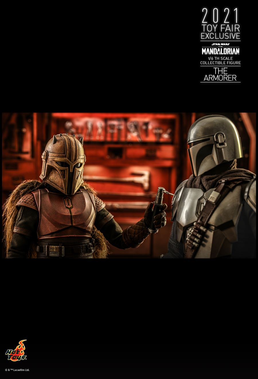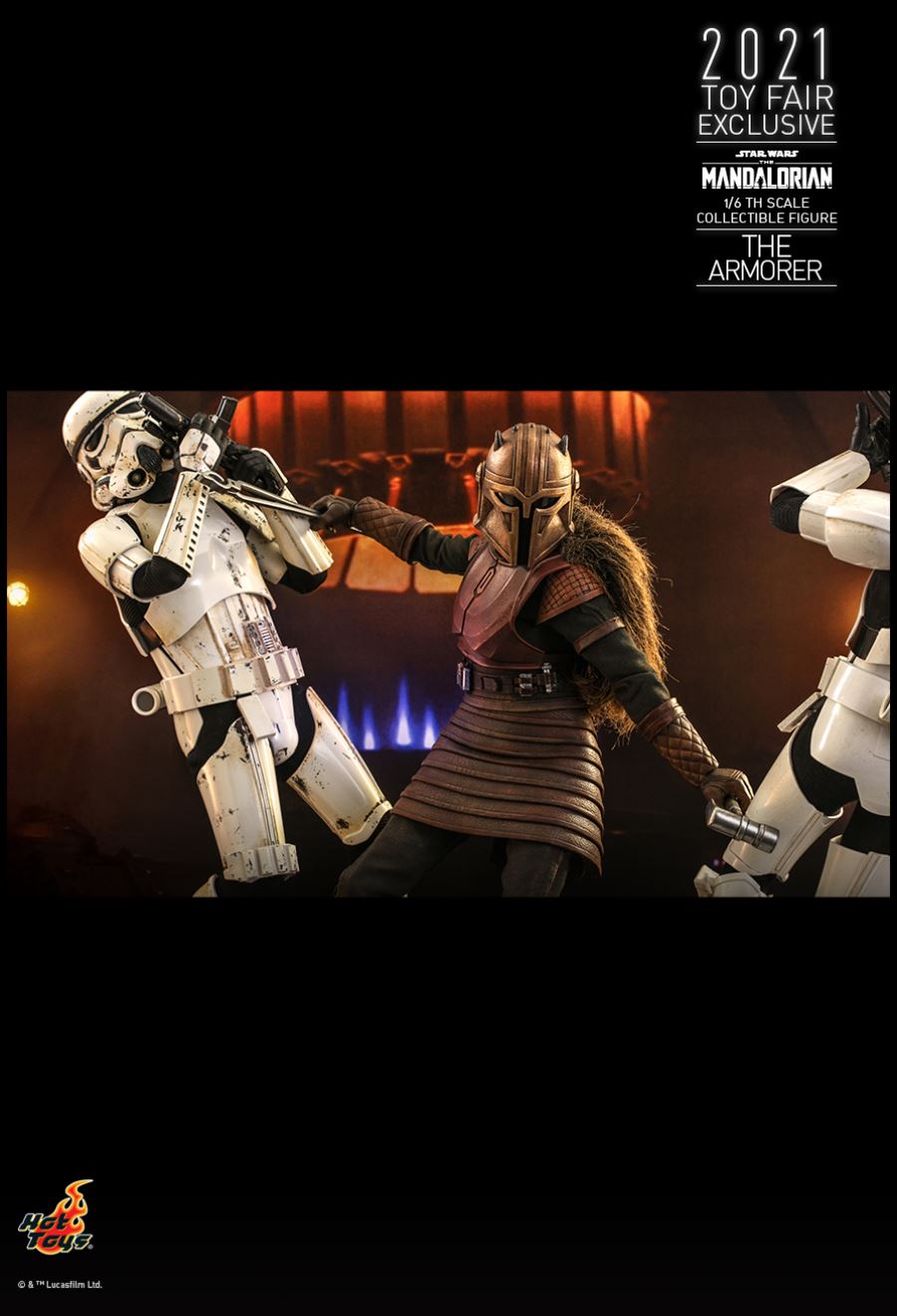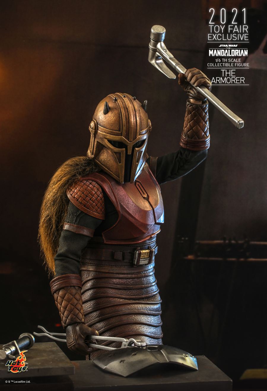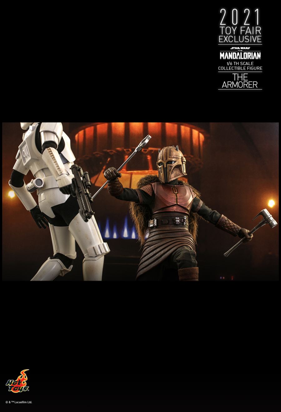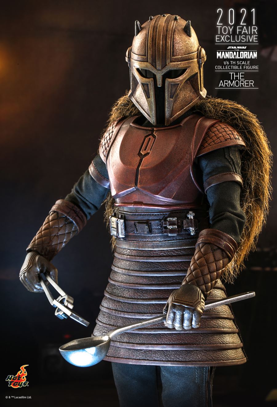 STAR WARS: THE MANDALORIAN™THE ARMORER™1/6TH SCALE COLLECTIBLE FIGURE“When one chooses to walk the way of the Mandalore, you are both hunter and prey.”The Armorer plays a vital role in keeping the culture of the Mandalorians alive. She forges beskar armor in the ancient tradition of her people. Star Wars fans were captivated by her character and story.Today, in the further continuation of The Mandalorian collectible series, Hot Toys is thrilled to present the 1/6th scale collectible figure of The Armorer as a Hot Toys 2021 Toy Fair Exclusive item!The collectible figure features a finely crafted helmet and armor pieces, meticulously tailored outfit with faux-fur coat, a selection of tools, a display stand, and a themed backdrop!Seek The Armorer now for your Star Wars: The Mandalorian collection!SPECIFICATIONSPRODUCT CODETMS044PRODUCT NAMETHE ARMORER™HEIGHTAPPROXIMATELY 29 CM TALLPOINTS OF ARTICULATIONS0SPECIAL FEATURESNEWLY CRAFTED GOLDEN BRONZE COLORED THE ARMORER HELMET AND BRONZE COLORED BODY ARMOR WITH SPECIALLY APPLIED DISTRESS EFFECTSARTISTSHEAD SCULPTED BY N/AHEAD PAINTED BY N/AHEAD ART DIRECTED BY N/AThe 1/6th scale The Armorer™ Collectible Figure special features:- Authentic and detailed likeness of The Armorer in Star Wars: The Mandalorian- Newly crafted golden bronze colored The Armorer helmet and bronze colored body armor with specially applied distress effects- Body with over 26 points of articulations- Approximately 29 cm tall- Six (6) pieces of interchangeable gloved hands including:- One (1) pair of fists- One (1) pair of accessories holding hands- One (1) Beskar holding left hand- One (1) gesture left handCostume:- One (1) brown colored fur collar- One (1) finely crafted The Armorer armor in bronze color with weathering effects- One (1) dark green-colored shirt- One (1) pair of dark brown colored gauntlets- One (1) dark brown colored utility belt with accessories- One (1) dark brown colored Kilt- One (1) pair of dark green-colored pants- One (1) pair of armored boots with weathering effectsAccessories:- One (1) battle damaged Mandalorian chest armor- One (1) piece of Beskar- One (1) pair of tongs- One (1) hammer- One (1) ladle- One (1) welder- One (1) covent themed backdrop- Figure stand with Star Wars logo and character nameplateRelease date: Approximately Q3 – Q4, 2021*Prototype shown, final product may be slightly different**Product details are subject to change without further notice© & TM Lucasfilm Ltd.© 2021 Hot Toys Limited. All Rights Reserved.