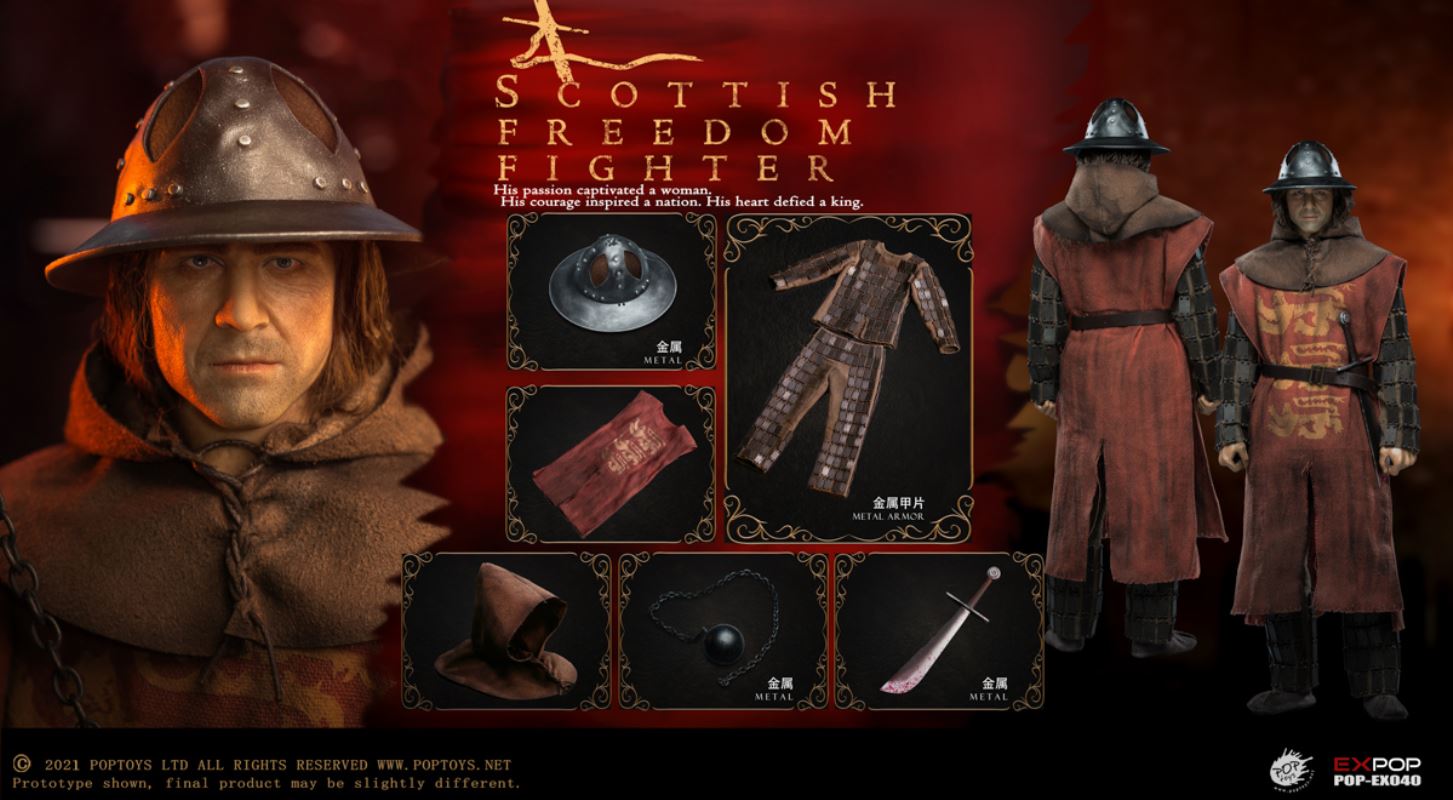 POPTOYS EX038 Scottish Freedom Fighter Standard versionList:Head with woolen hair*1Body*1Normal arm*1 pairHold arm*1 pairUpper coat*1Scottish kilt*1Full armor*1Belt*1Sword harness*1Arm guard*1Sword of liberty*1Hammer*1Wooden shield*1Ankle cloth*2Boots*1 pairFigure stand*1==========================POPTOYS EX039 Scottish Freedom Fighter Bloody battle versionList:Painting head with woolen hair*1Body*1Normal arm*1 pairHold arm*1 pairUpper coat*1Scottish kilt*1Full armor*1Belt*1Sword harness*1Arm guard*1Sword of liberty*1Hammer*1Wooden shield*1Ankle cloth*2Boots*1 pairFigure stand*1==========================POPTOYS EX040 Scottish Freedom Fighter Stalk versionList:Head with woolen hair*1Body*1Normal hand*1 pairHold hand*1 pairCap lining*1Upper body armor*1Lower-body armor*1Robe*1Wide belt*1Helmet*1Machete*1Chain-hammer*1Boots*1 pairFigure stand*1
